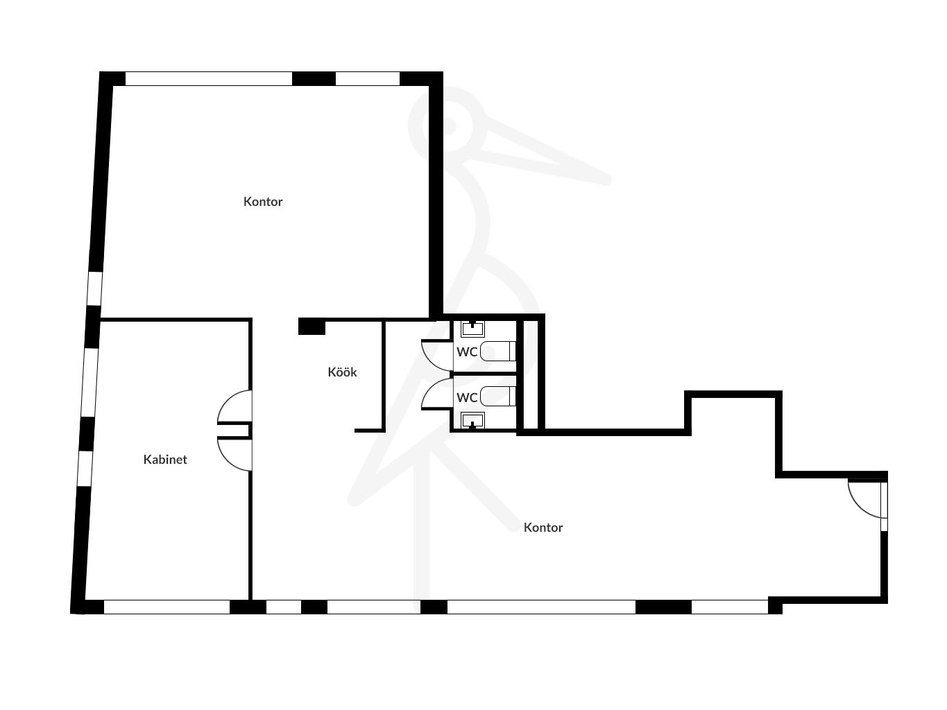 The 137.3 m² office space is located on the 2nd floor and spans through the building, offering plenty of natural light as well as private work areas. At the entrance, there is a representative reception area, along with a kitchenette, two restrooms, and three separate offices or meeting rooms. The layout supports both client-facing work and team-oriented solutions.
