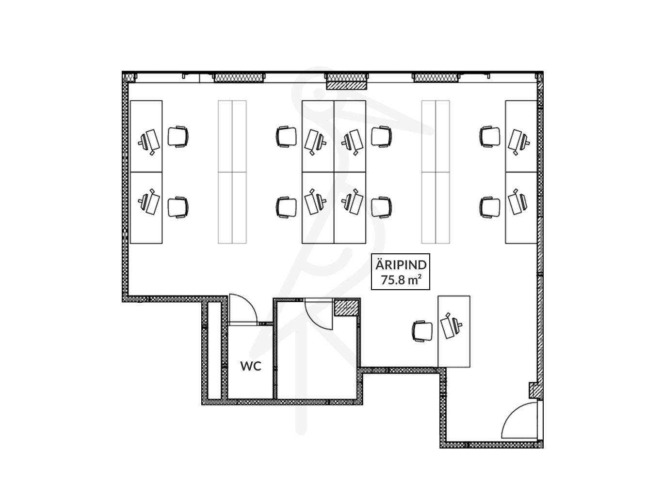 The 75.5 m² office space is located on the 4th floor and features a bright, open-plan layout. It is one large open workspace, allowing the creation of a flexible working environment tailored to the company’s needs. The entrance area is suitable for a reception or work zone. The premises include a separate kitchenette and WC. The layout is ideal for teamwork or back-office operations.