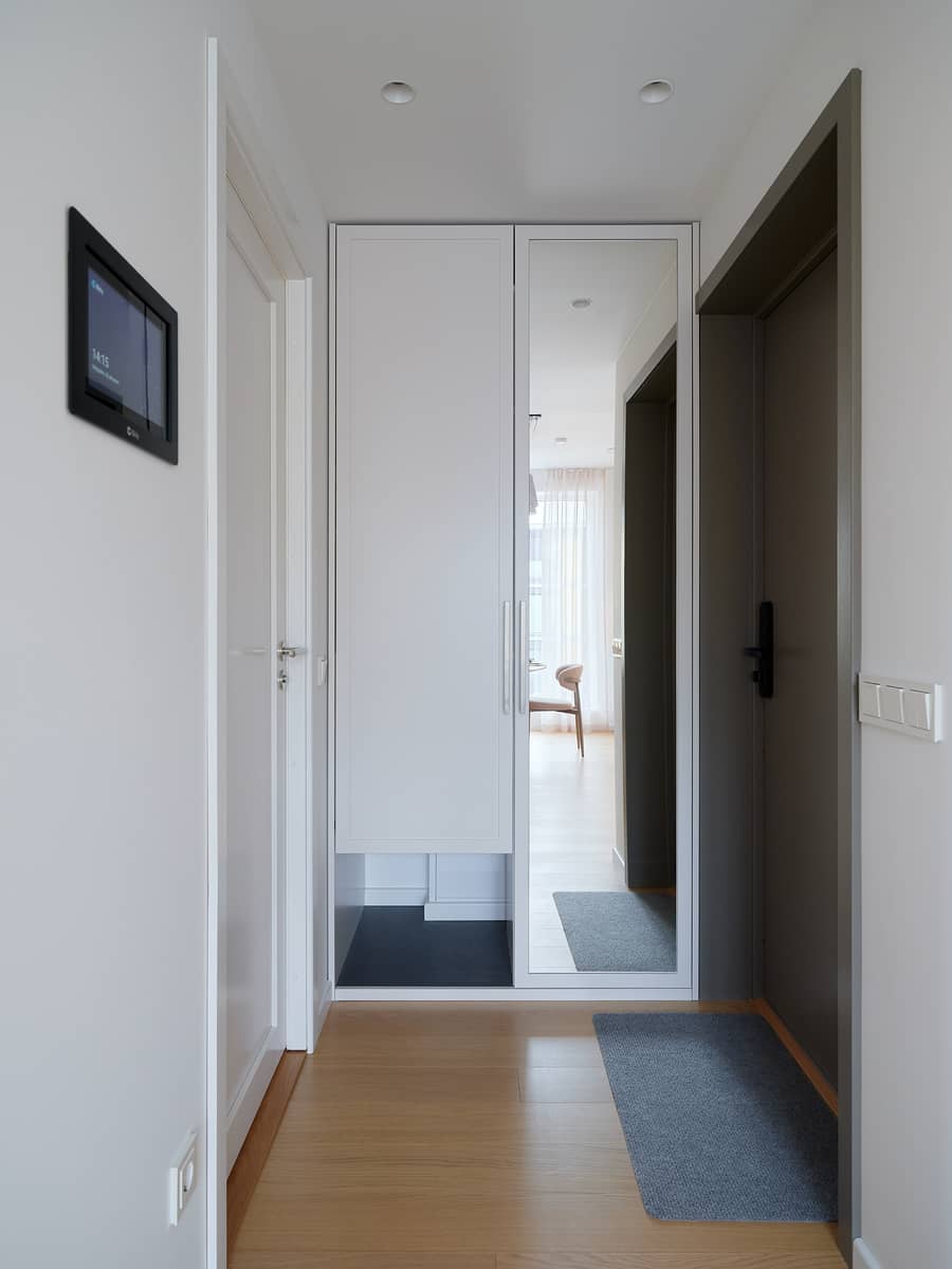 The building features an elevator and intercom system. The stairwell is spacious, clean, and stylishly designed. Apartment access is secured with a code lock.