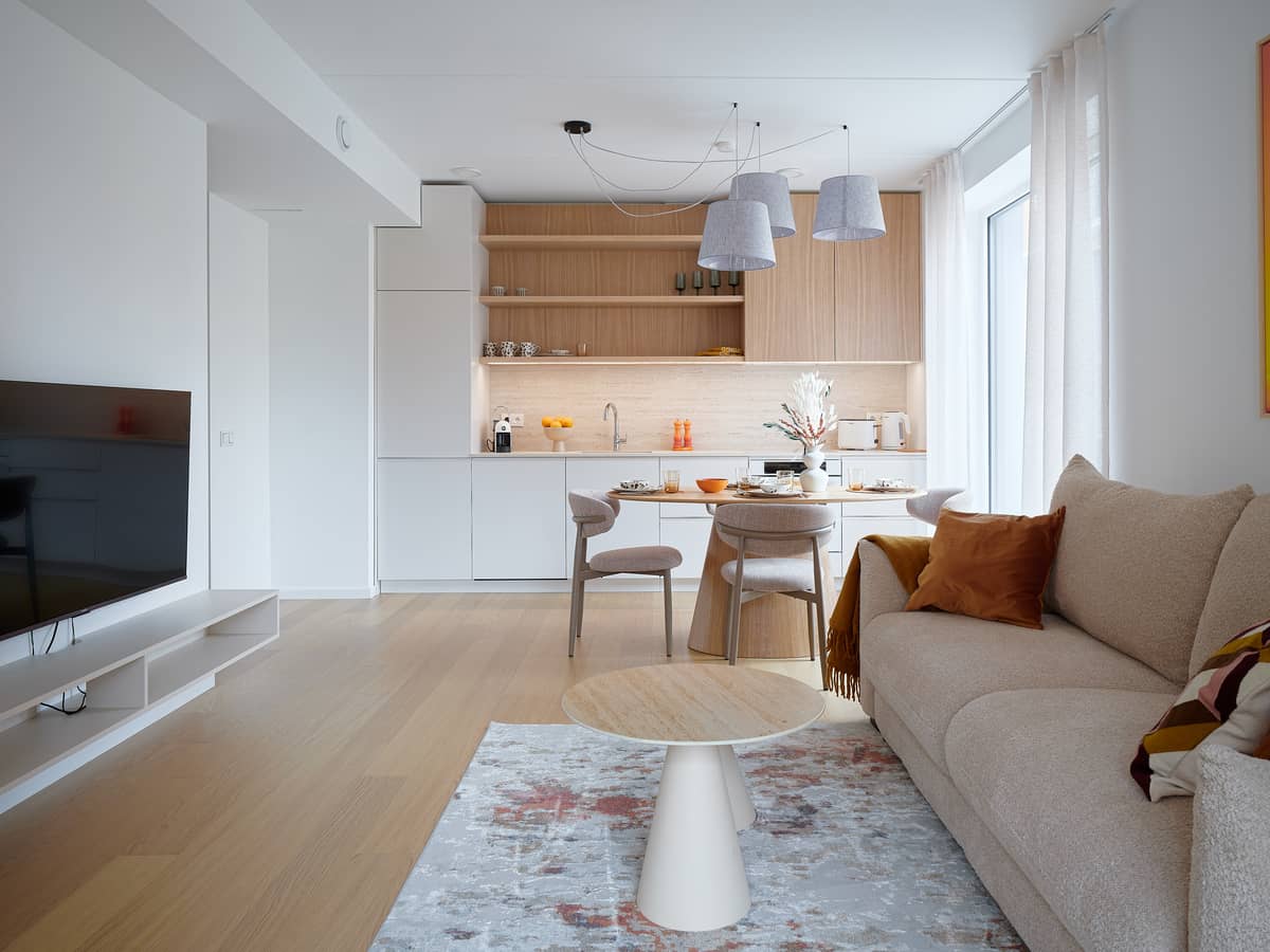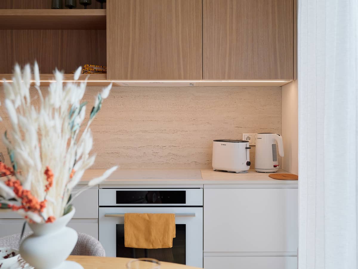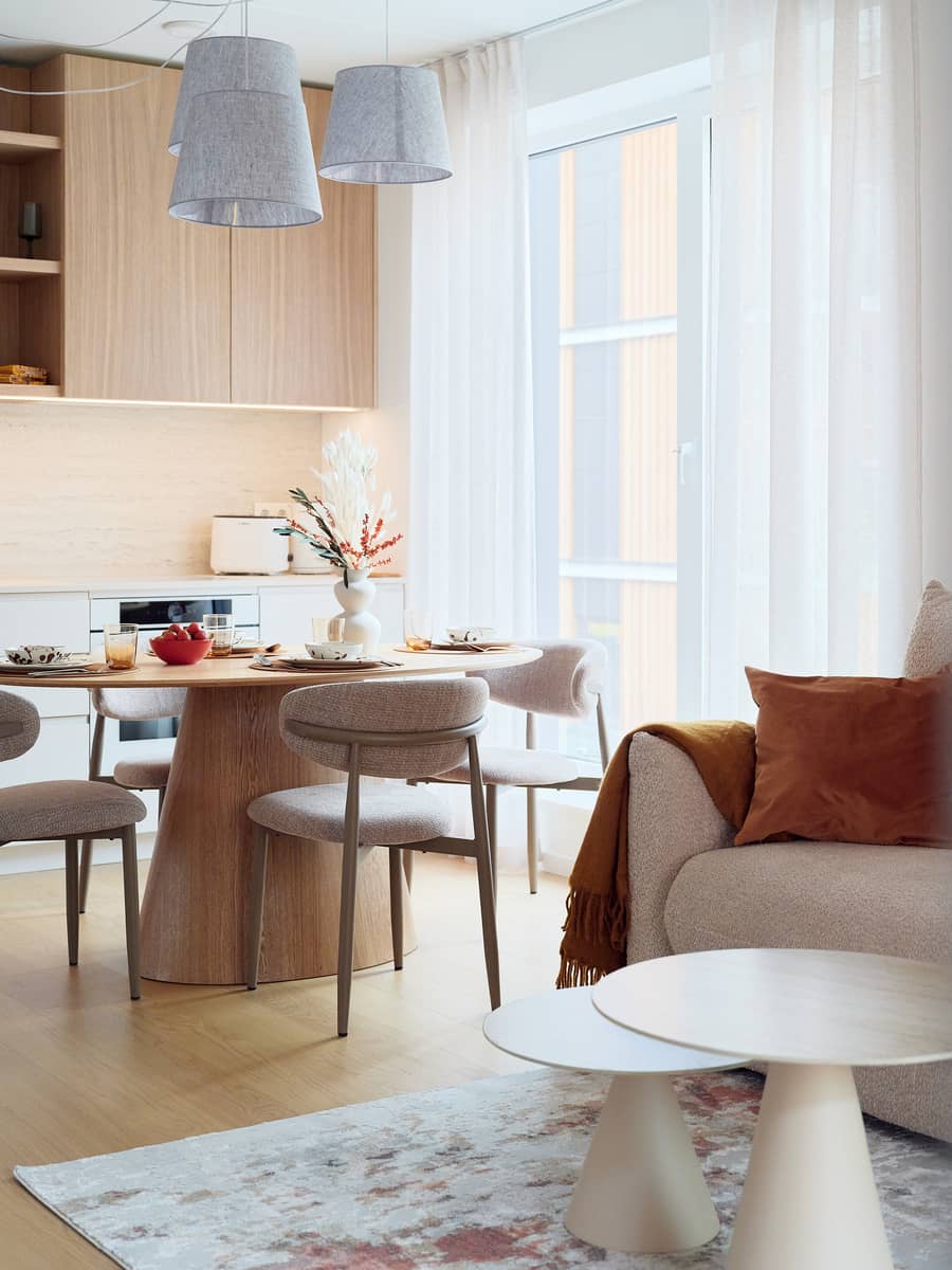 The apartment’s interior design was created by interior architect Lilia Kristianson, resulting in a timeless, elegant, and functional living space where every detail has been carefully considered.