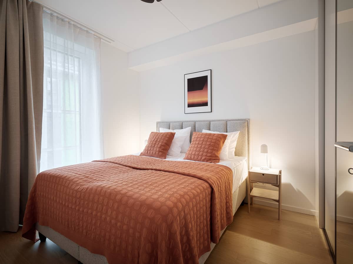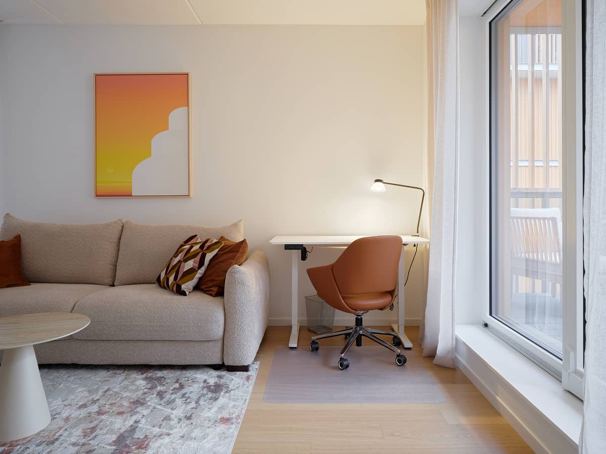 The high-quality and functional kitchen is fitted with Electrolux appliances of timeless design and excellent performance, including a stove and oven, extractor hood, dishwasher, and refrigerator with freezer. A kettle, toaster, and additional kitchen accessories are also available for the tenant’s use.