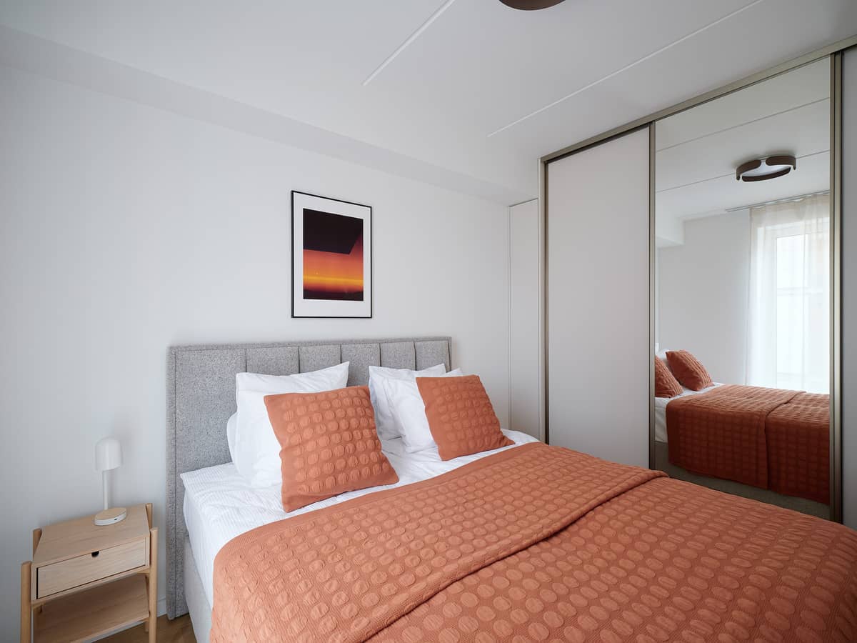 The bedroom features a 160×200 cm bed with duvets and pillows, as well as a spacious built-in wardrobe.