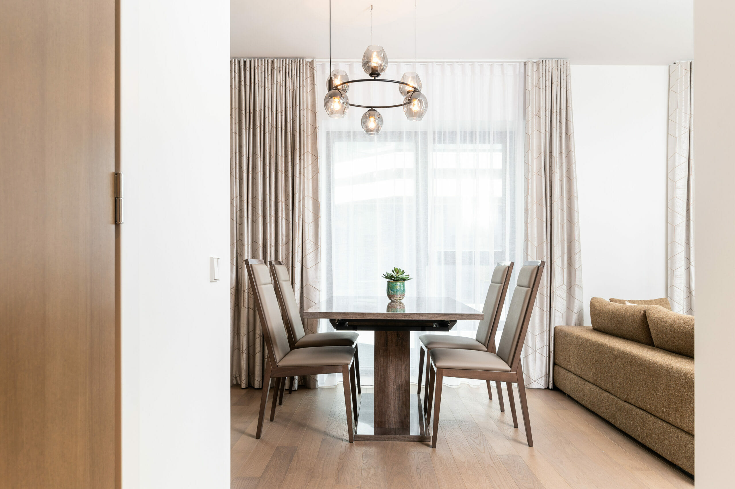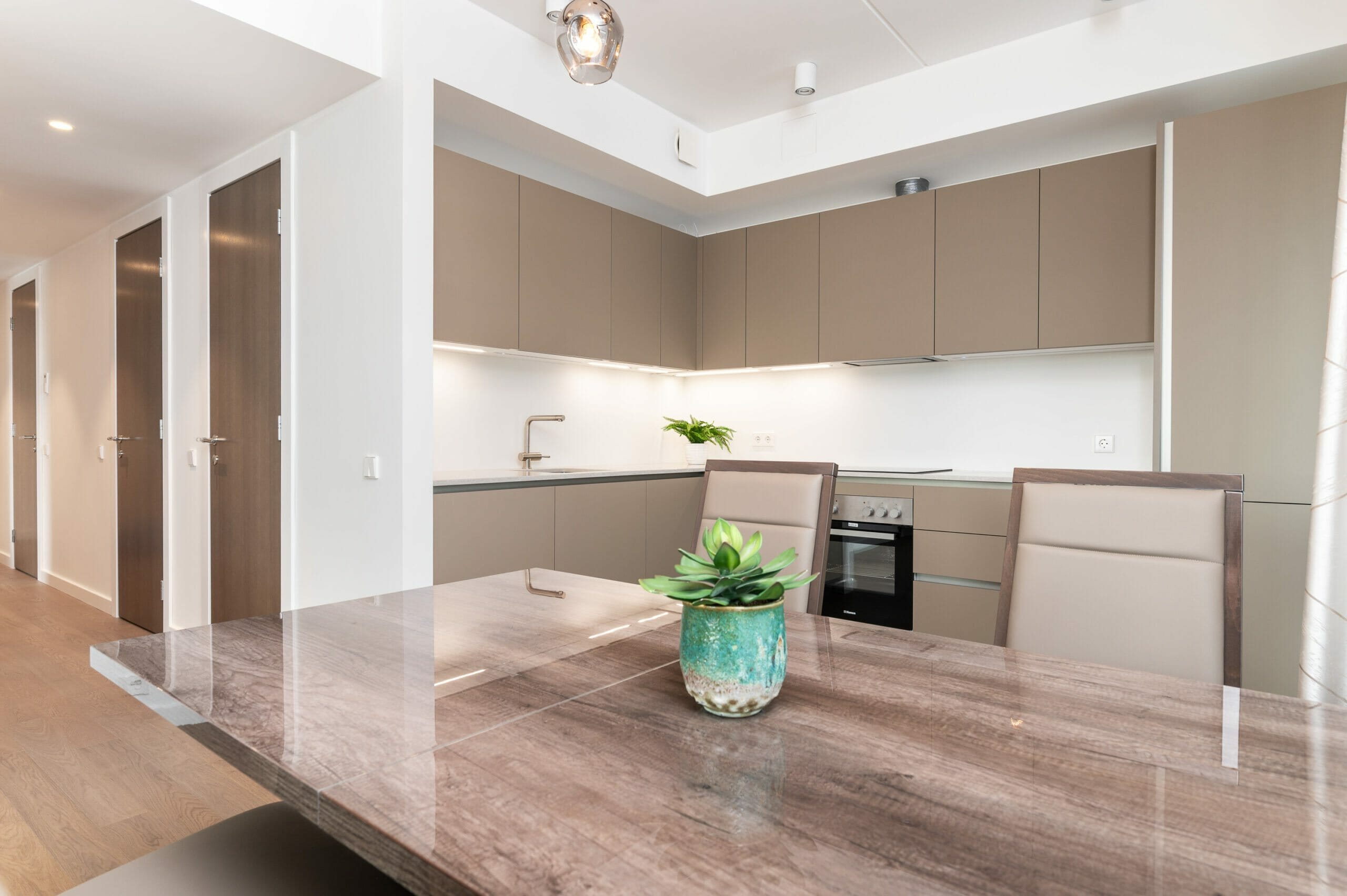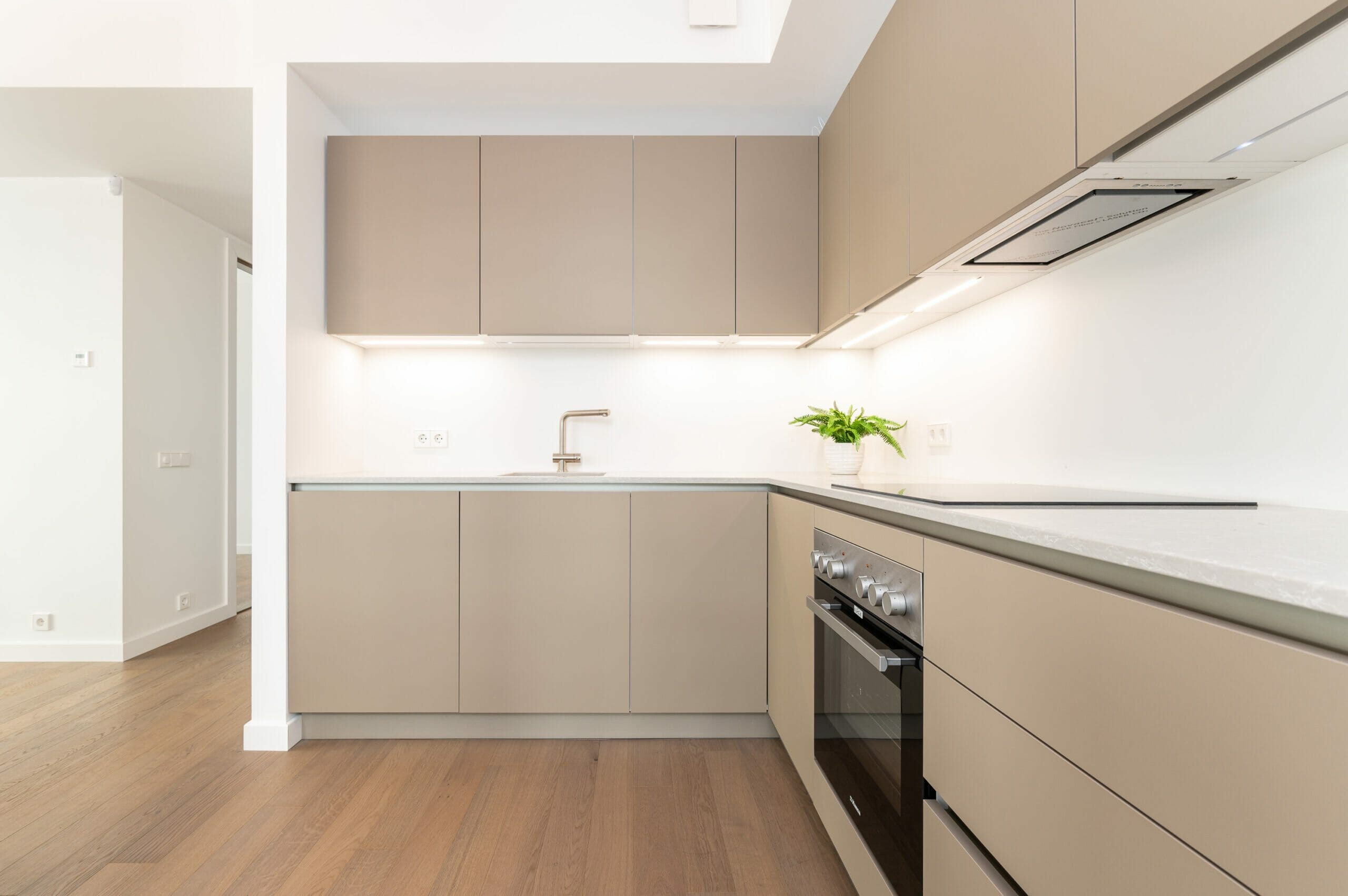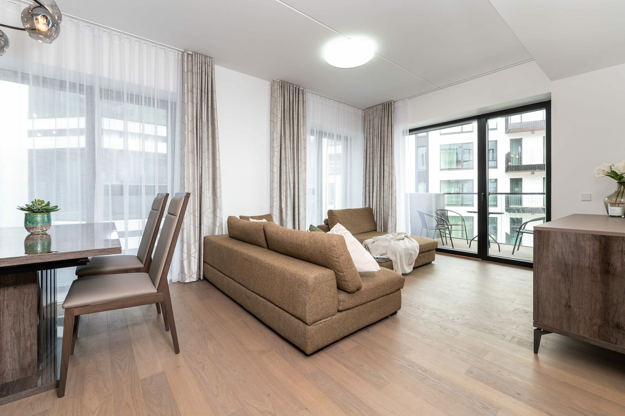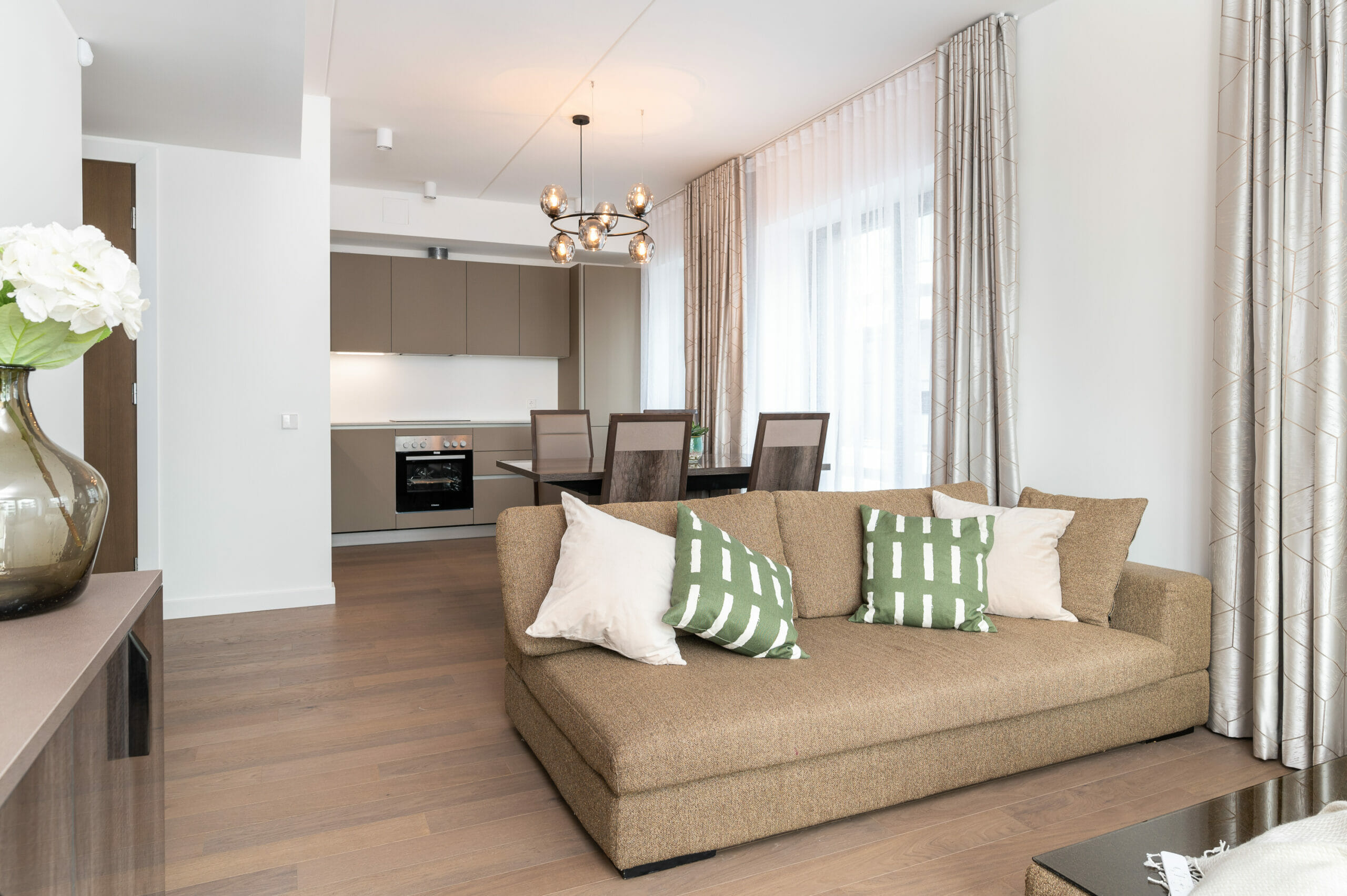The apartment has the necessary living equipment, lighting and appliances. Additional furniture can be added to the apartment. Hansa and Electrolux household appliances with the highest quality and excellent and timeless design are integrated into the high-quality and functional kitchen furniture: ceramic hob and food oven, extractor hood, dishwasher and refrigerator with freezer. Custom-made wardrobes are integrated in the bedroom and hallway. There is also a washer-dryer in the apartment.