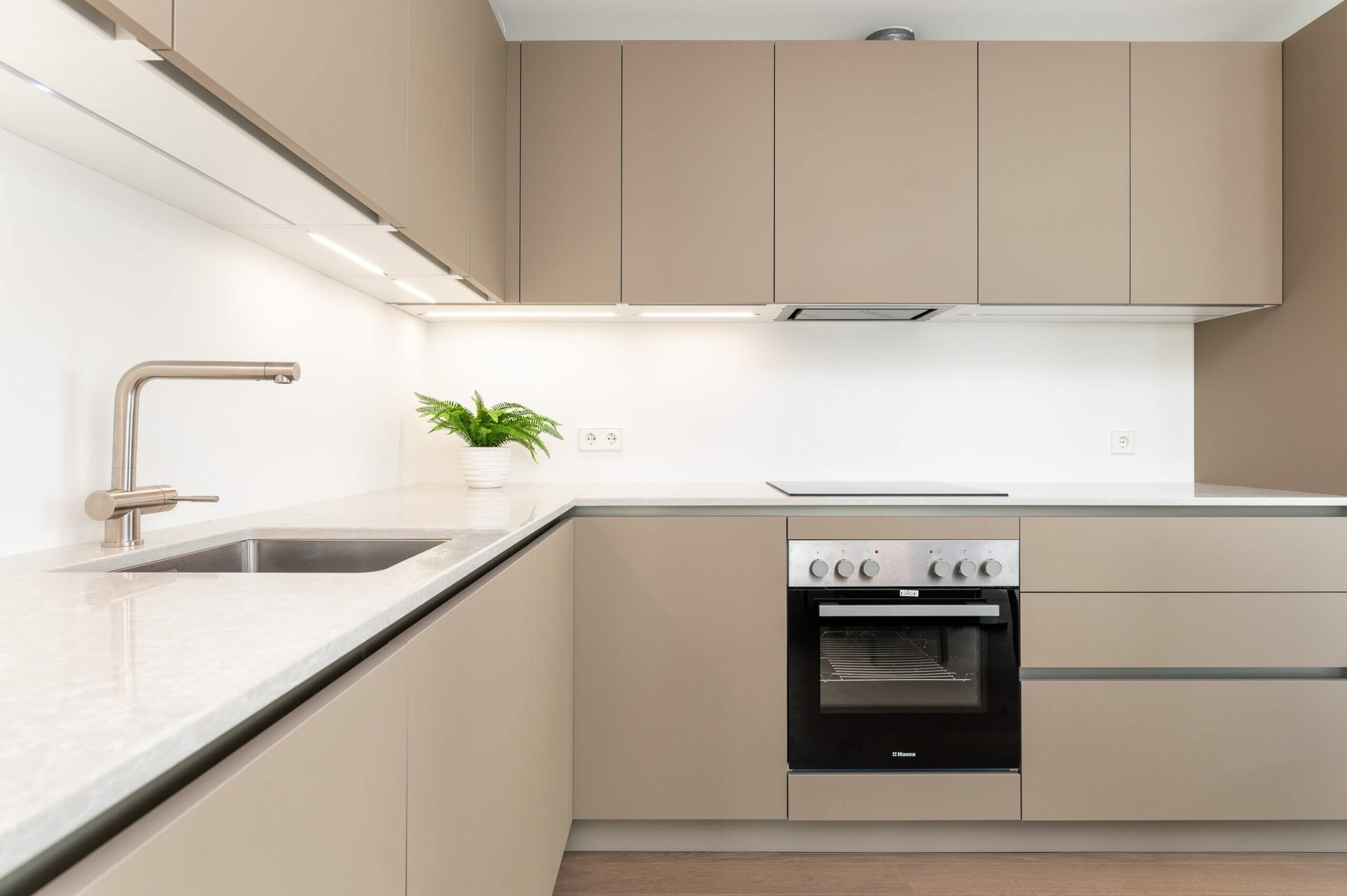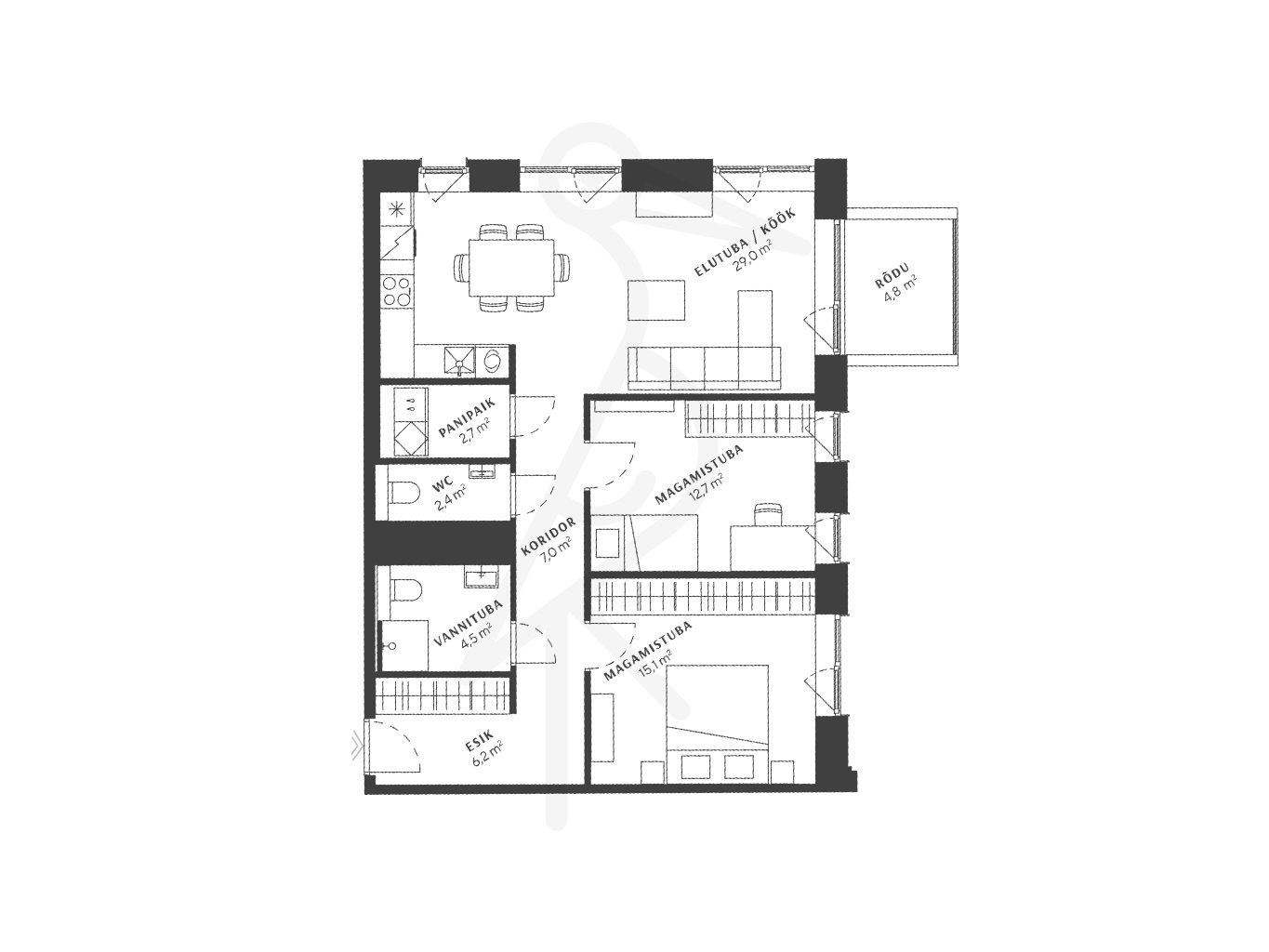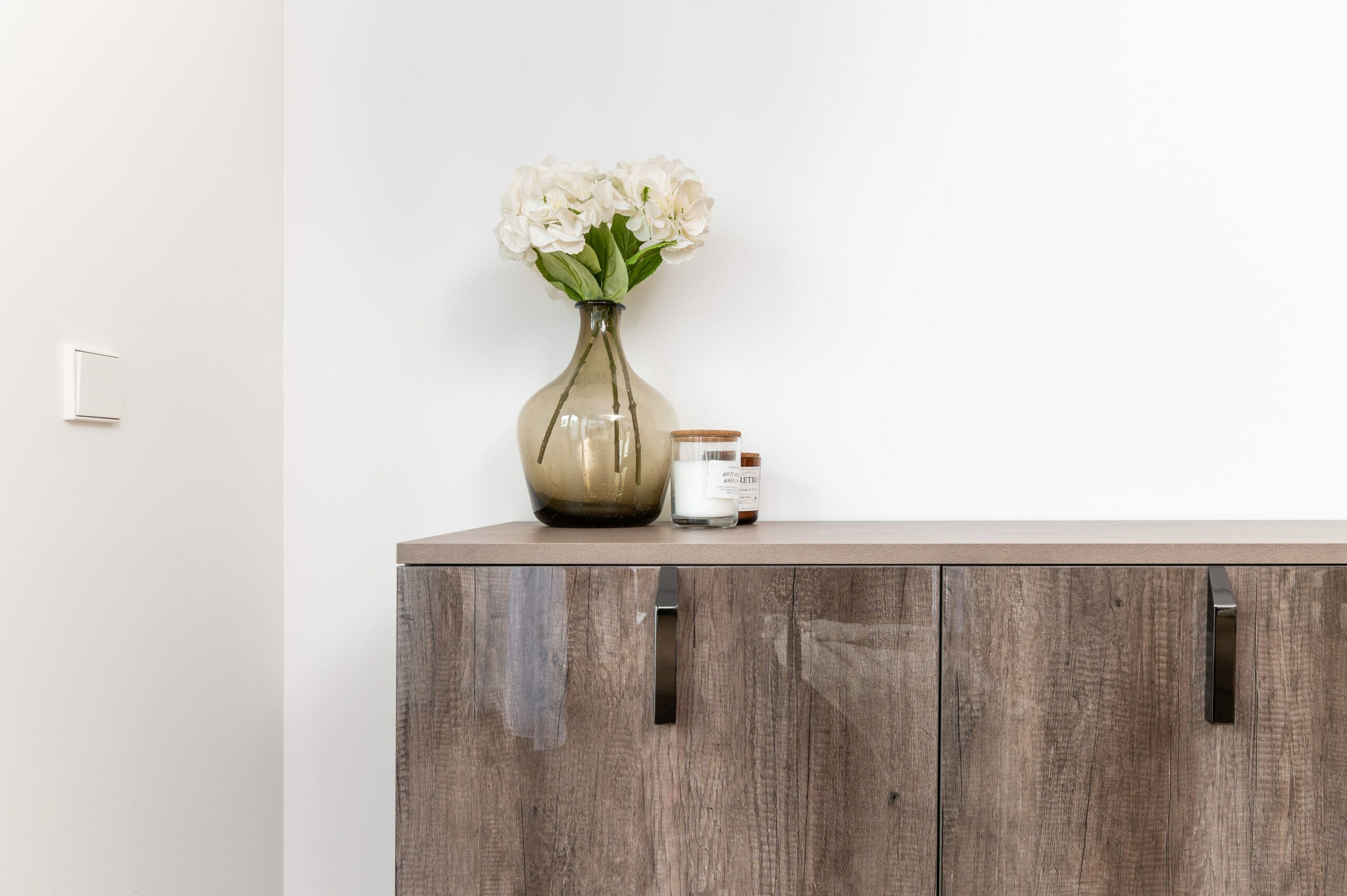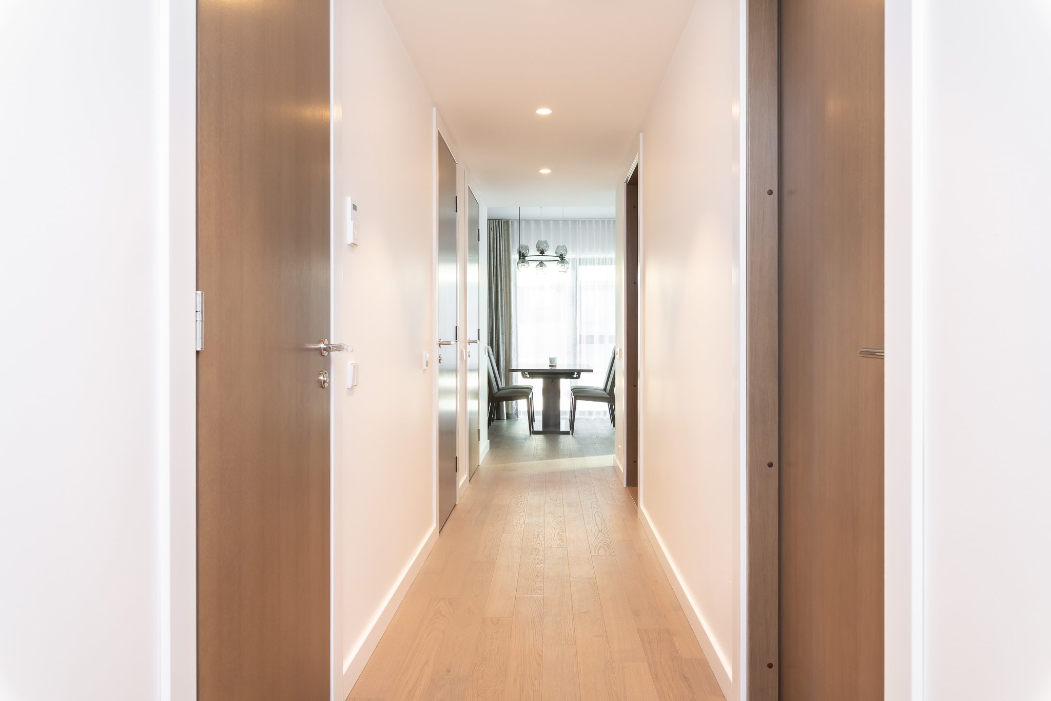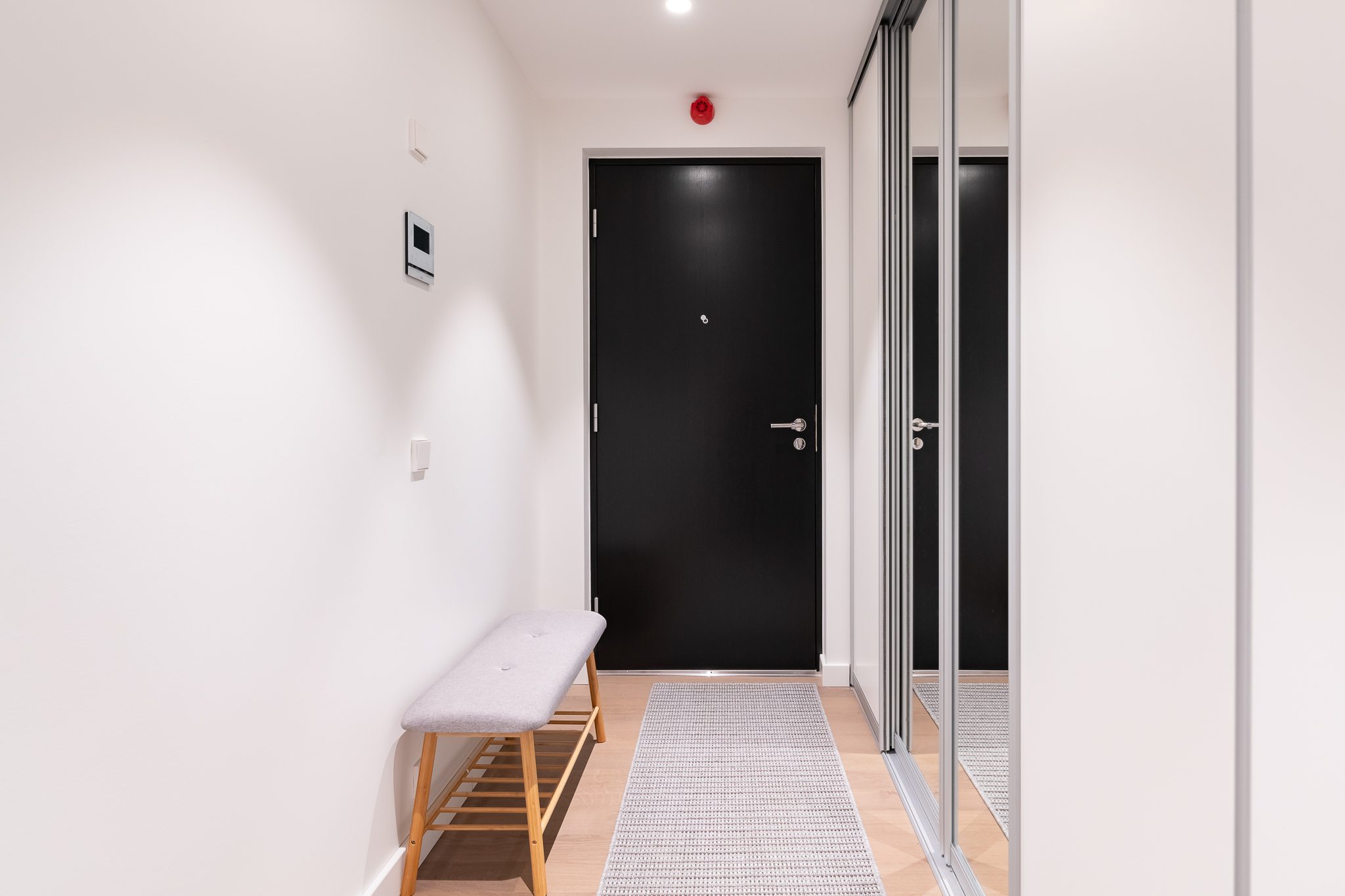 The apartment has the necessary living equipment, lighting and appliances. Additional furniture can be added to the apartment. Hansa and Electrolux household appliances with the highest quality and excellent and timeless design are integrated into the high-quality and functional kitchen furniture: ceramic hob and food oven, extractor hood, dishwasher and refrigerator with freezer. Custom-made wardrobes are integrated in the bedroom and hallway. There is also a washer-dryer in the apartment.