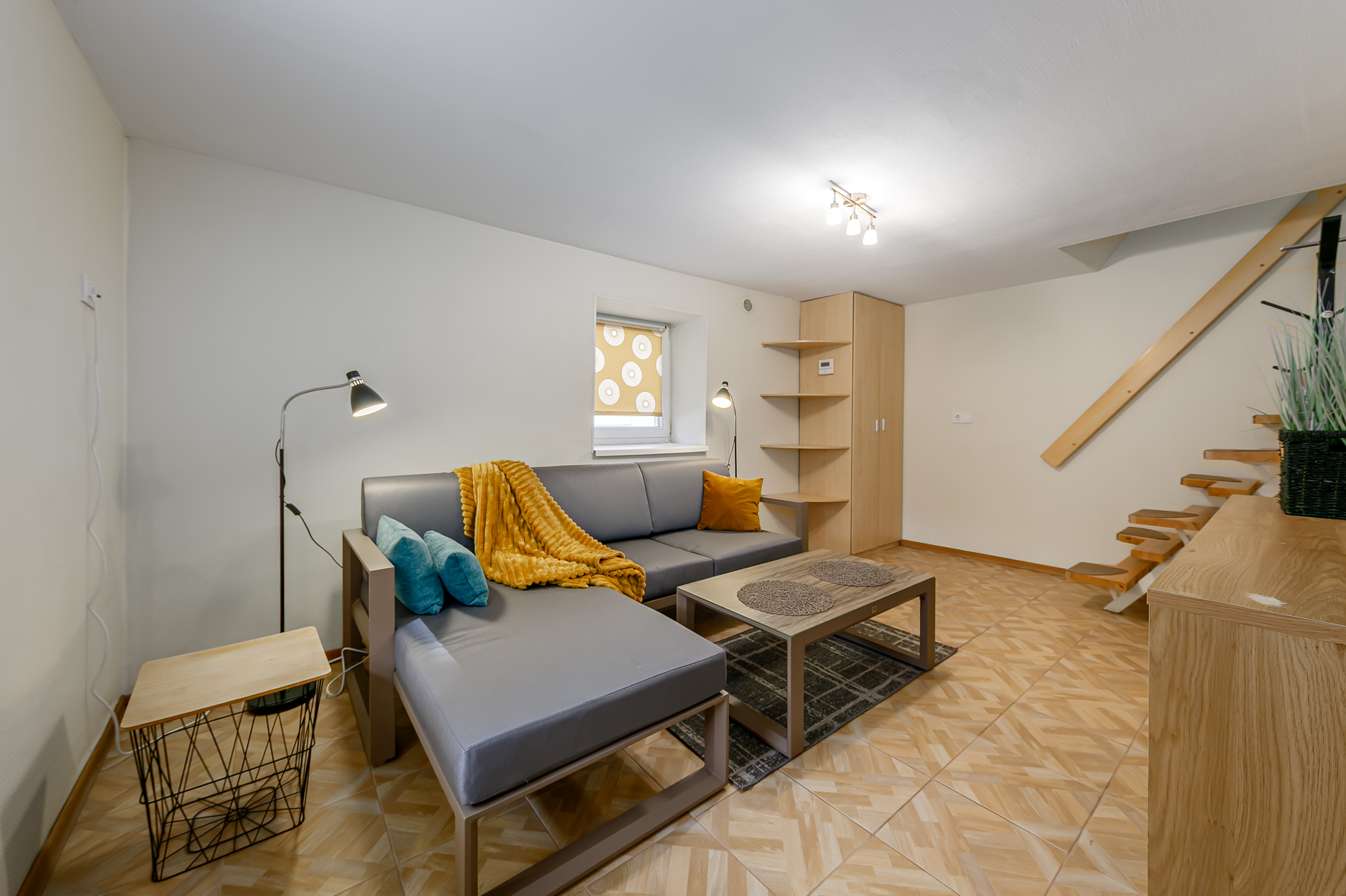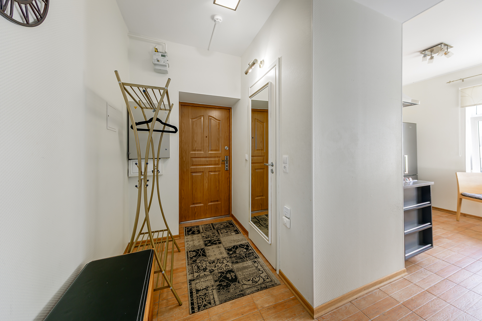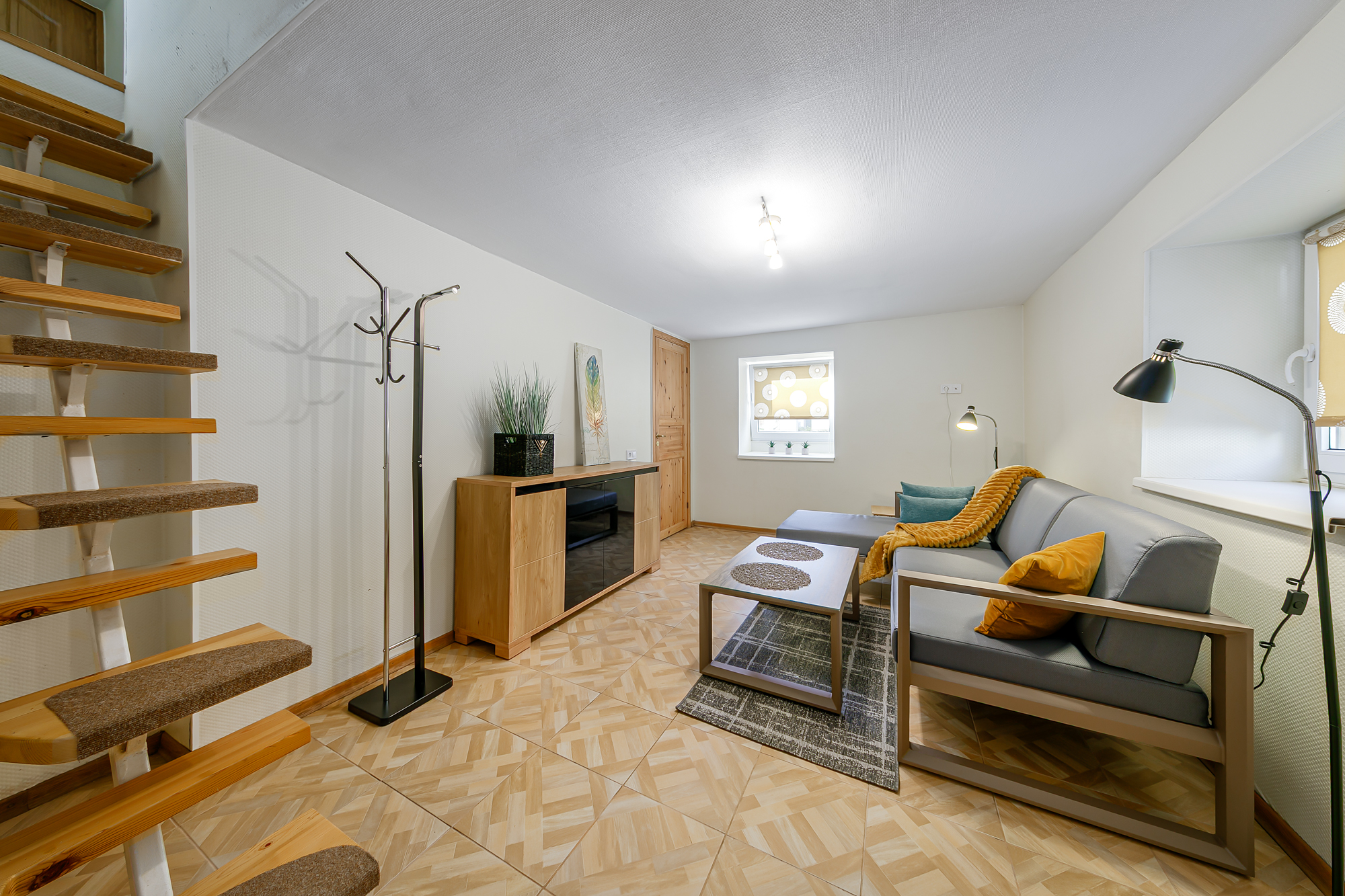 The 55.4 m² apartment comprises a kitchen, living room, two bedrooms, bathroom, toilet, sauna, and hallway. The rooms of the apartment are divided into several levels. The living room, kitchen, and bedroom are located on the 1st floor, while the second room (ideal for an office), bathroom, and sauna are located on the ground floor.