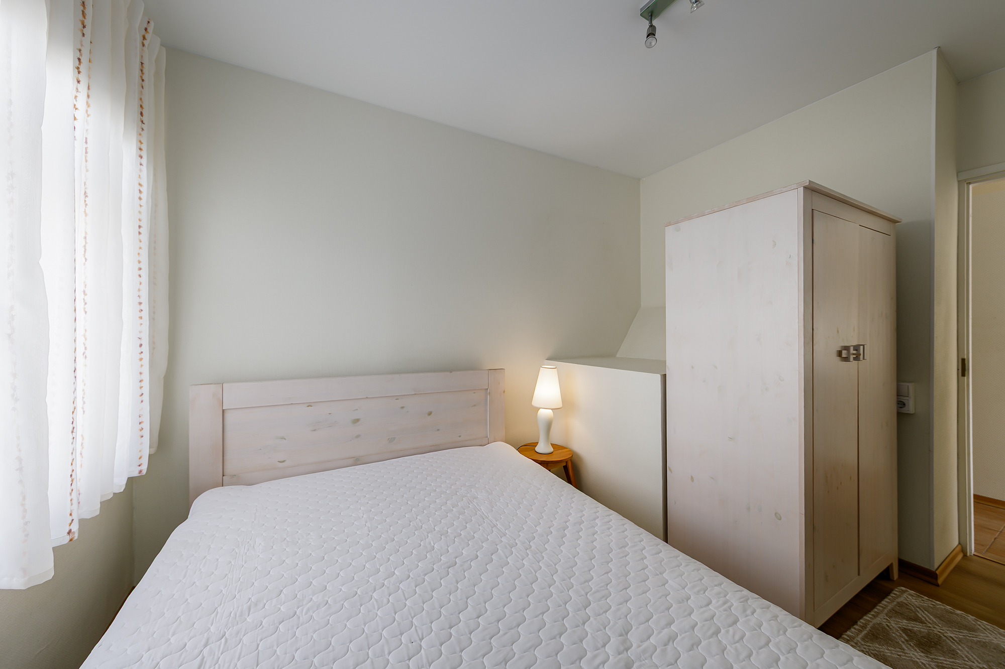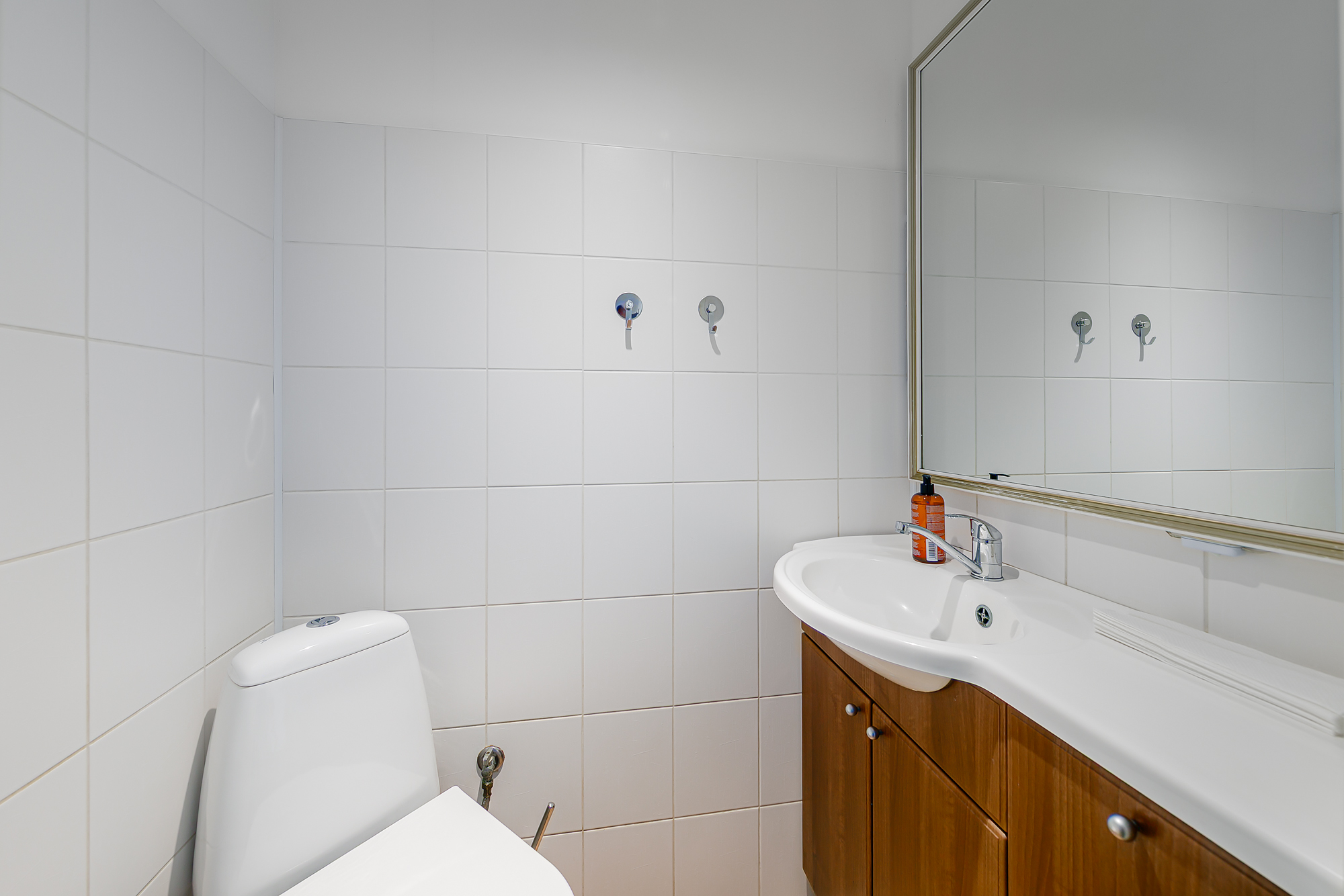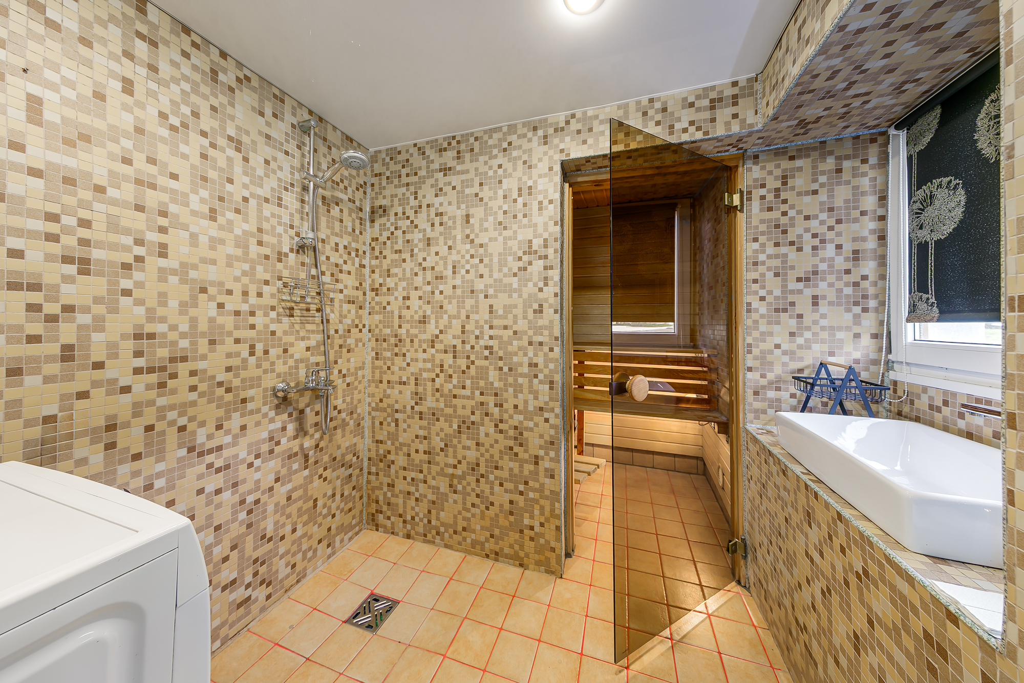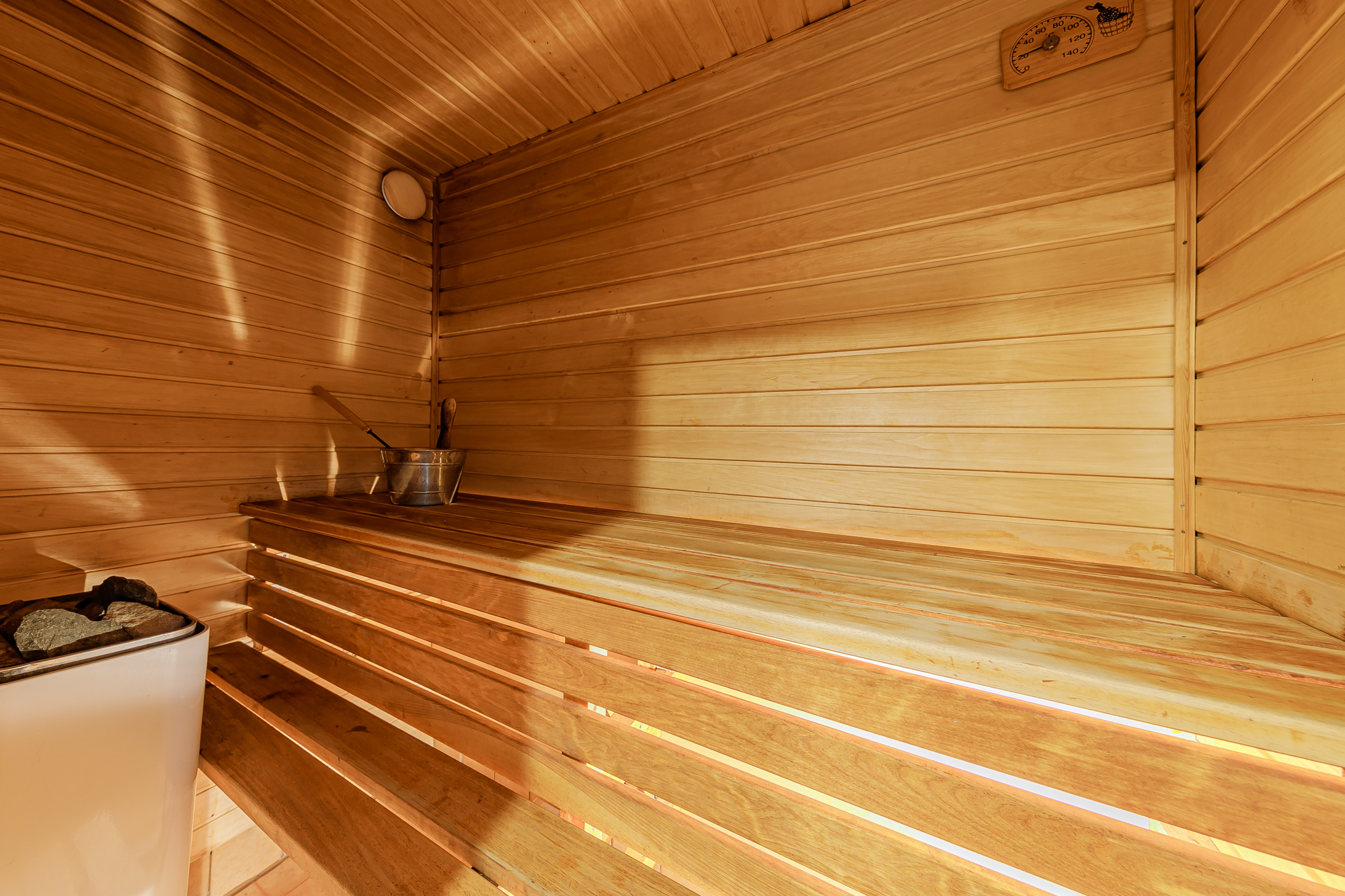 The 55.4 m² apartment comprises a kitchen, living room, two bedrooms, bathroom, toilet, sauna, and hallway. The rooms of the apartment are divided into several levels. The living room, kitchen, and bedroom are located on the 1st floor, while the second room (ideal for an office), bathroom, and sauna are located on the ground floor.