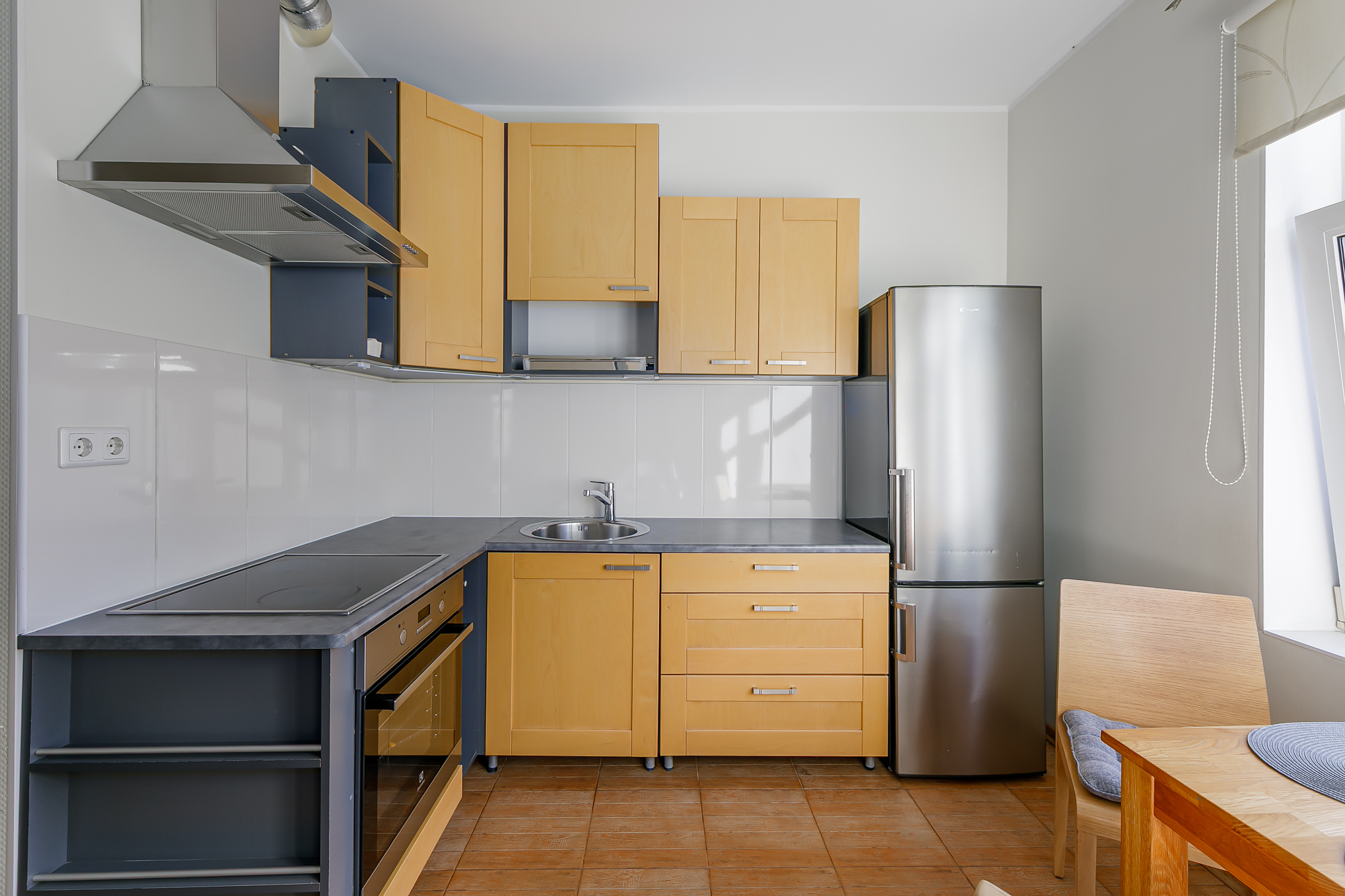 The functional kitchen furniture has high-quality appliances built in: a stove, oven, range hood, and refrigerator with freezer.