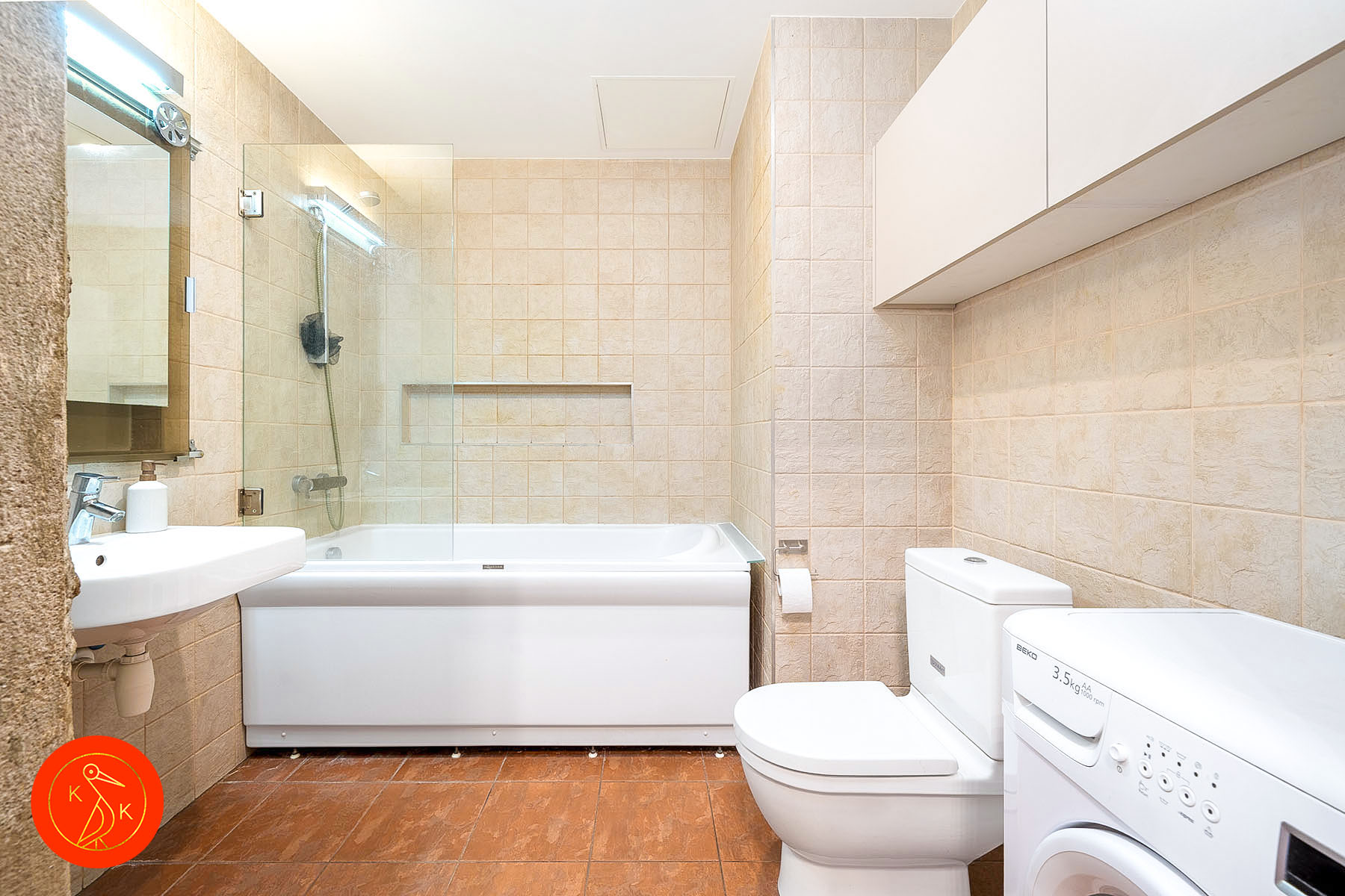 The bathroom includes a bathtub and, in addition to sanitary ware and bathroom furniture, a BEKO washing machine.