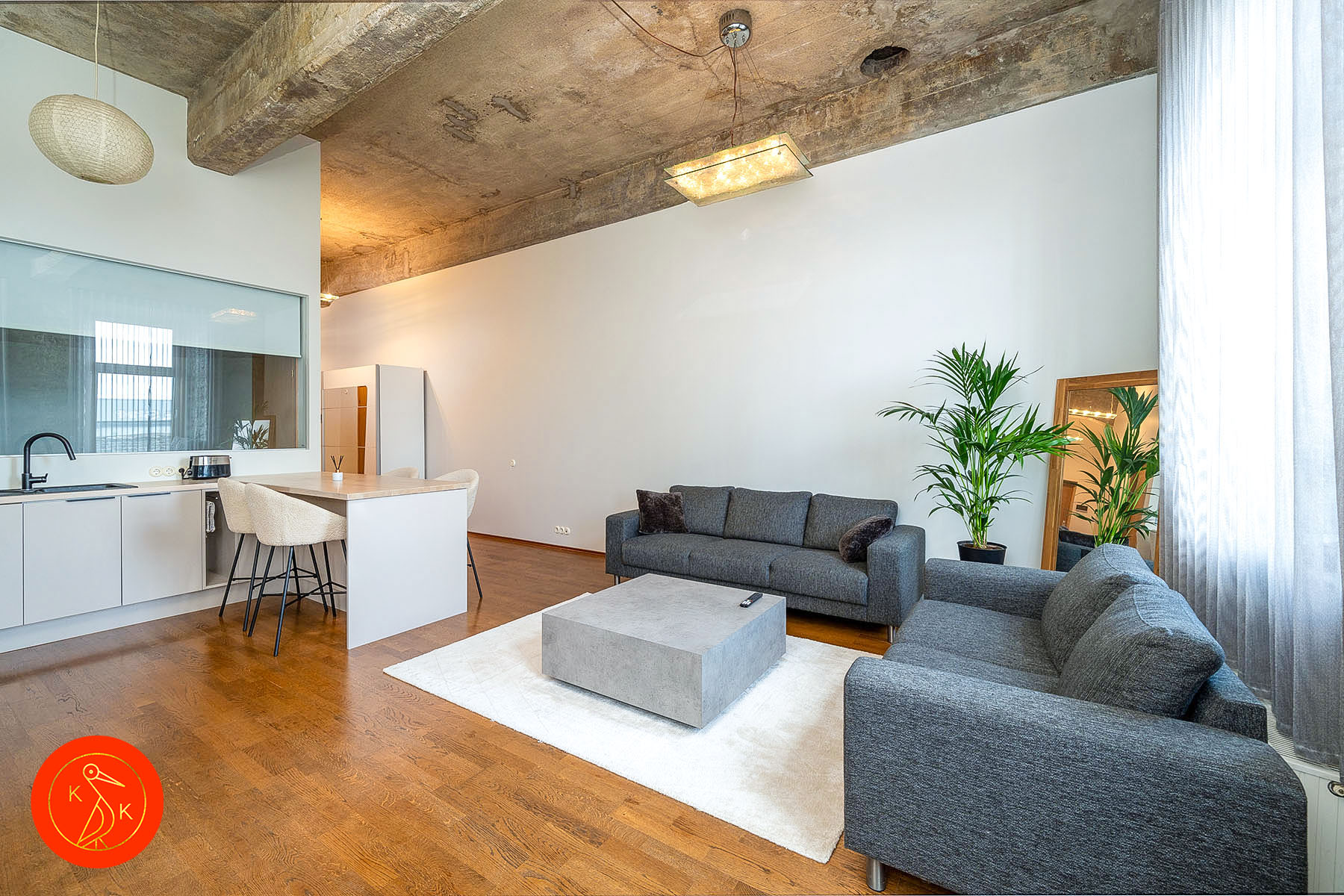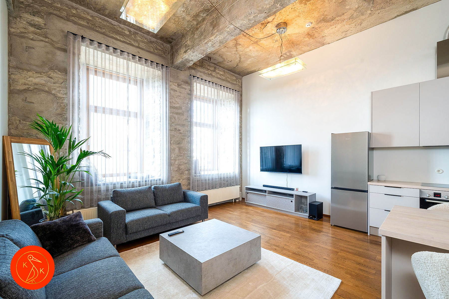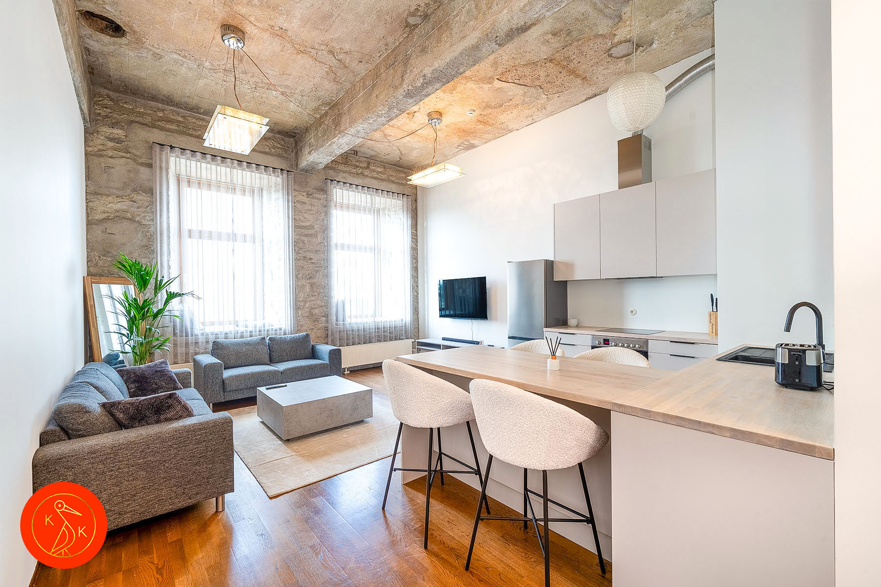 The layout is open and bright, complemented by large windows and high ceilings. The apartment features preserved and exposed historical interior details, including stone and ceiling surfaces. The extensive limestone surfaces have been treated to be dust-free. Ceiling height in the living room reaches up to 5 metres.