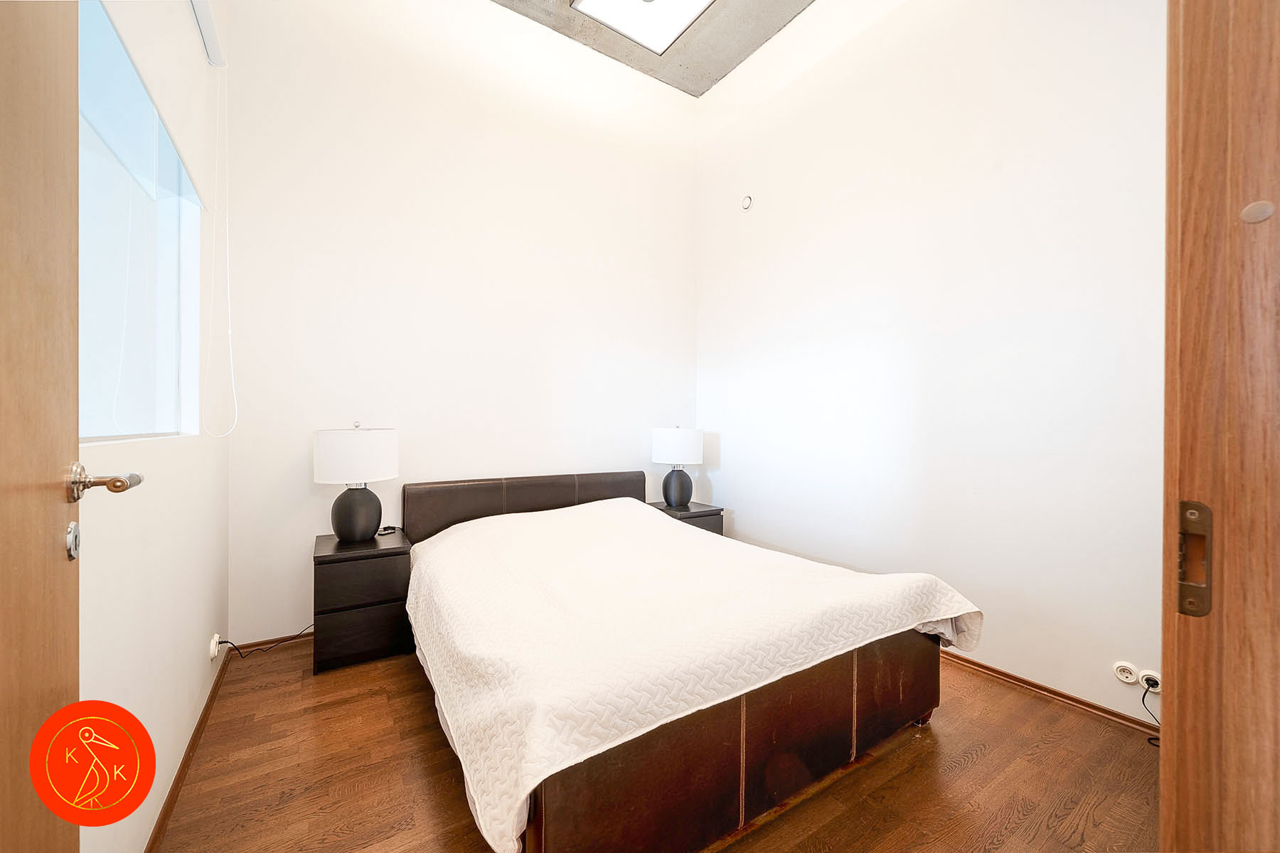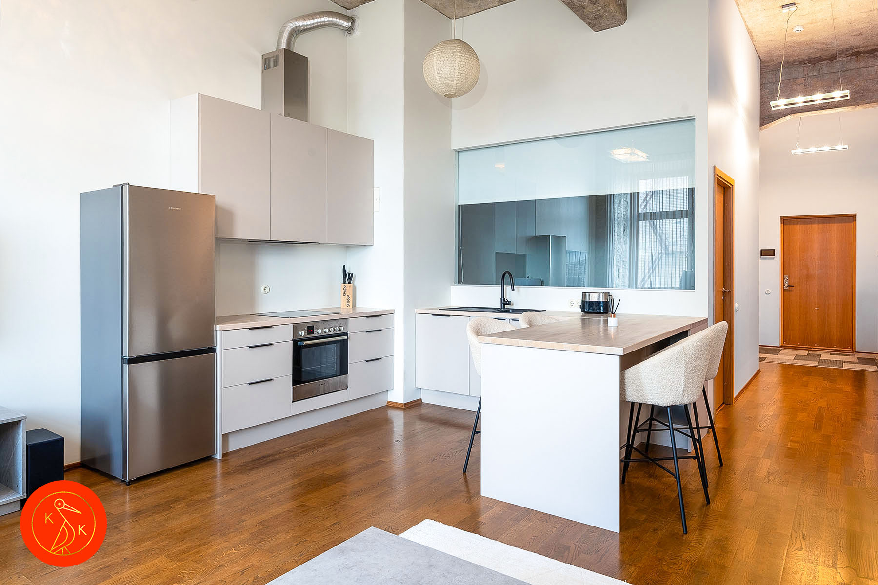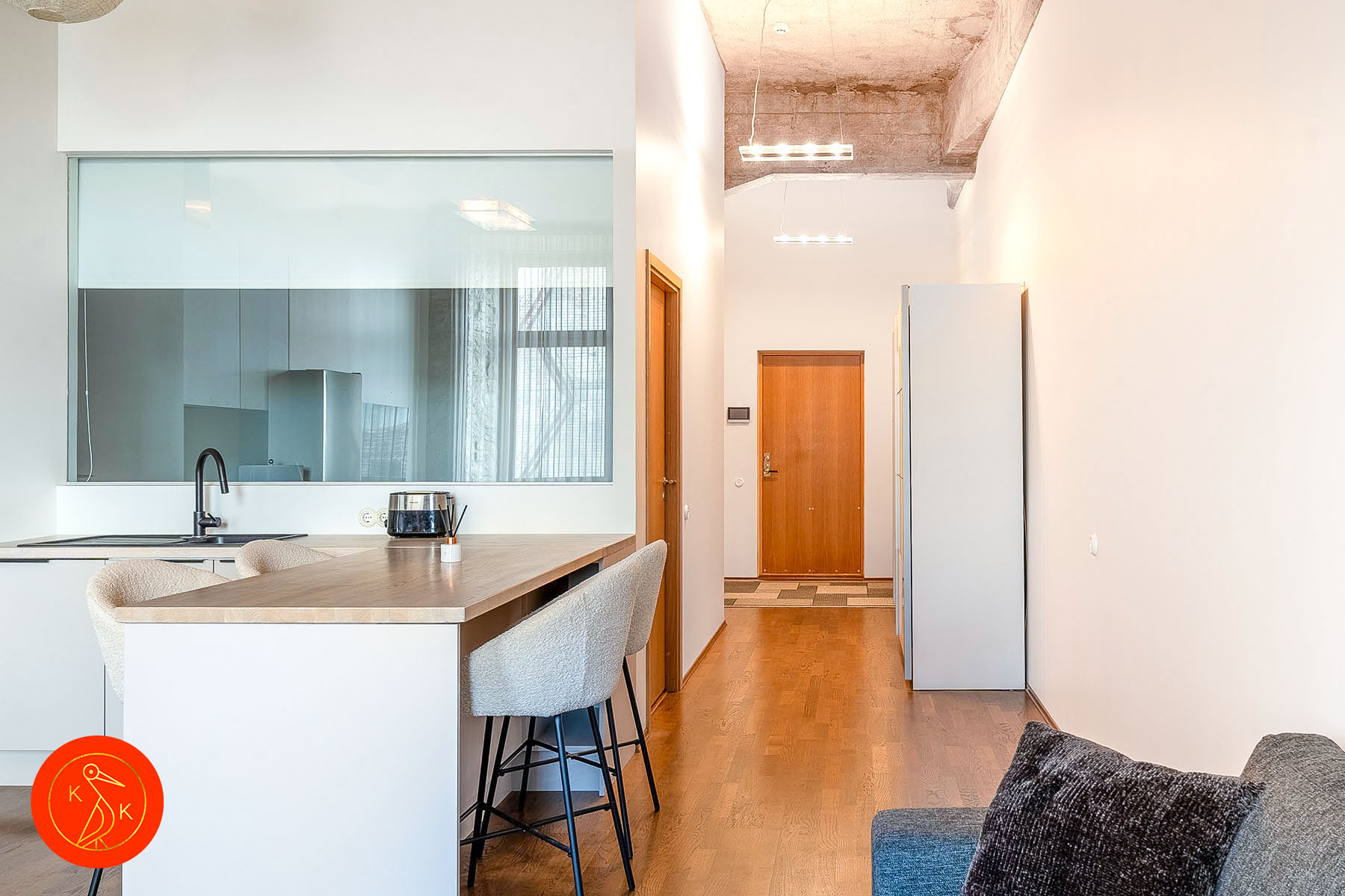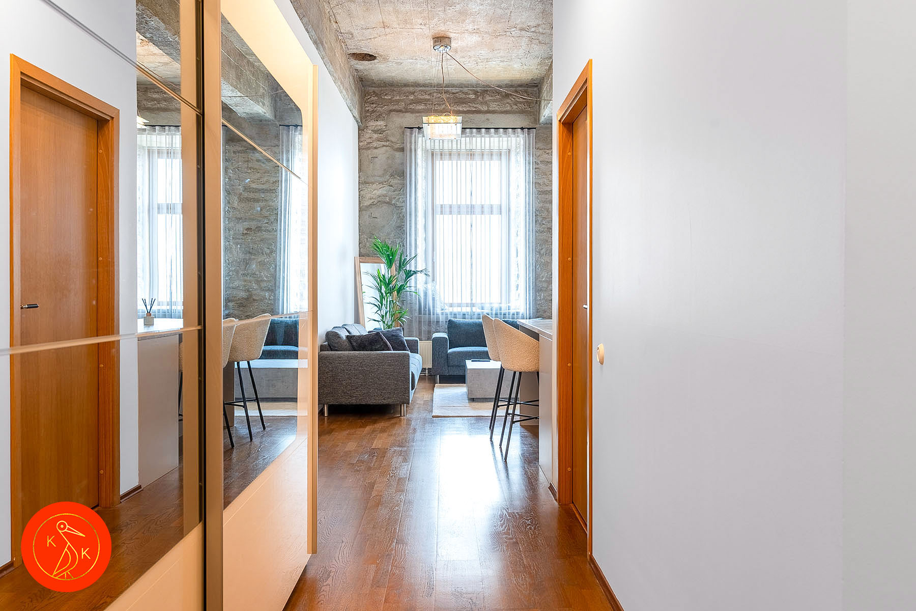 The layout is open and bright, complemented by large windows and high ceilings. The apartment features preserved and exposed historical interior details, including stone and ceiling surfaces. The extensive limestone surfaces have been treated to be dust-free. Ceiling height in the living room reaches up to 5 metres.