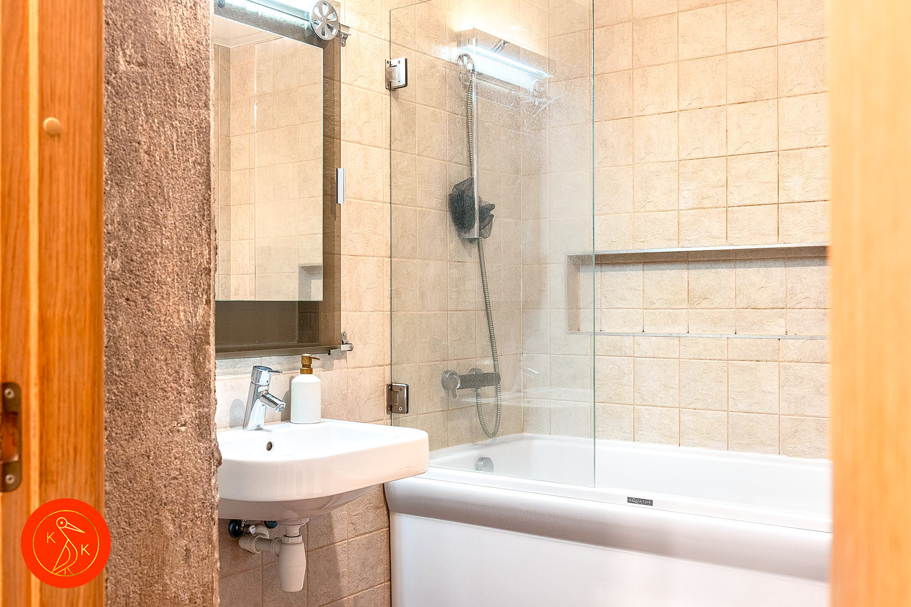 The bathroom features high-quality ceramic tiles, combining refined texture with timeless elegance.