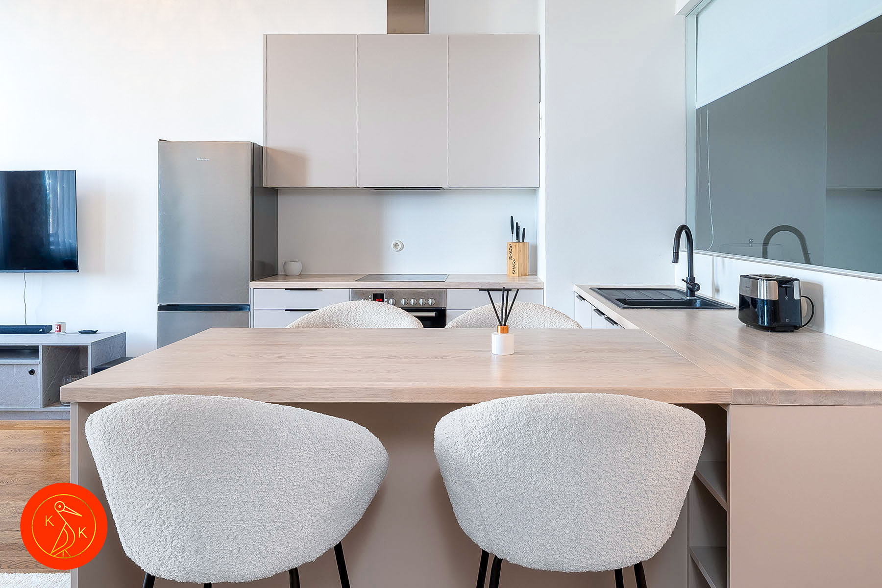 The high-quality and functional kitchen features integrated BOSCH appliances known for their excellent and timeless design: electric stove, oven, extractor hood, dishwasher, and a freestanding fridge with freezer.