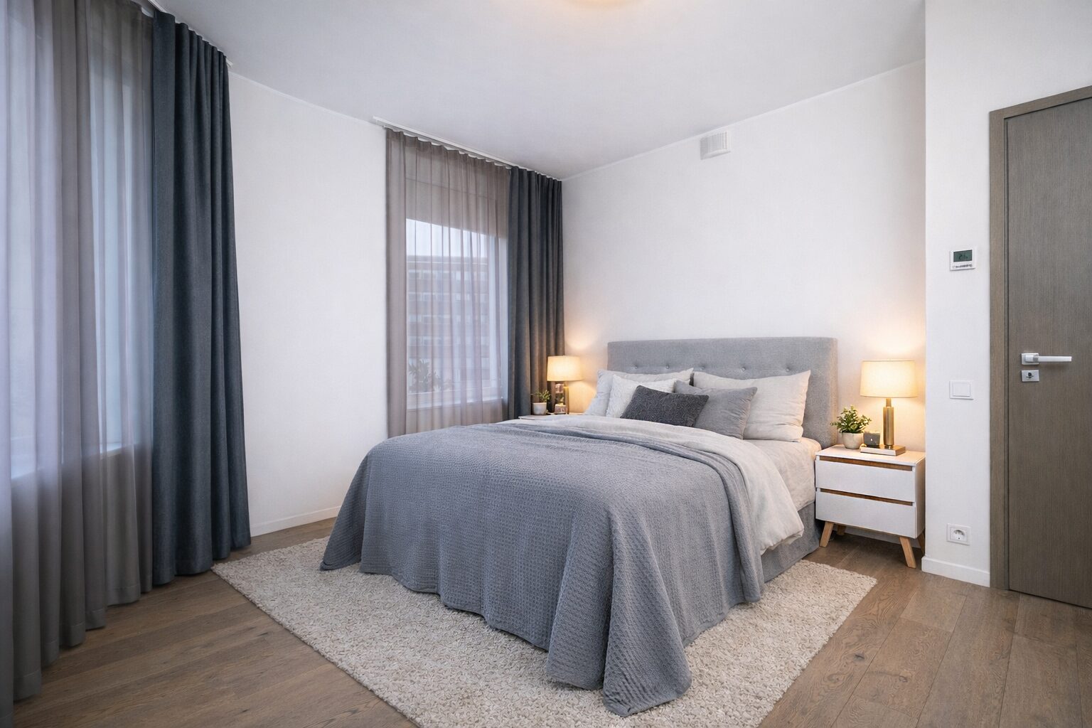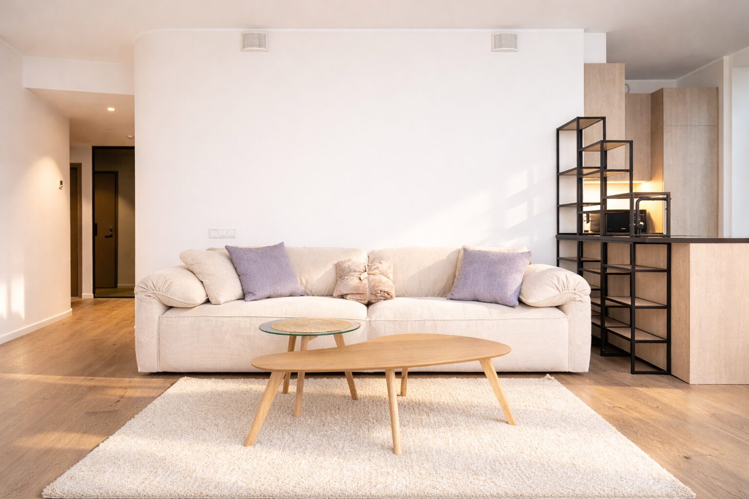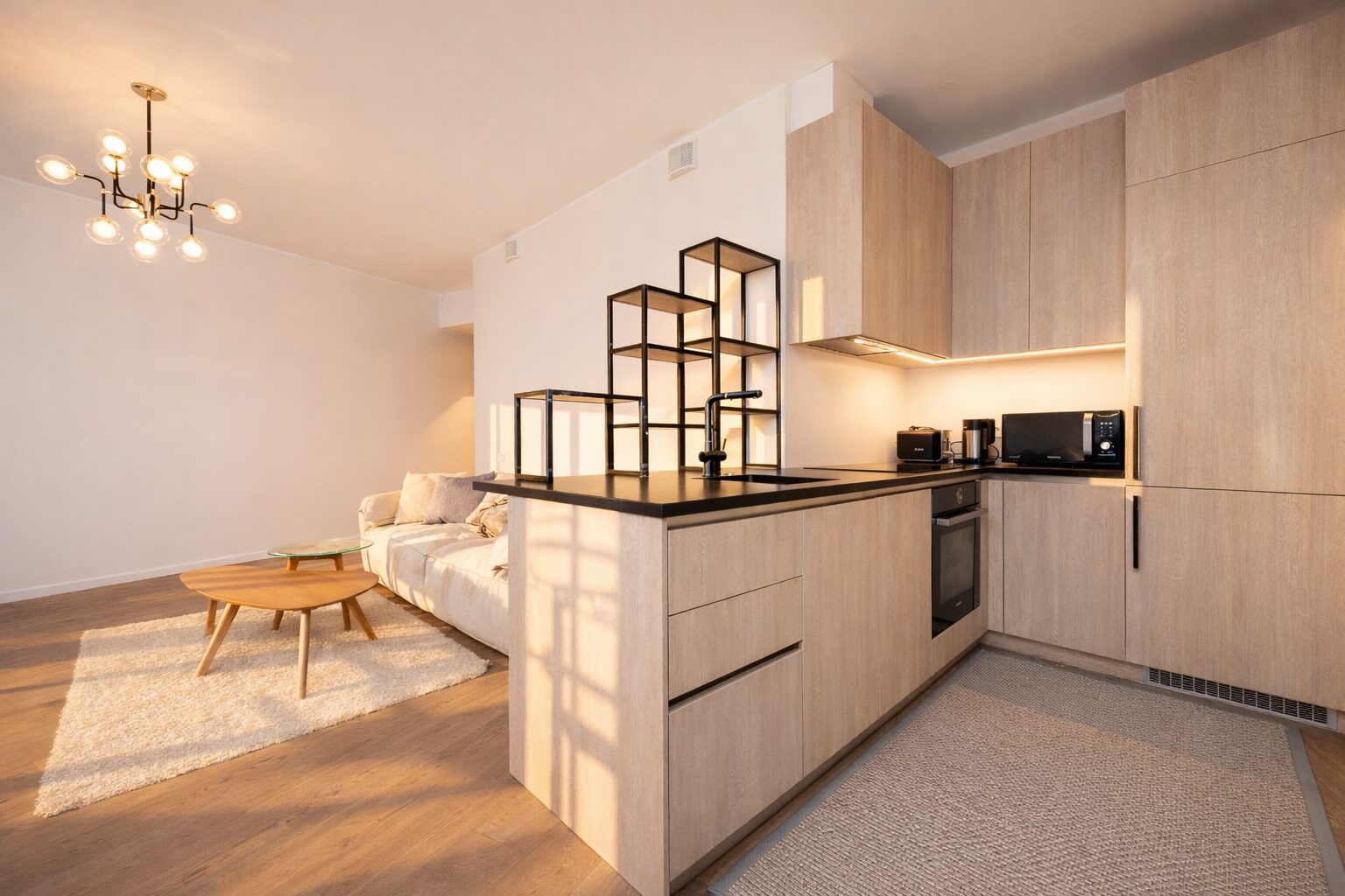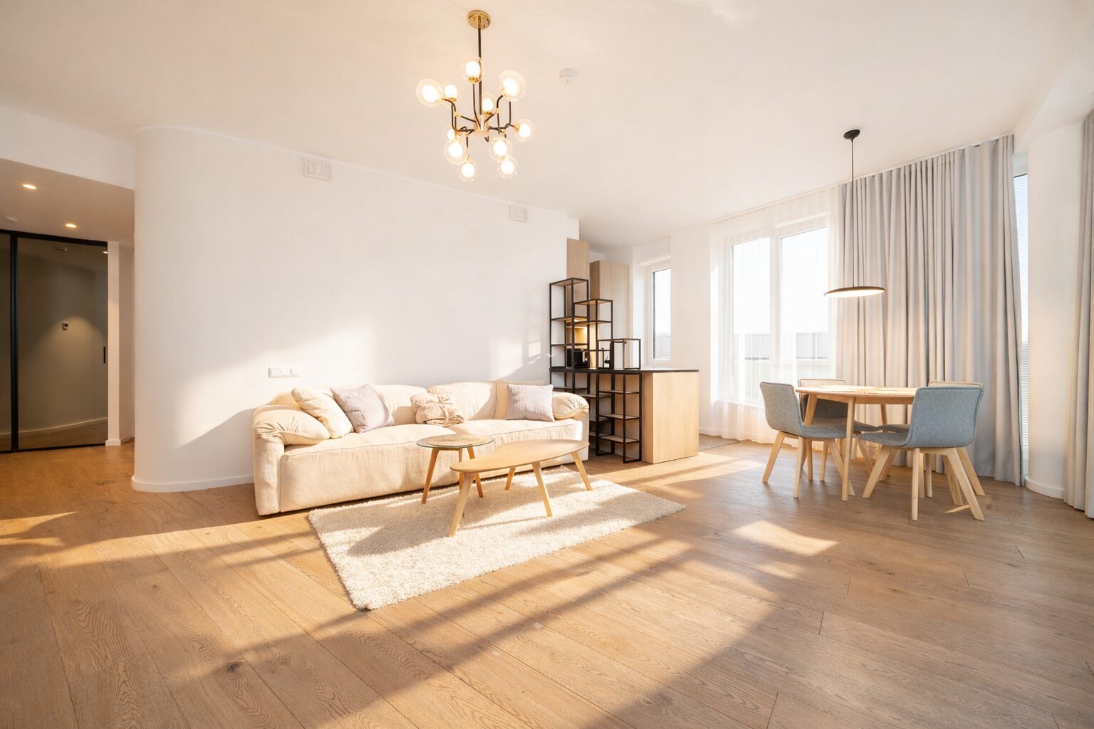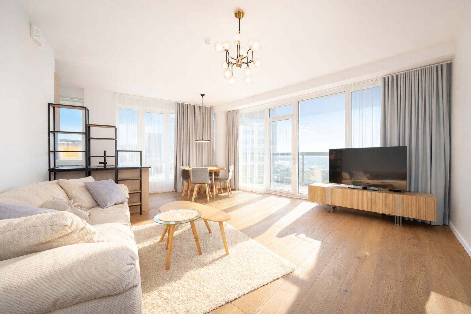 The apartment, located on the 8th floor with a total area of 96.6 m², features modern solutions, an open floor plan, and plenty of natural light. The interior design solutions for Skyline Residence were created by the renowned Swiss company Spacewise. The interior design takes into account the special location and position of the towers, combining quality, urbanity and naturalness.
