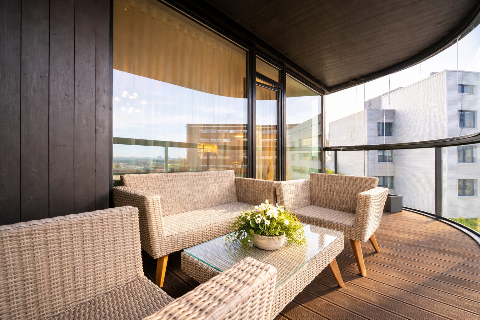 The balconies of the apartment building are covered with tiles and the sides and front edge are securely glazed. Thanks to the glazed balcony, this part of the apartment can be used all year round and is safe even for the youngest members of the family.