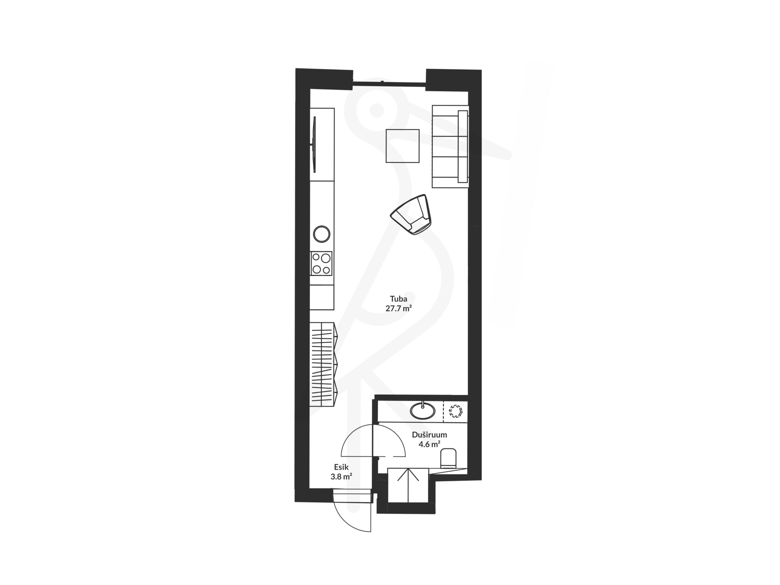 The apartment on the 5th floor of the building has a total surface of 37 m² and comprises a living room/bedroom with open kitchen, bathroom and hall. The spacious living area has been planned for comfortable and cosy living. In addition to the existing sanitary ware, the bathroom also has an LG washing machine.