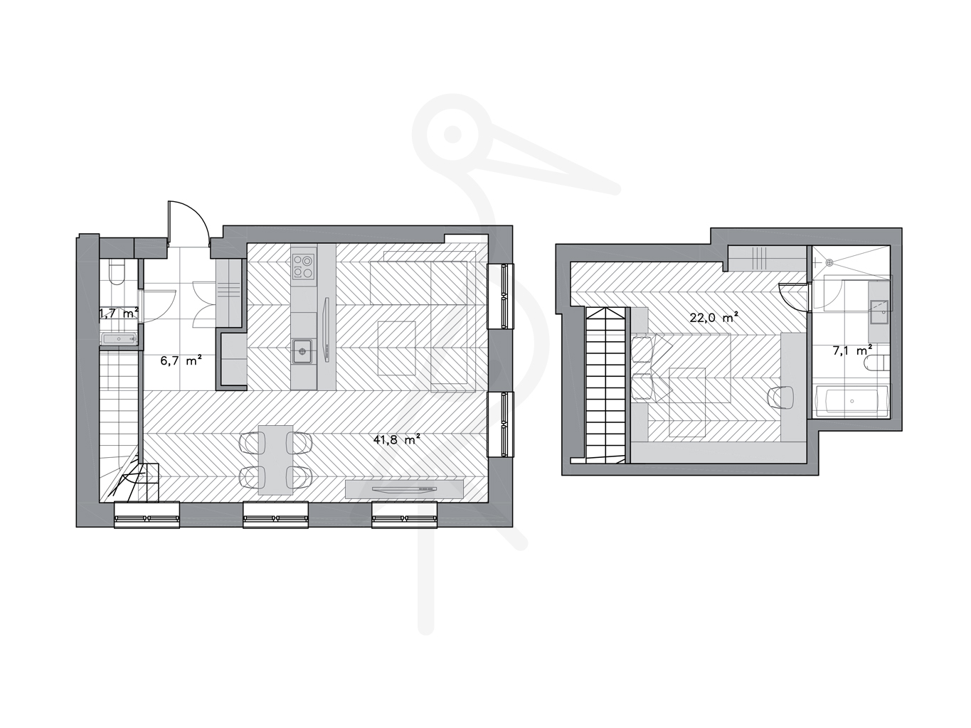 This 80,5 m² apartment with 83,6 m² total floor area consists of a living room with open kitchen, bedroom, hall, bathroom with WC and guest toilet. The living areas are spread over two floors.