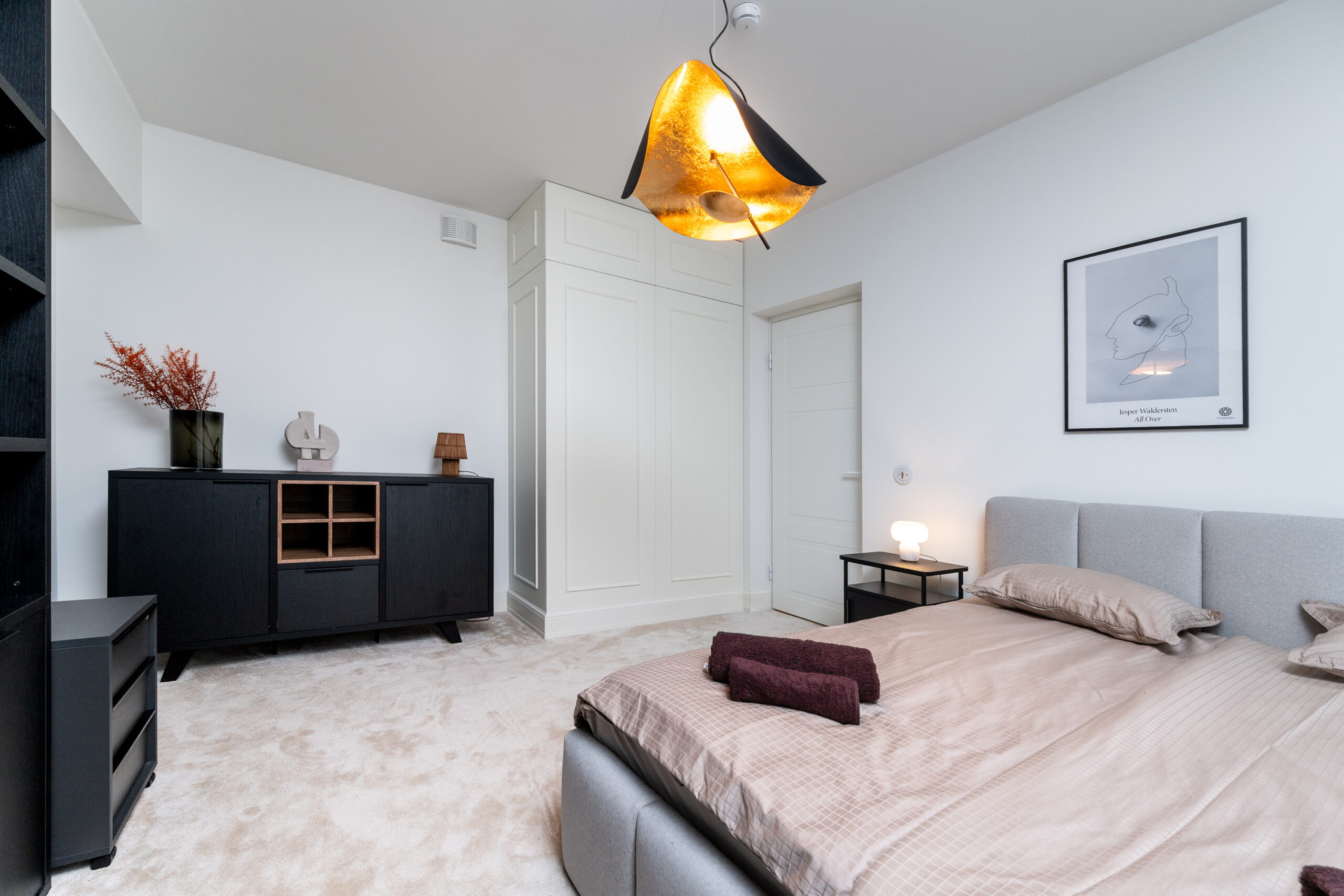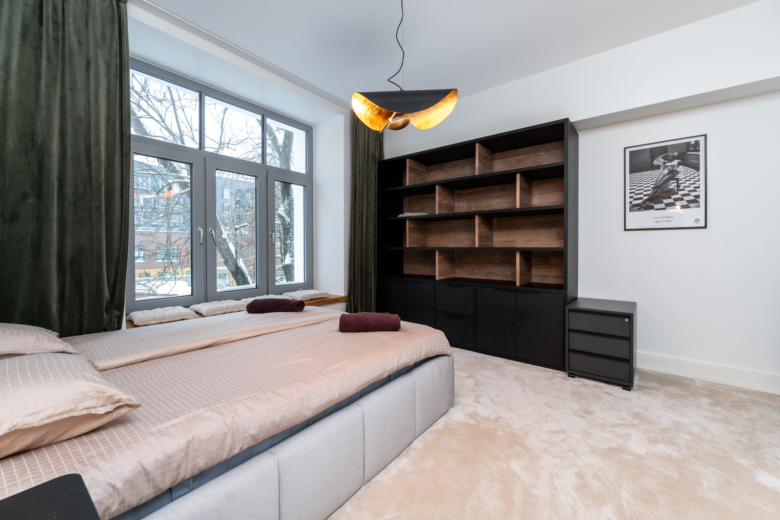 The apartment’s distinctive interior is enhanced by custom-made furniture and unique lighting fixtures that create a thoughtful and inviting ambiance.