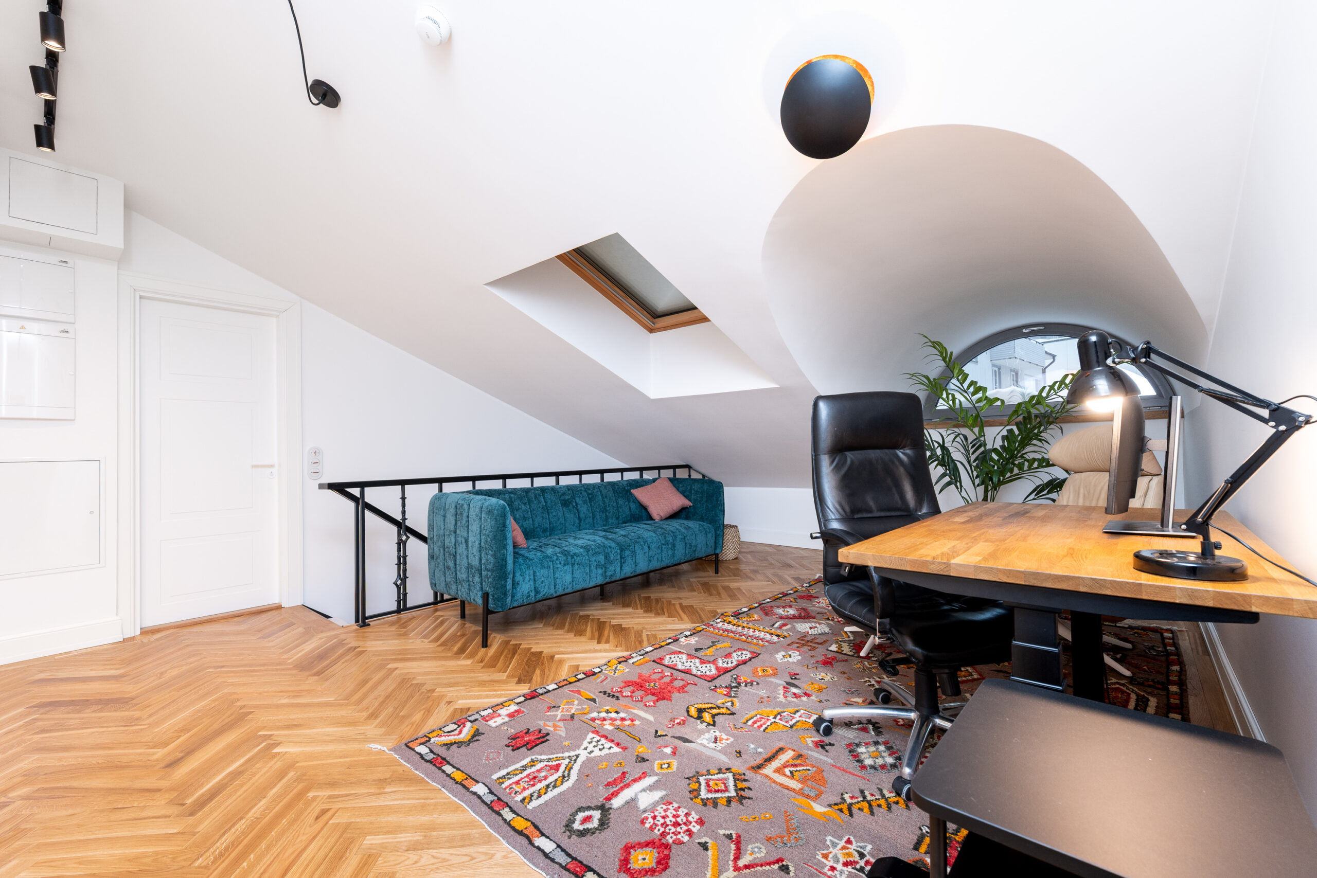 This 138 m² apartment spans two floors – the third and fourth levels of the building.