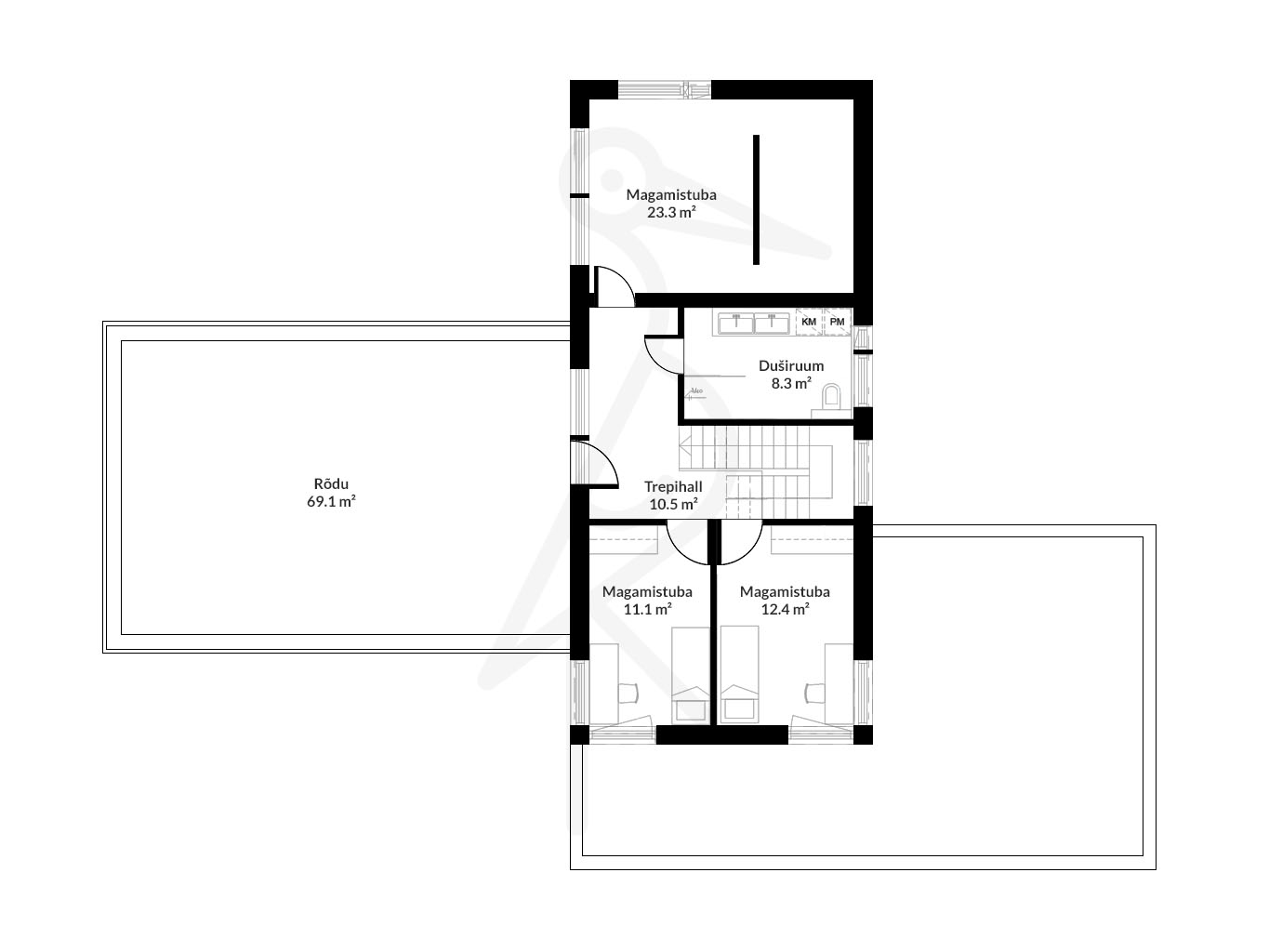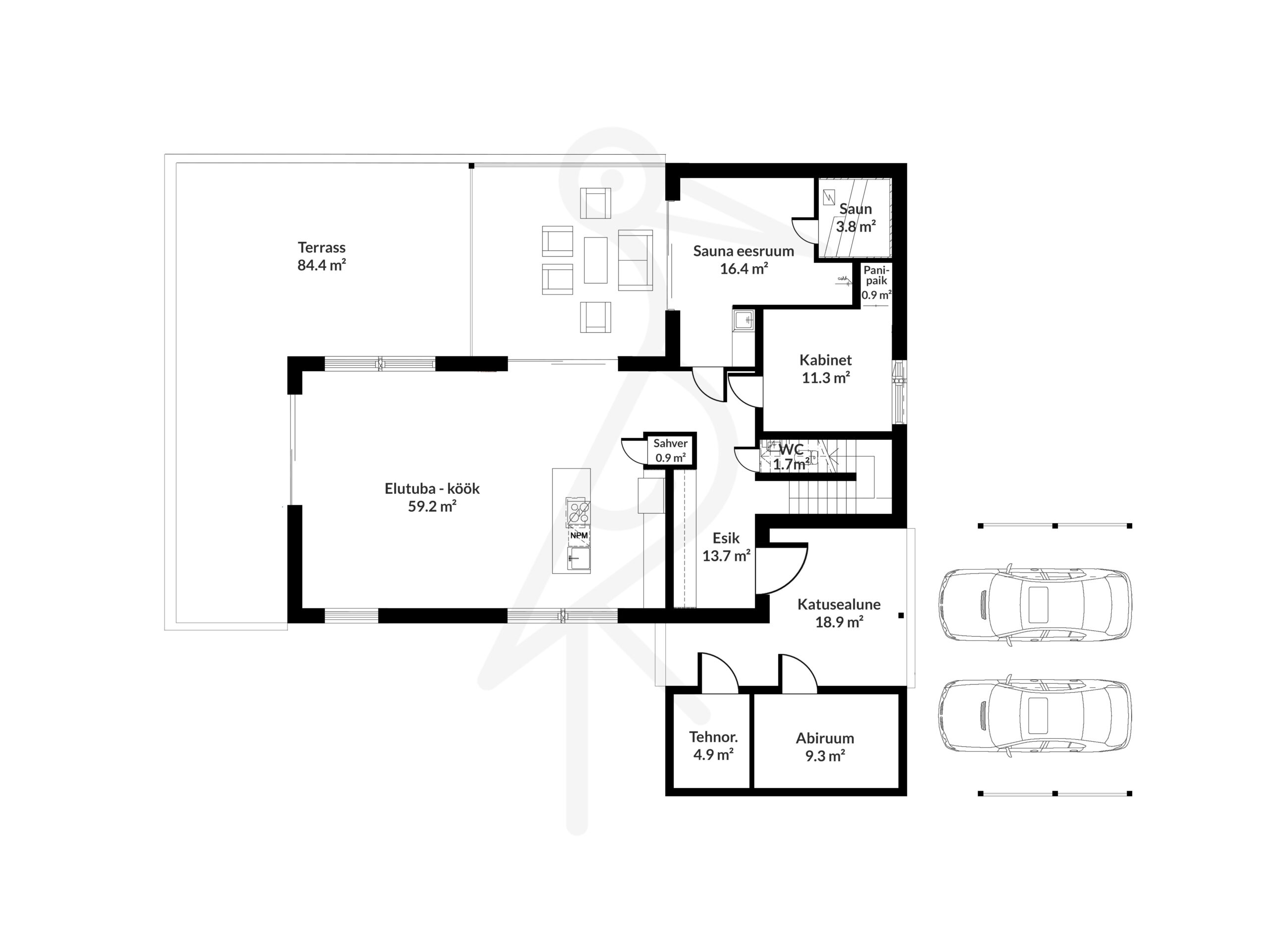 1.korruse koosseisu kuulub köök-elutuba, veinikamber, kontor-/magamistuba, sauna eesruum koos tulevase aurusaunaga, tualett ja esik. Elutoast ning sauna eesruumist on pääs 84.4m² suurusesse talveaeda ja terrassile, kus asetseb valgustusega mullivann. Talveaia klaasid on eemaldatavad. Teisele korrusele viib täispuidust ja valgustatud trepp. 2. korrusel on 3 magamistuba, trepihall ja vannituba. Lisaks on trepihallist pääs 69.1m² suurusele rõdule. Auto katusealuse kõrval on tehnoruum, mida saab kasutada ka panipaigana.
