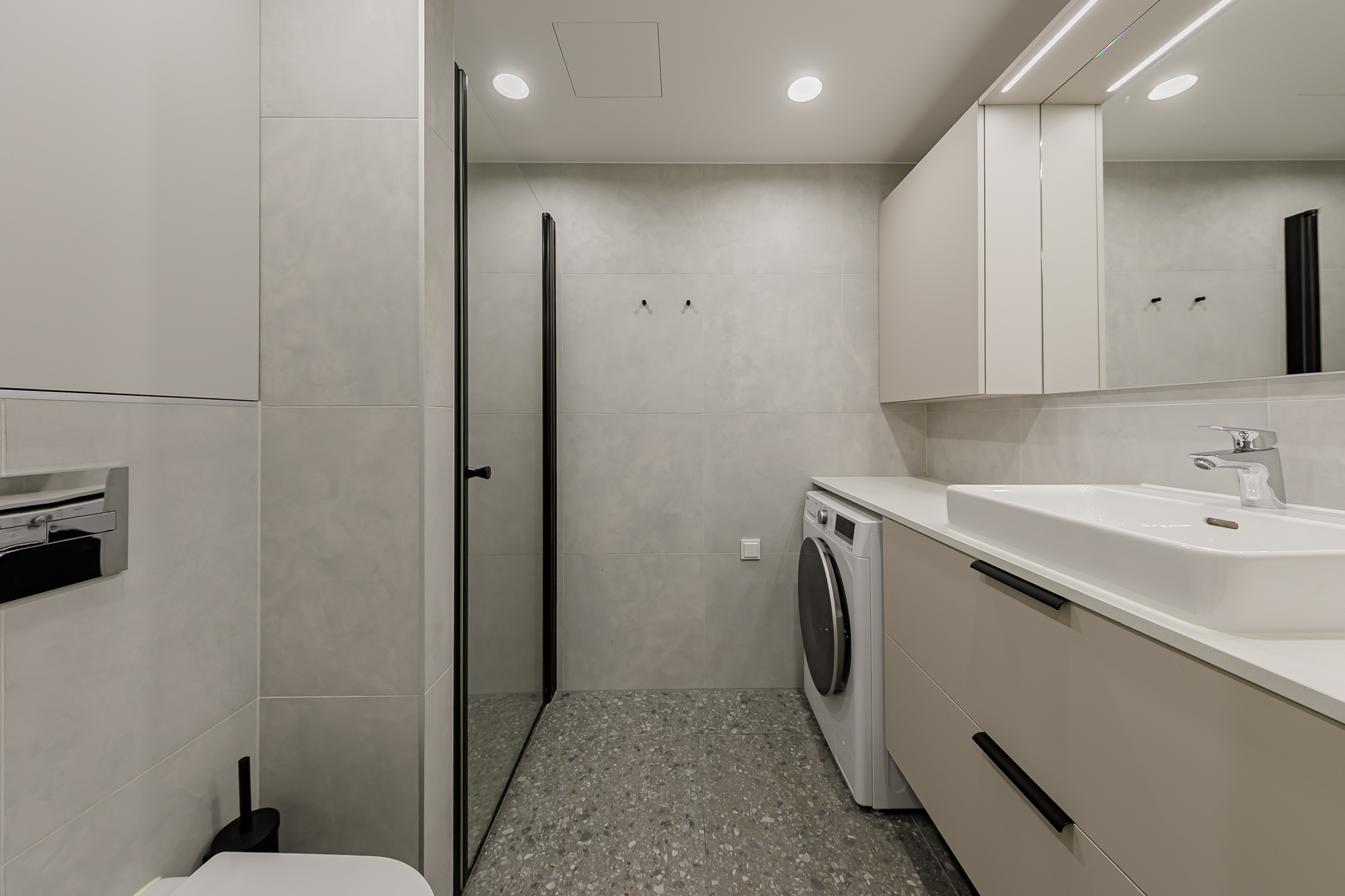 Duširuumis on lisaks sanitaartehnikale ning vannitoamööblile olemas ka LG ThinQ 8.5kg pesumasin.