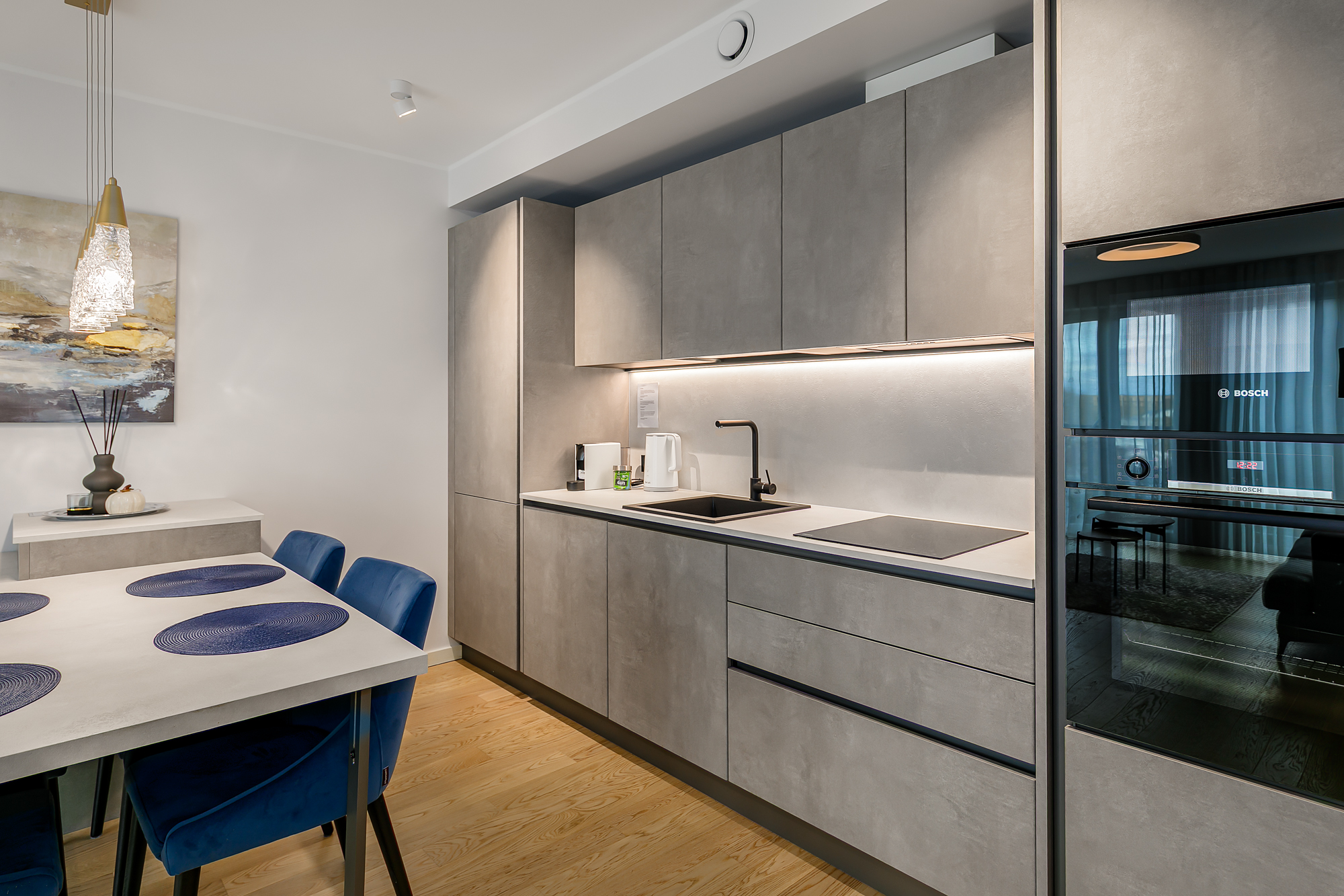 Funktsionaalsesse Itaalia mööblimaja poolt eritellimusel valminud köögimööblisse on integreeritud kvaliteetne Bosch ja Berk köögitehnika: nõudepesumasin, toiduahi, induktsioonpliit, mikrolaineahi, õhupuhasti ning külmkapp koos sügavkülmikuga.