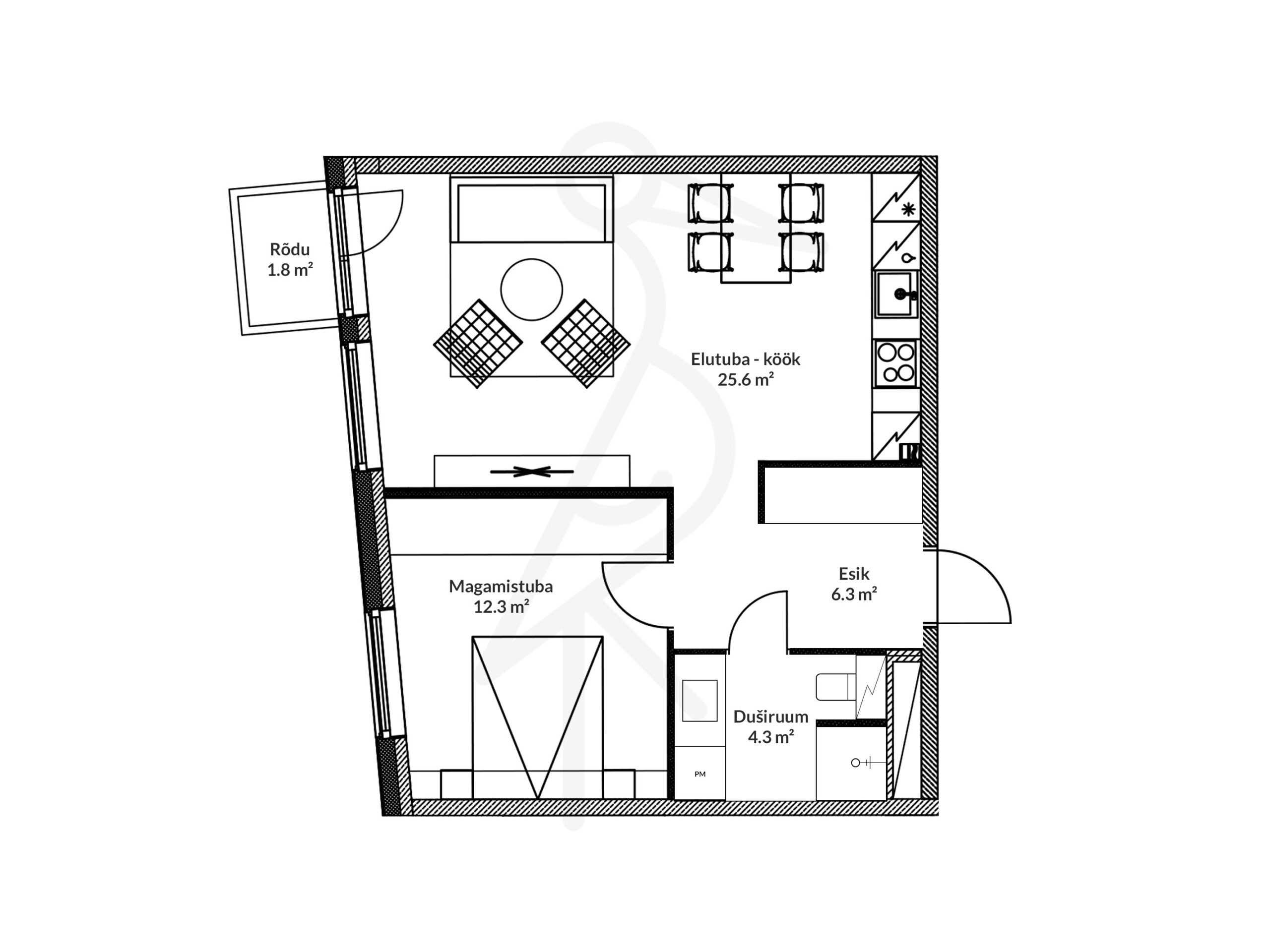 Korter asub 4-korruselise hoone 3. korrusel ning selle sisepind on 48,5 m². Korteri koosseisu kuuluvad avatud köögiga elutuba, magamistuba, esik ning wc/duširuum. Eluruumidele lisandub 1.8 m² suurune klaasitud lodža, kuhu pääseb elutoast – ideaalne paik hommikukohviks või õhtupäikese nautimiseks. Avar ja valgusküllane planeering on rõhutatud suurte maast laeni akendega, mis lasevad loomulikul valgusel ruumidesse vabalt voolata. Kõik aknad avanevad lääne suunal, vaatega sisehoovi.