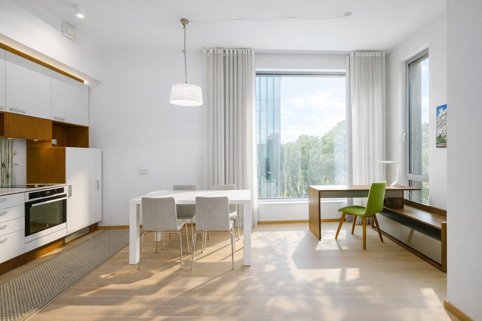Eluruumides on kasutatud disainvalgusteid ning erinevate toonivalikutega eritellimusel valmistatud kardinaid. Kõik korteris olevad esemed on uueväärses seisukorras.