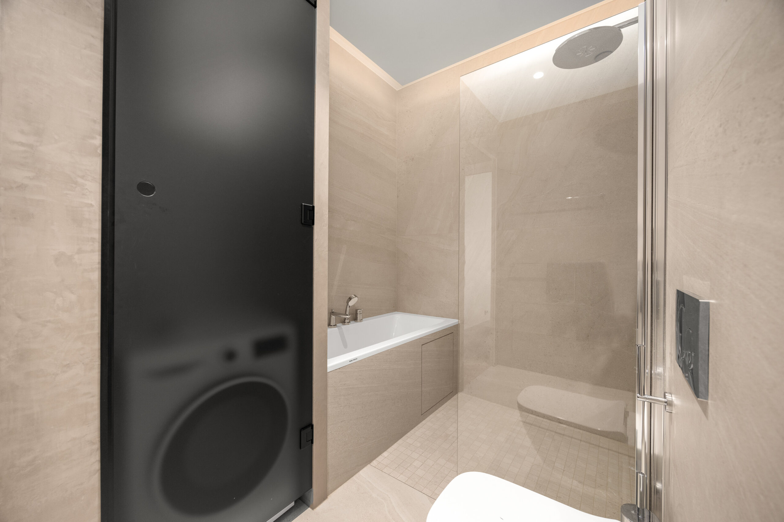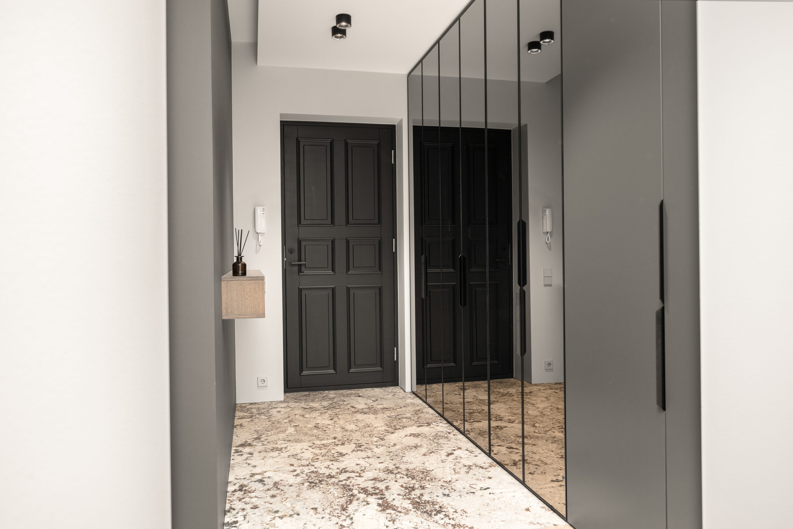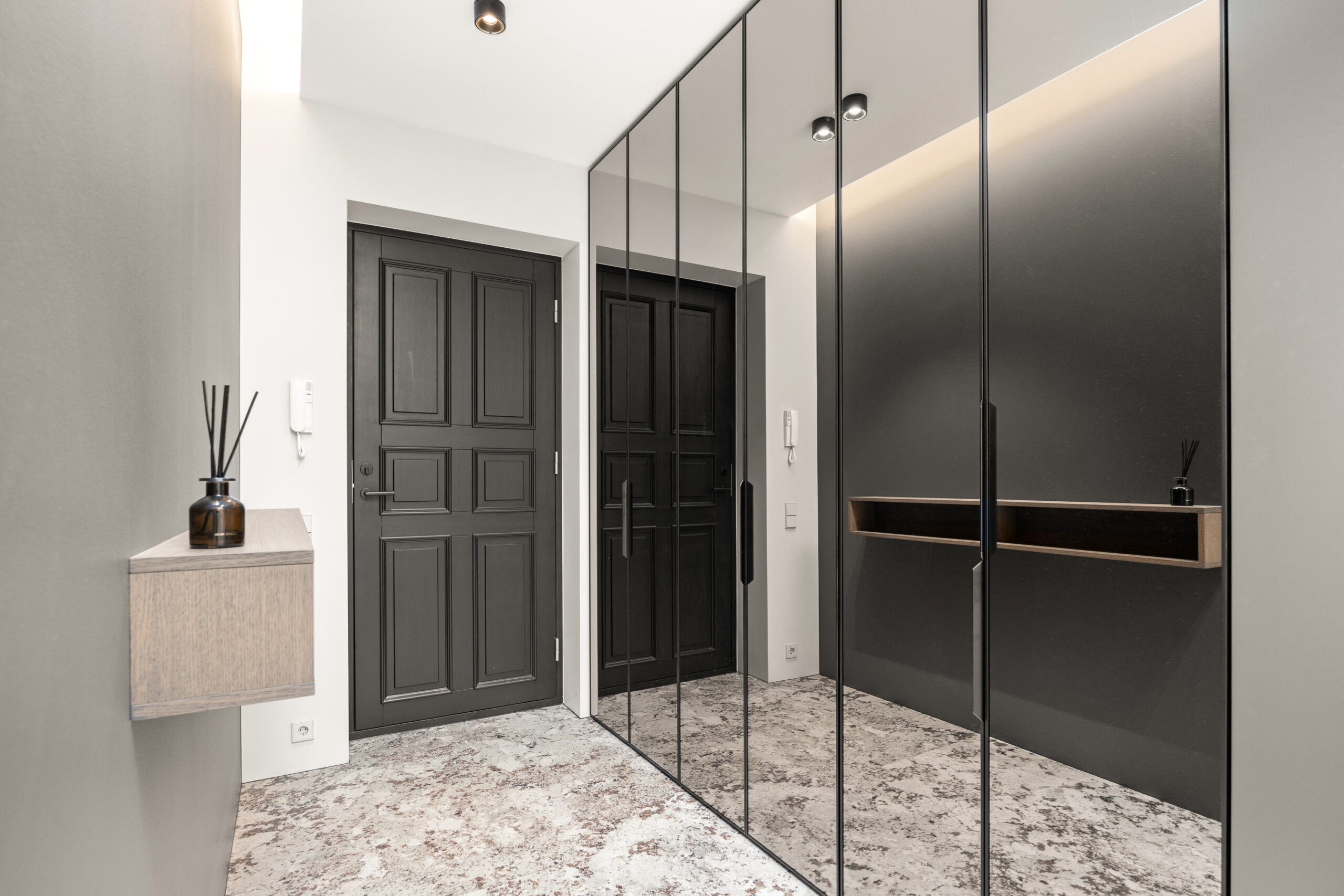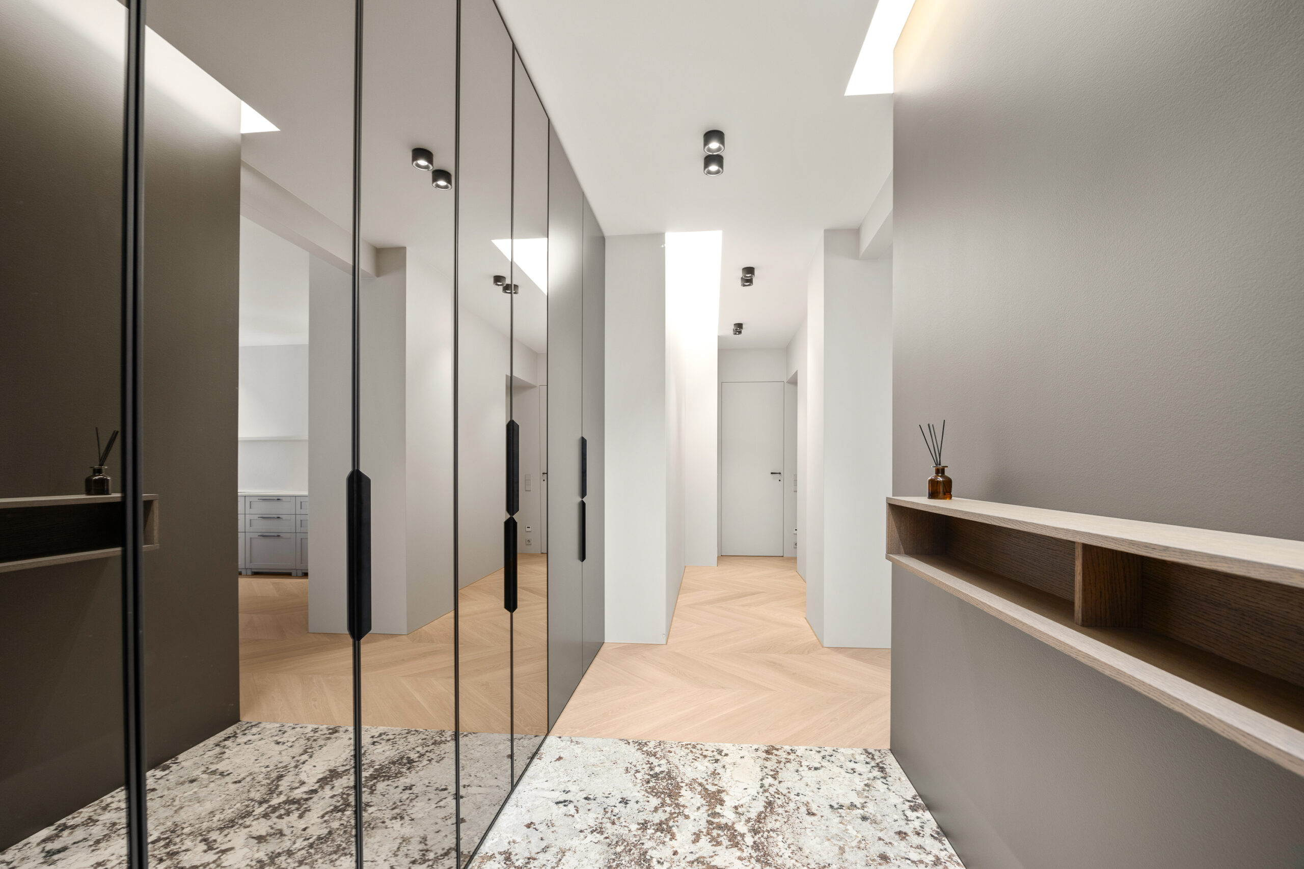 Eluruumide põrandatel prantsuse kalasaba mustris õlitatud tamme parkett. Kogu korteris liistuvabad kõrged siseuksed. Vannitubade seinad ning põrandad on kaetud keraamiliste plaatidega.