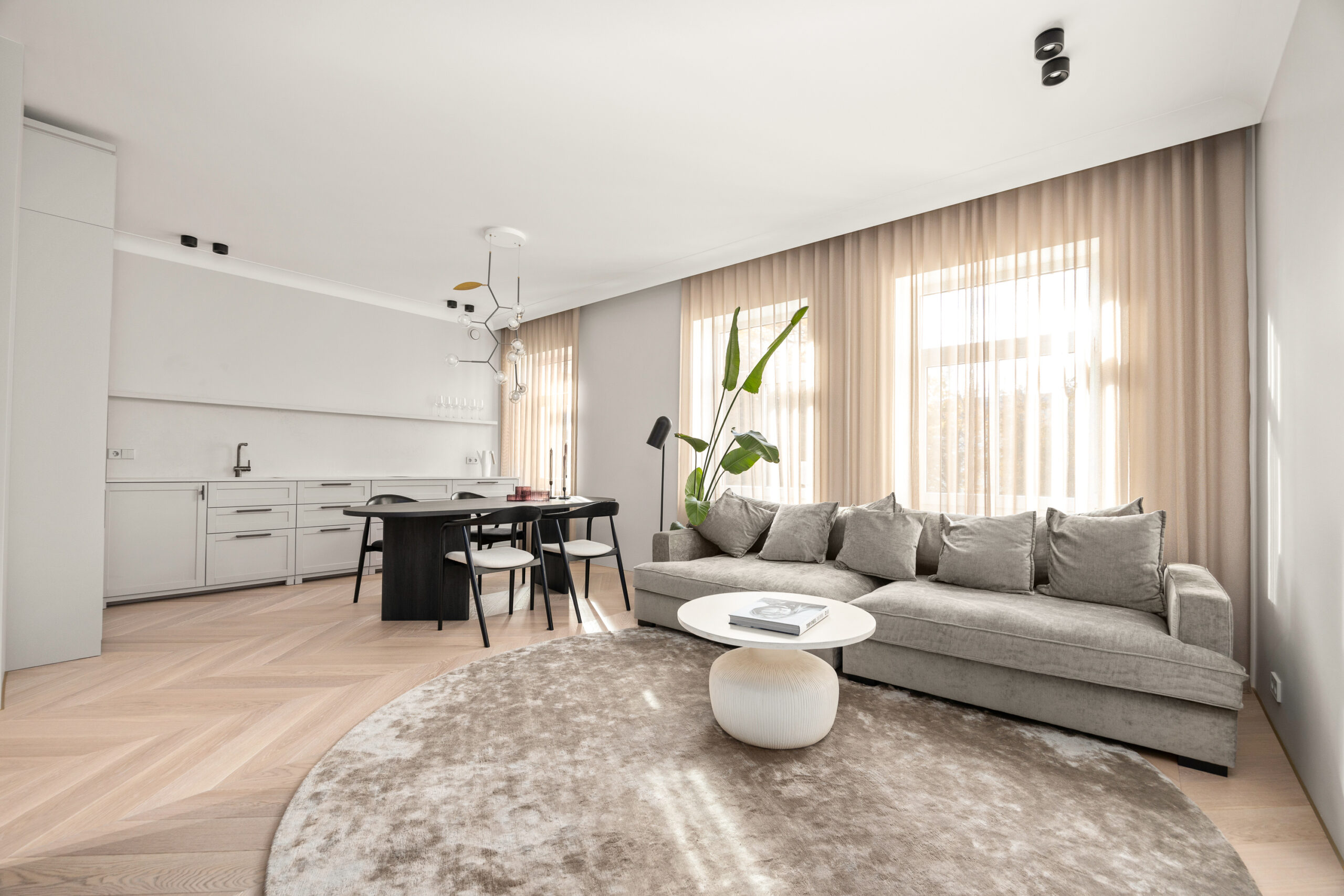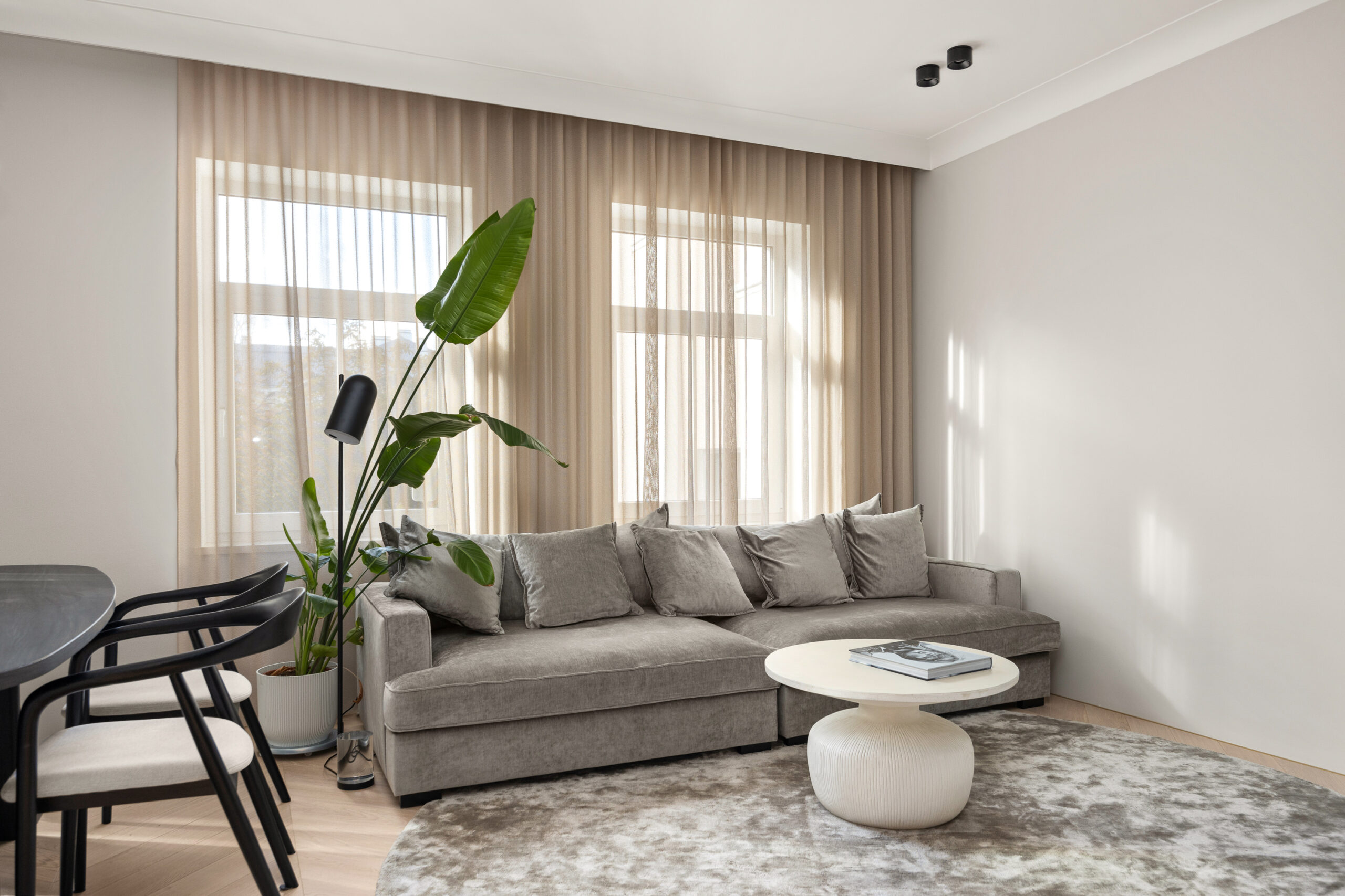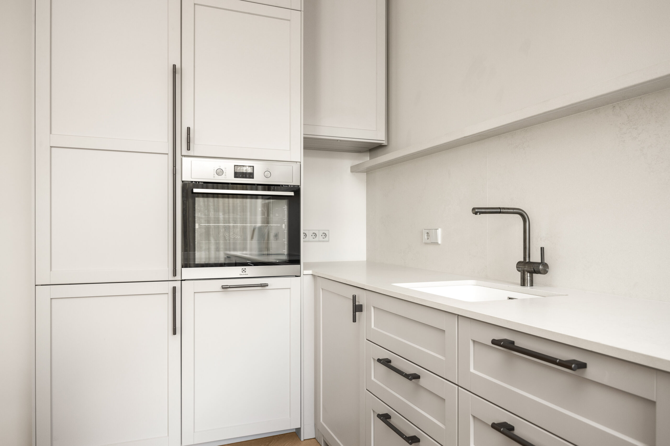 Siseviimistluses läbivalt kasutatud rahulik värvigamma loob korterisse äärmiselt hubase atmosfääri.