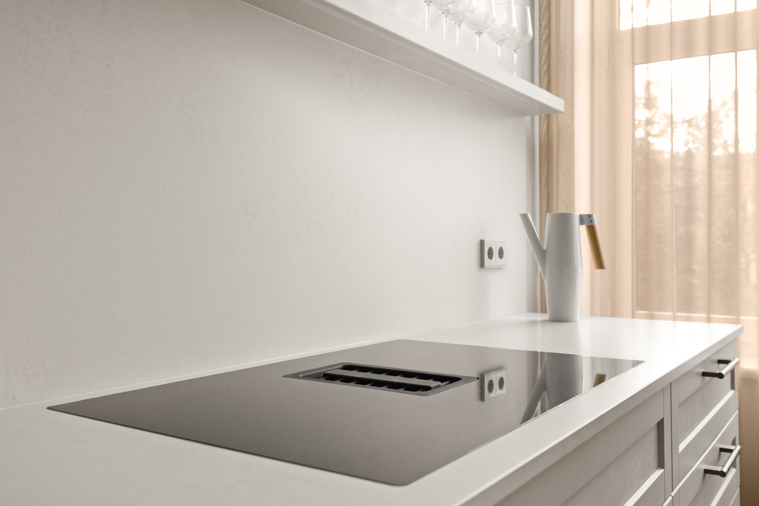 Funktsionaalsesse köögimööblisse on integreeritud kvaliteetne köögitehnika: induktsioonpliit, ahi, mikrolaineahi (Franke) õhupuhastaja väljatõmbega pliidiplaadi keskelt. Lisaks nõudepesumasin ja külmkapp koos sügavkülmaga.