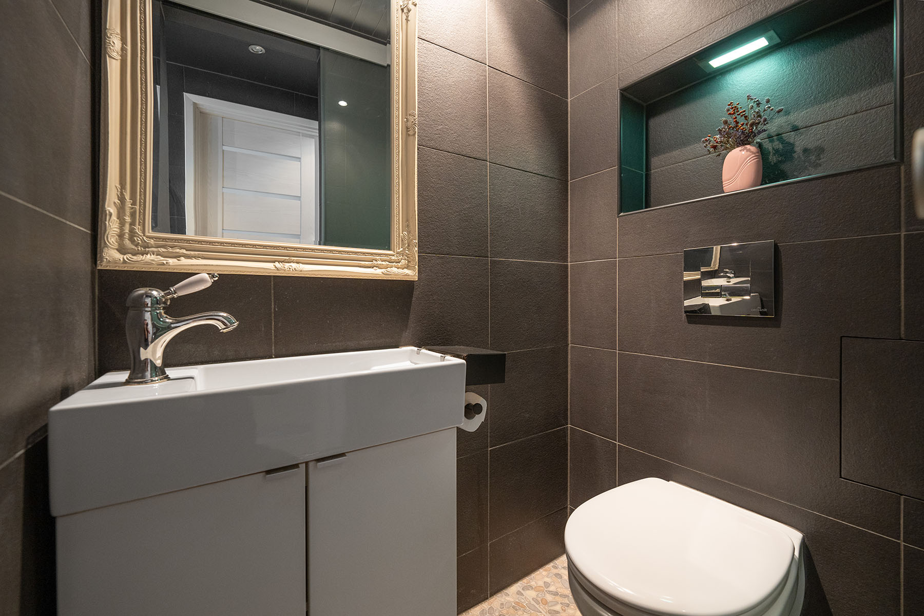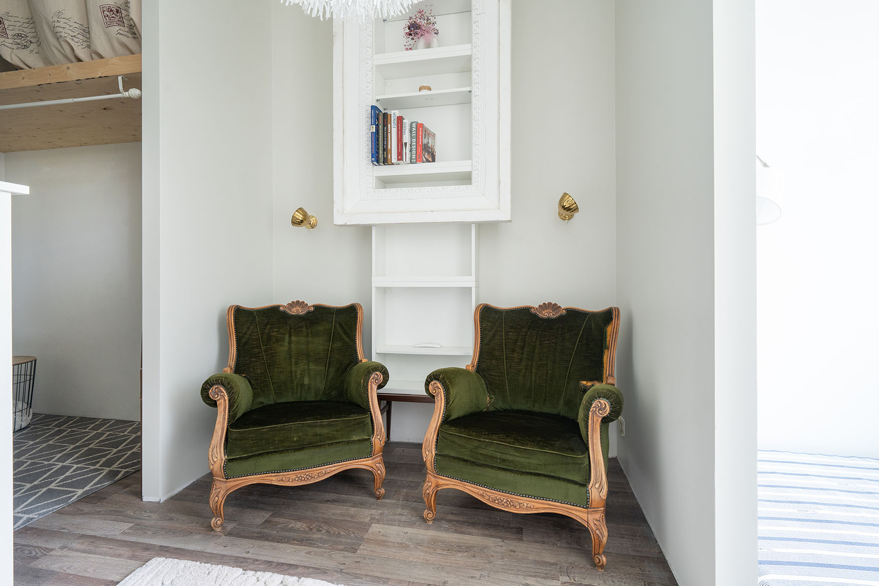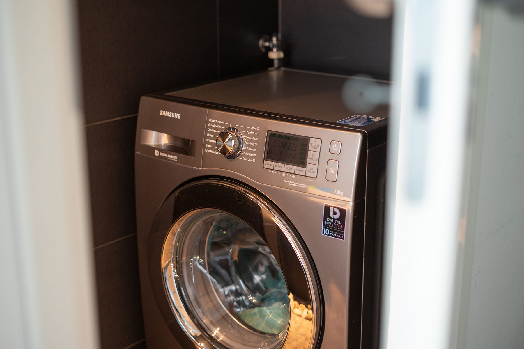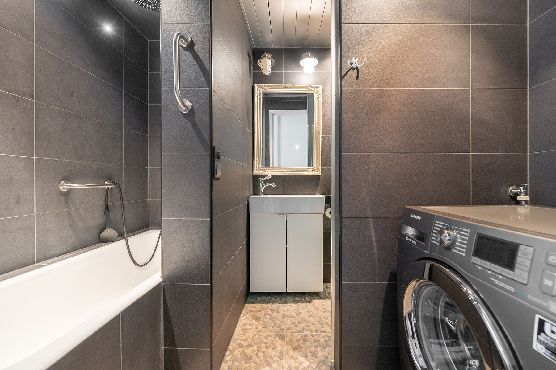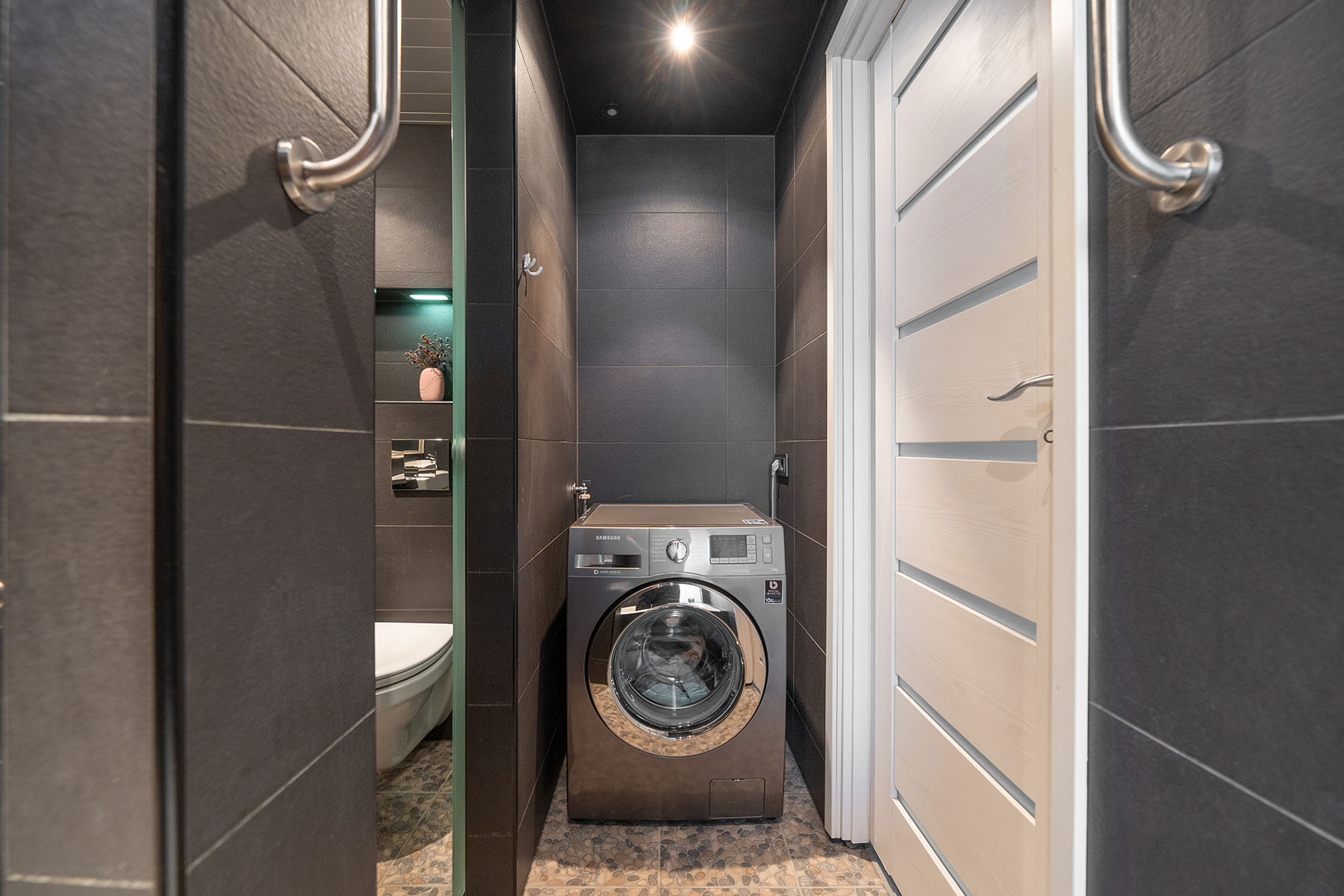 Hubases elutoas on stiilsed tugitoolid ning televiisor. Vannitoas on Samsung pesumasin.