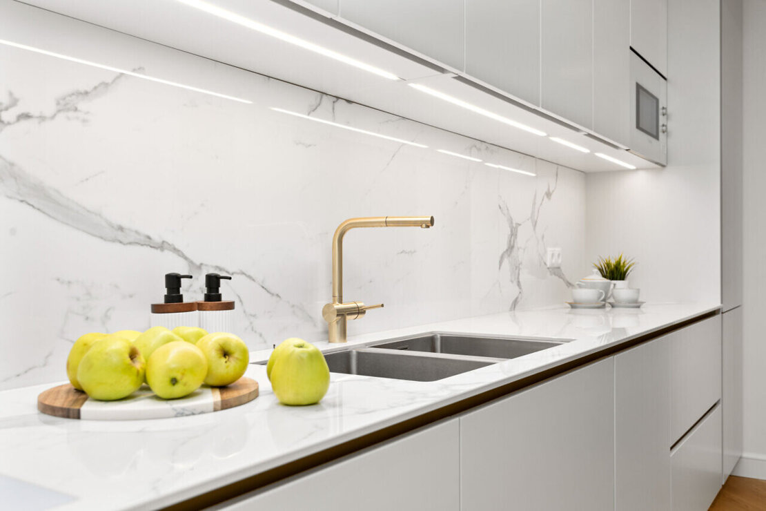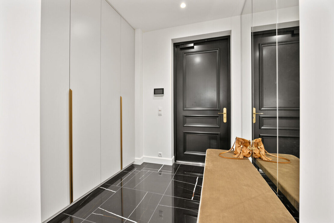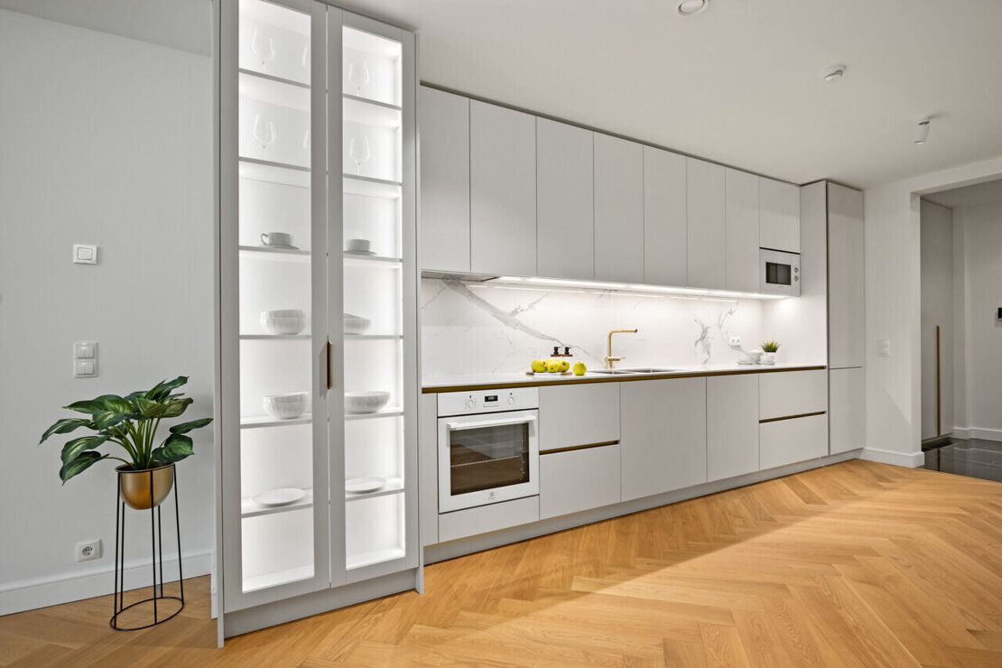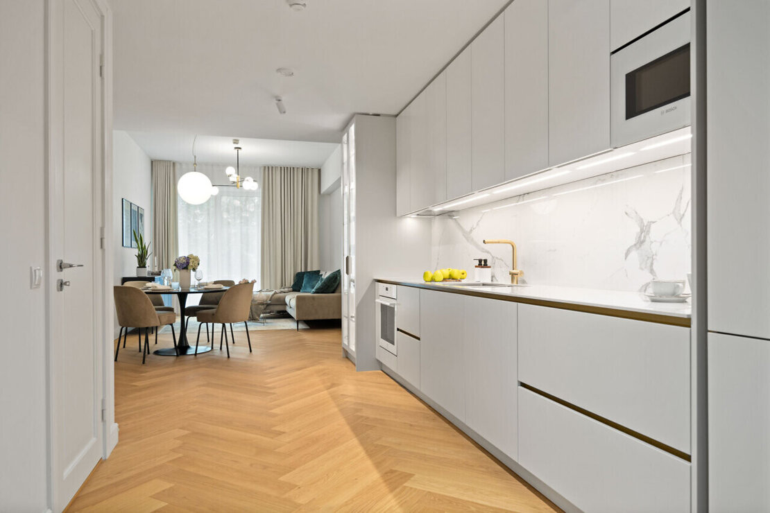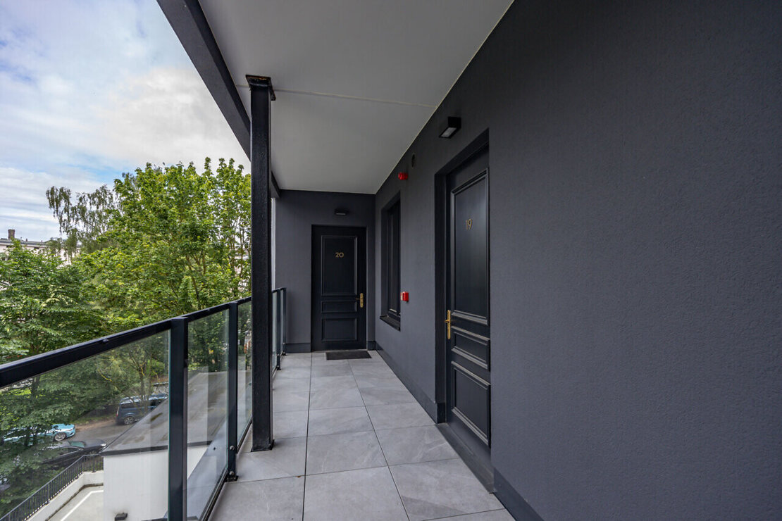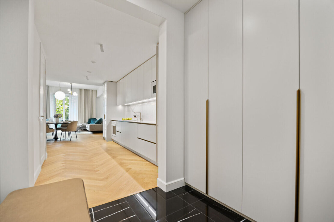 Eluruumide põrandaid katab naturaalne parkett. Vannitoa seinu ja põrandat ilmestab valge marmoriimitatsiooniga plaat. Sanitaarkeraamika on valitud tunnustatud Šveitsi tootjalt Laufen. Ruumide avarust rõhutavad veelgi kõrged tahveluksed ning laed.