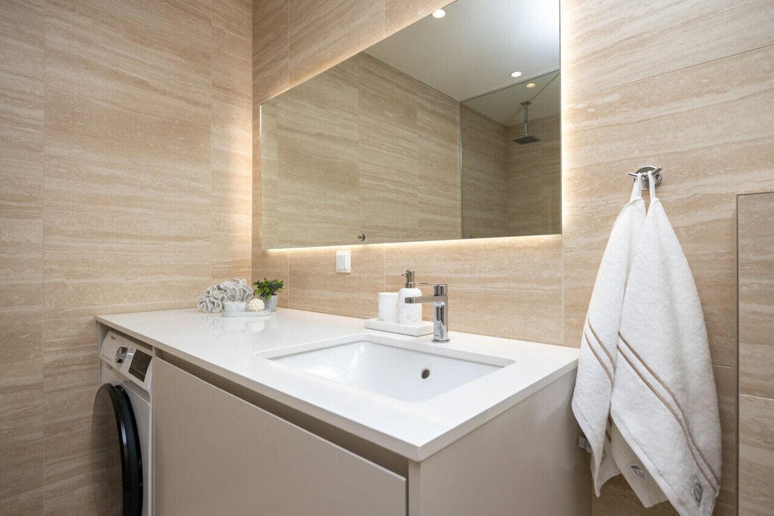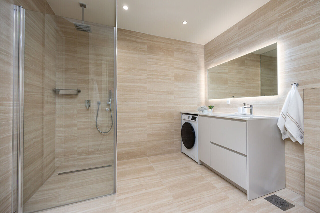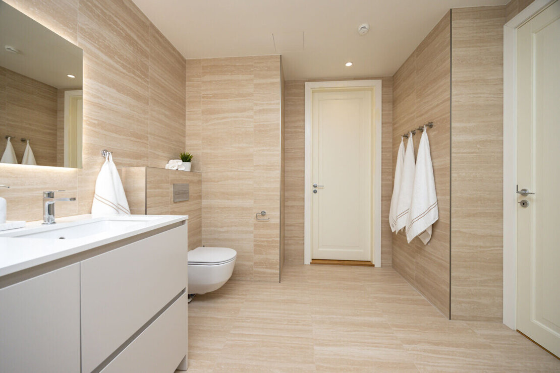Eluruumide põrandaid katab naturaalne parkett. Vannitoa seinu ja põrandat ilmestab naturaalkivi imitatsiooniga plaat. Sanitaarkeraamika on valitud tunnustatud Šveitsi tootjalt Laufen. Ruumide avarust rõhutavad veelgi kõrged tahveluksed ning laed.