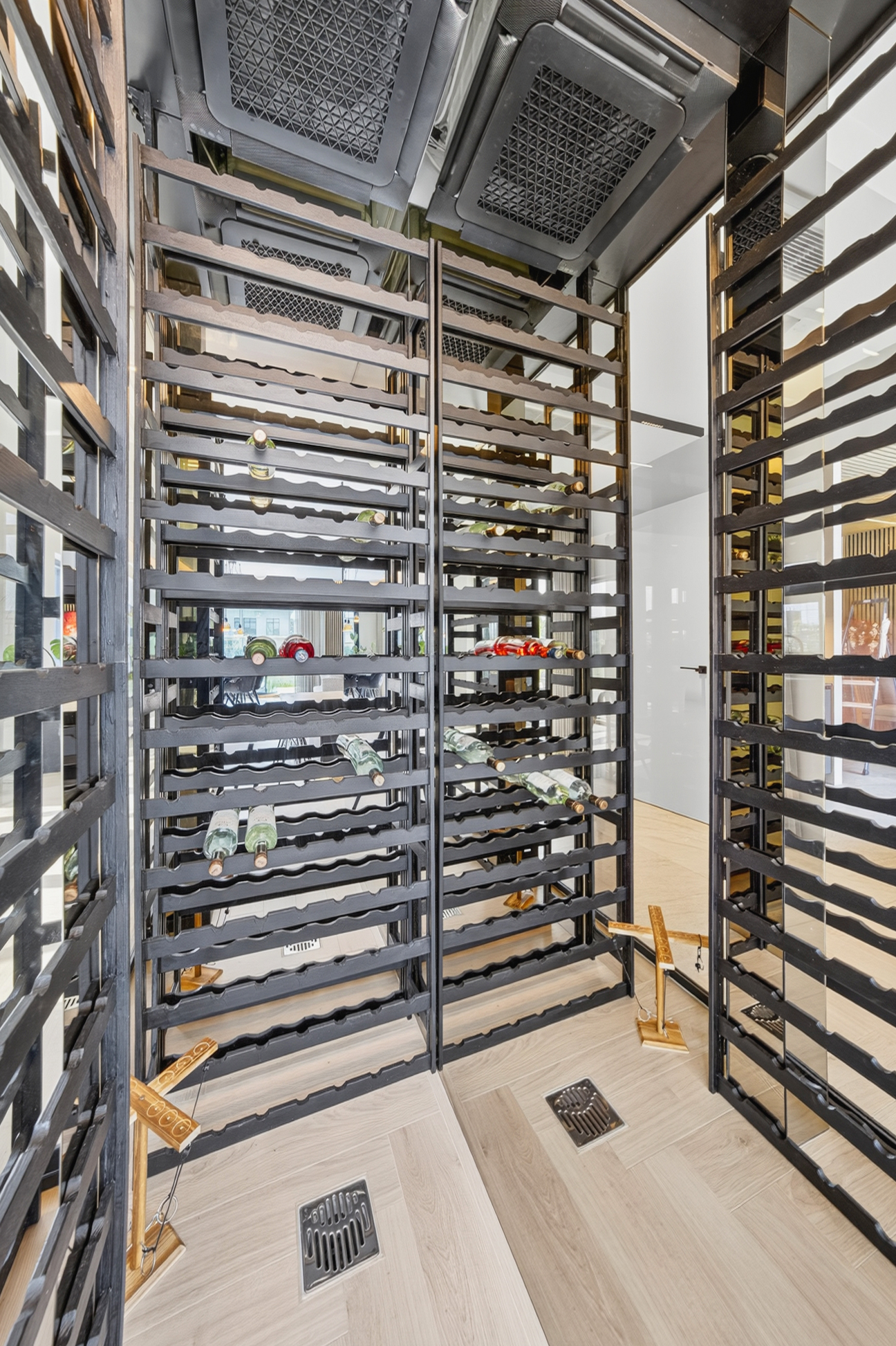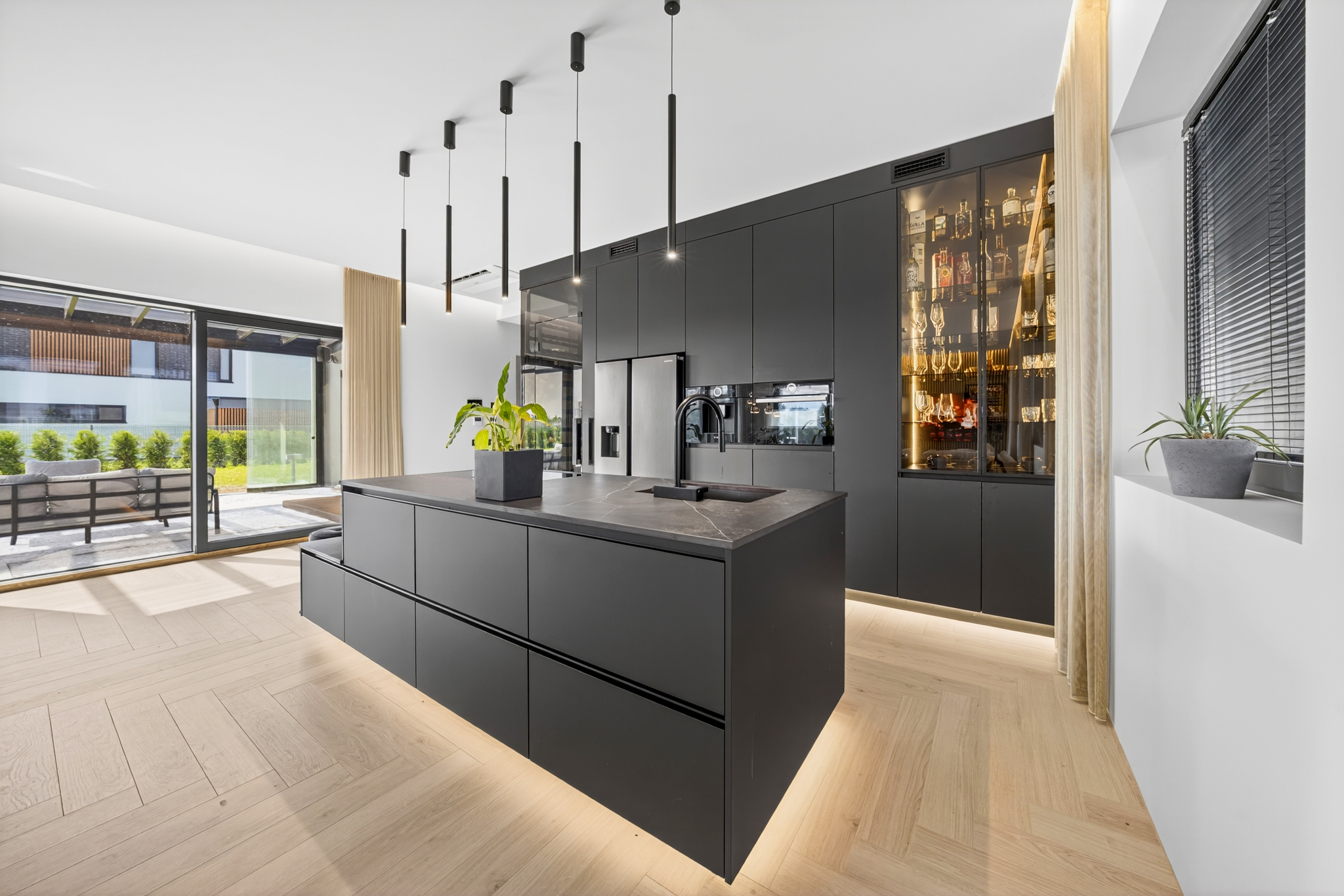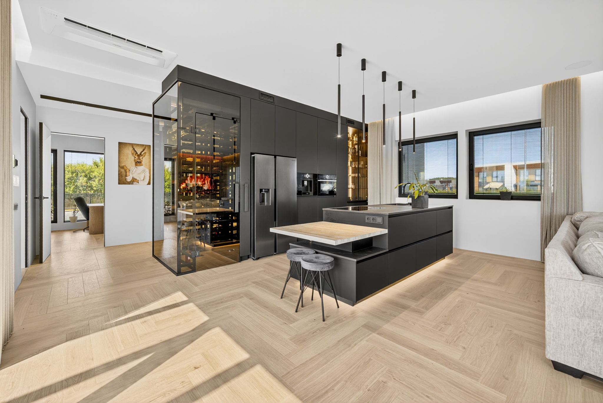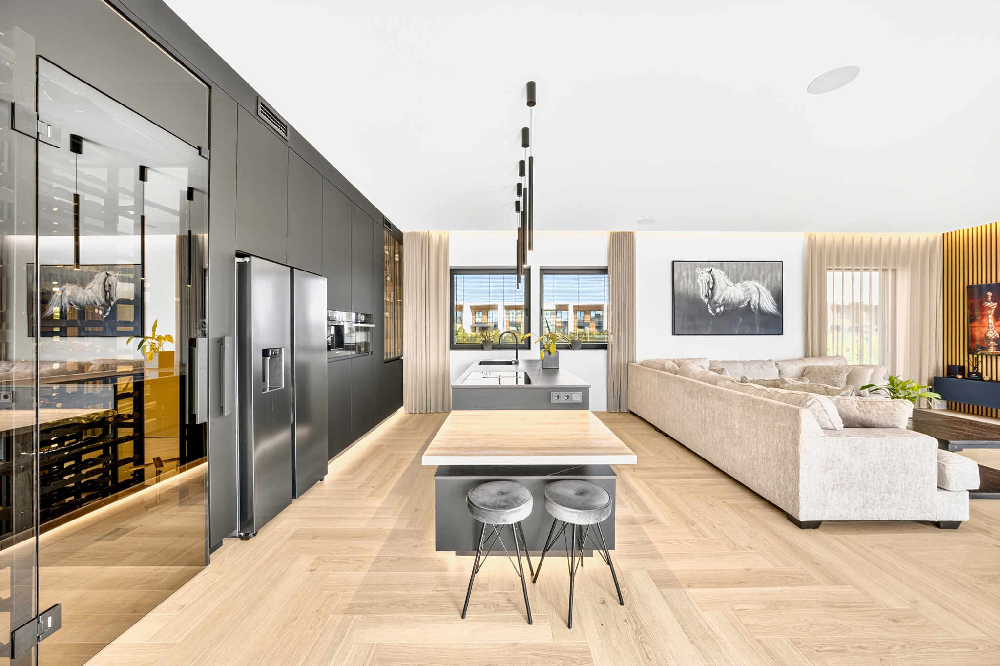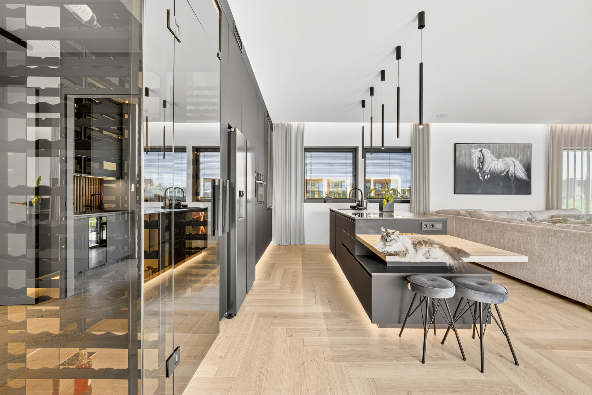 Köögi ja elutoa avar planeering on ideaalne ka seltskondlikumate koosviibimiste korraldamiseks. Köögis on Pintseli poolt eritellimusel valminud köögimööbel, mis on ühtaegu nii kvaliteetne kui ka funktsionaalne, kuna kasutatud on kõrgeima kvaliteedi materjale ning ajatu disainiga moodsaid kodumasinad. Köögimööblisse on integreeritud Bosch ahi, induktsioonpliit, kubu, nõudepesumasin, kohvimasin ning Samsung külmkapp koos sügavkülmiku ja jäämasinaga. Lisaks ootab selles stiilses kodus veinisõpra elegantne täisklaasist walk-in veinikülmik – tõeline unistus igale kollektsionäärile. Klaaspinnad toovad esile sisu ilu, samas kui nutikas temperatuurikontroll loob ideaalsed säilitustingimused.