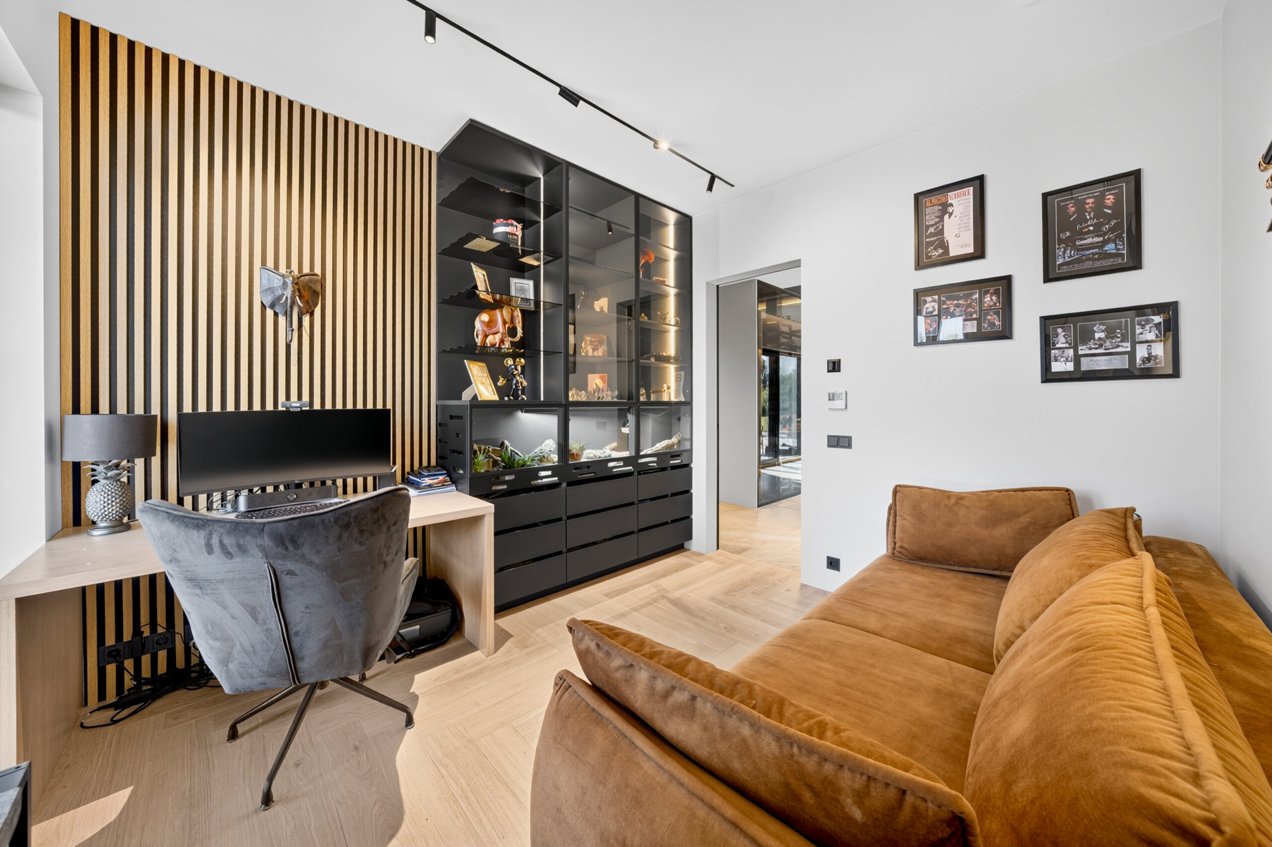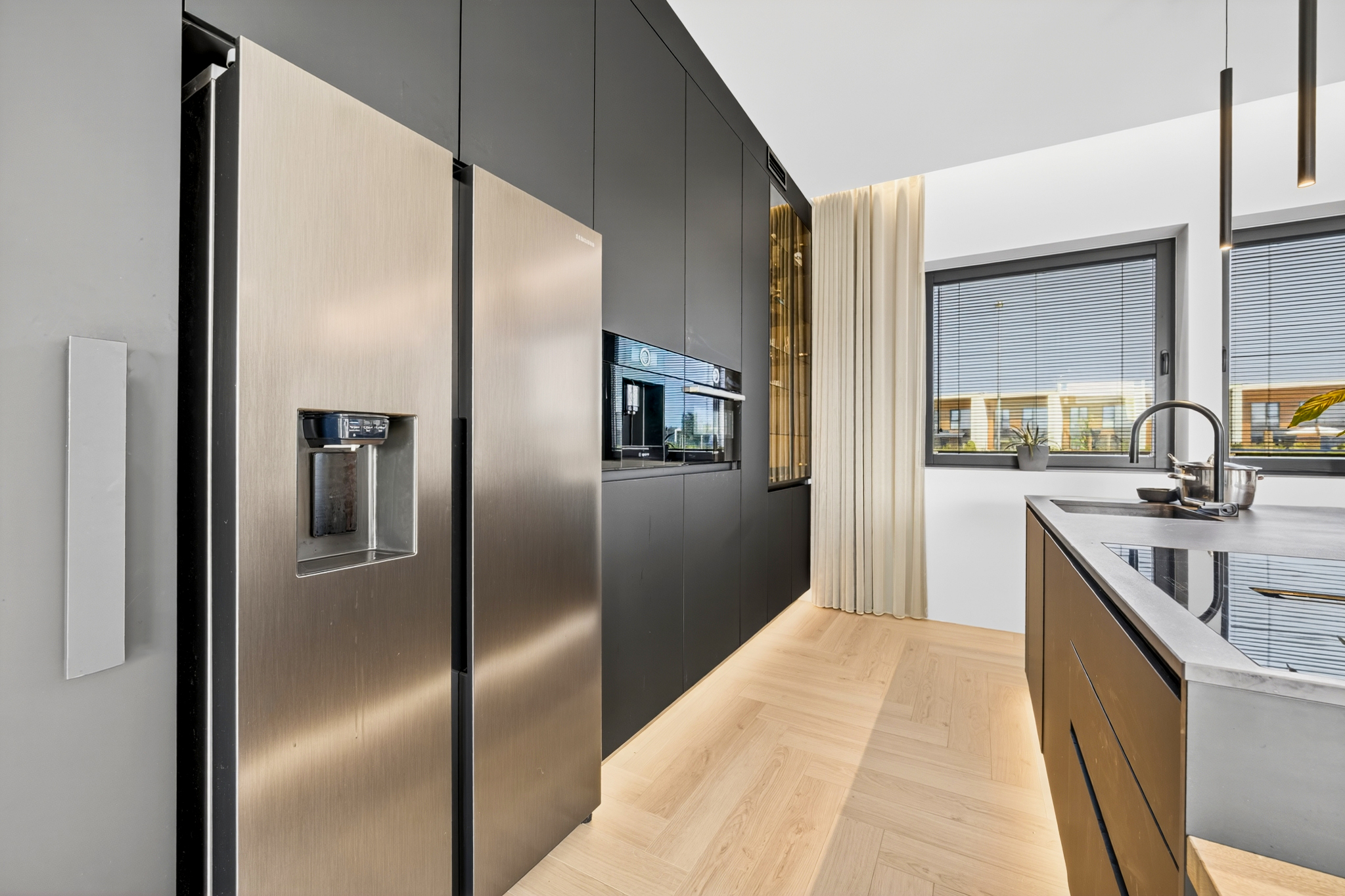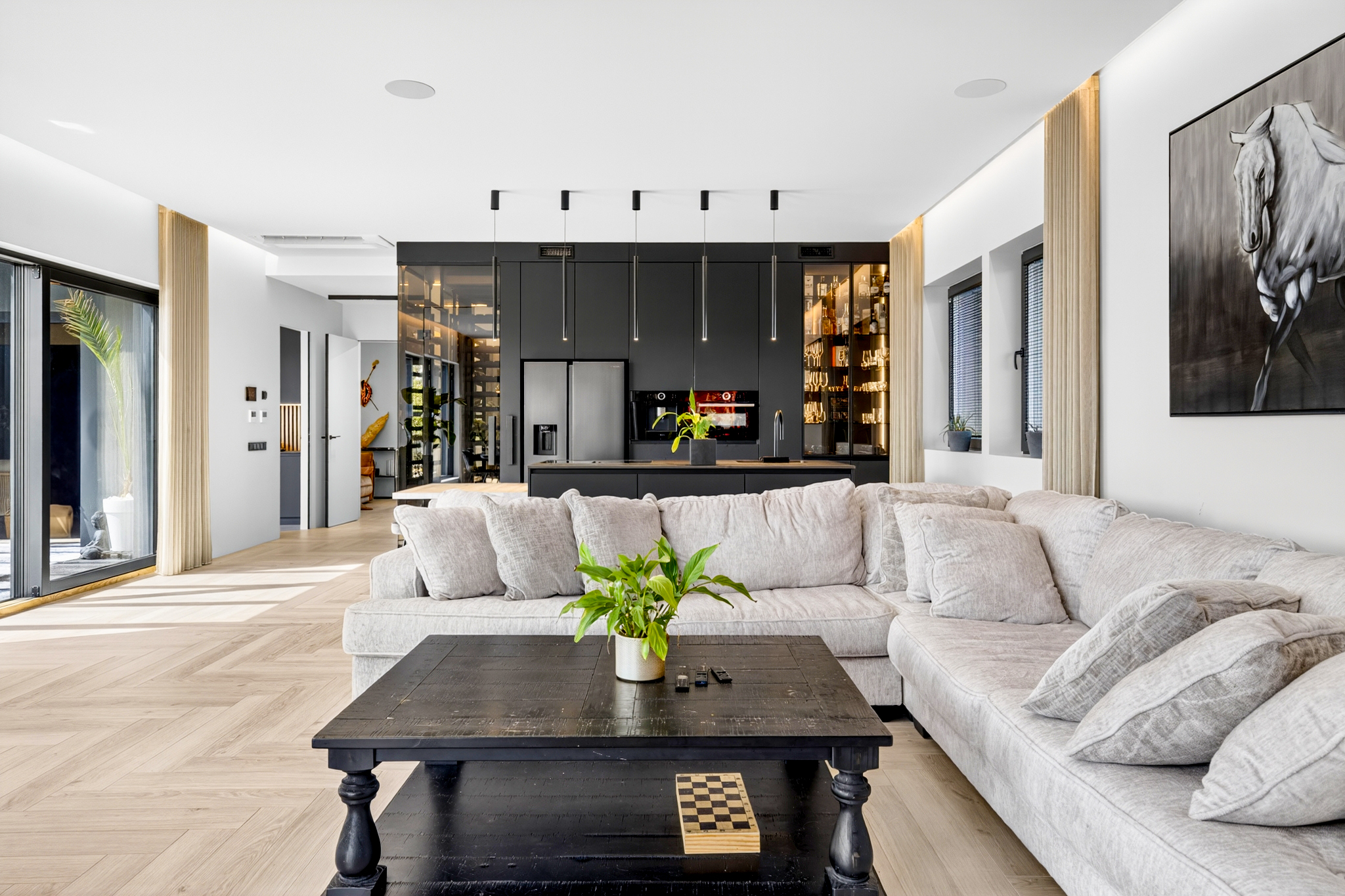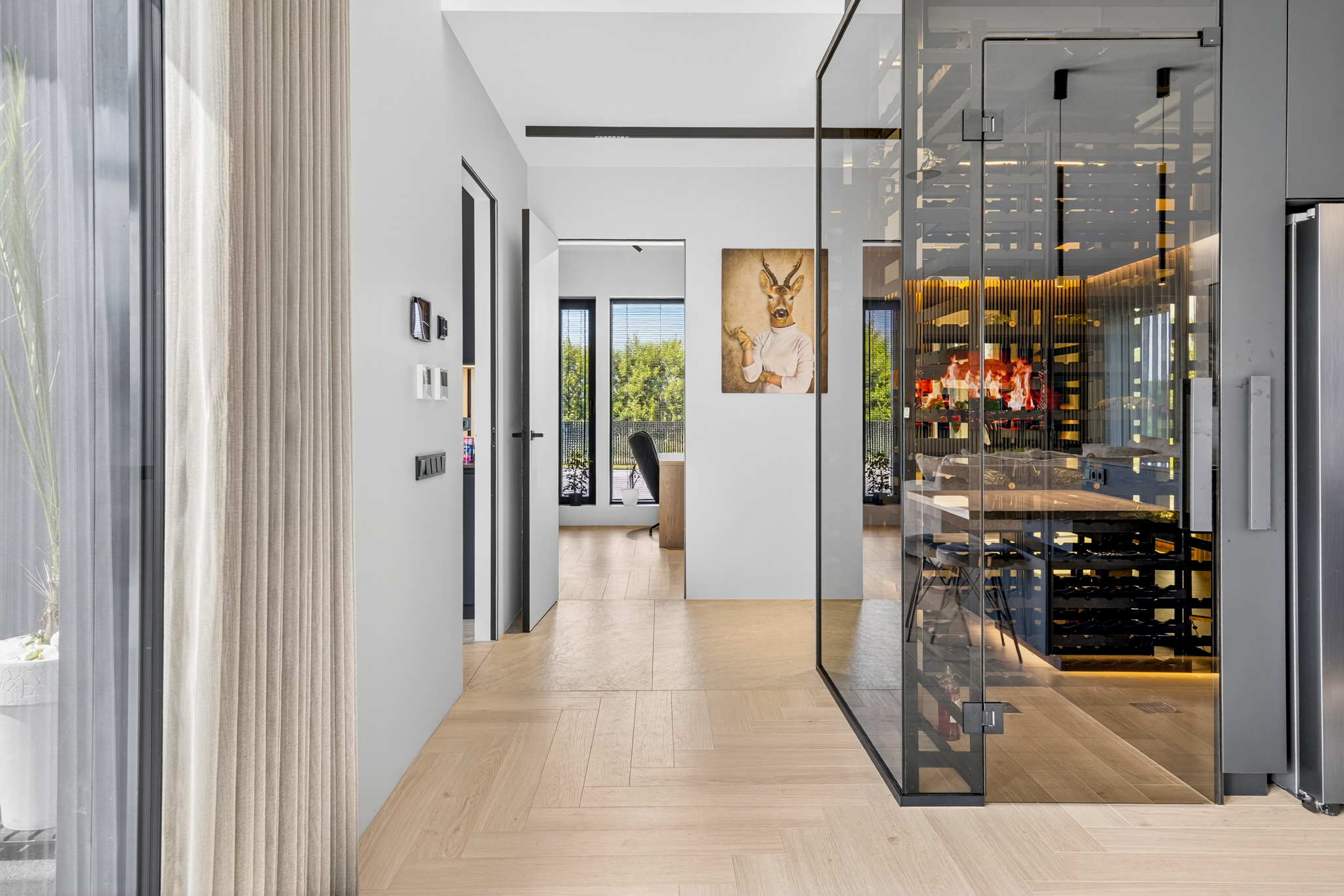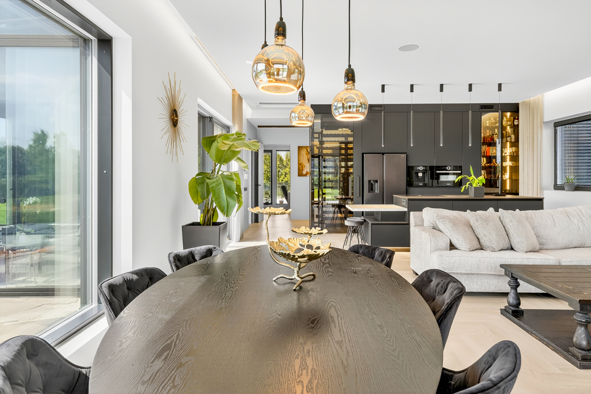 Köögi ja elutoa avar planeering on ideaalne ka seltskondlikumate koosviibimiste korraldamiseks. Köögis on Pintseli poolt eritellimusel valminud köögimööbel, mis on ühtaegu nii kvaliteetne kui ka funktsionaalne, kuna kasutatud on kõrgeima kvaliteedi materjale ning ajatu disainiga moodsaid kodumasinad. Köögimööblisse on integreeritud Bosch ahi, induktsioonpliit, kubu, nõudepesumasin, kohvimasin ning Samsung külmkapp koos sügavkülmiku ja jäämasinaga. Lisaks ootab selles stiilses kodus veinisõpra elegantne täisklaasist walk-in veinikülmik – tõeline unistus igale kollektsionäärile. Klaaspinnad toovad esile sisu ilu, samas kui nutikas temperatuurikontroll loob ideaalsed säilitustingimused.