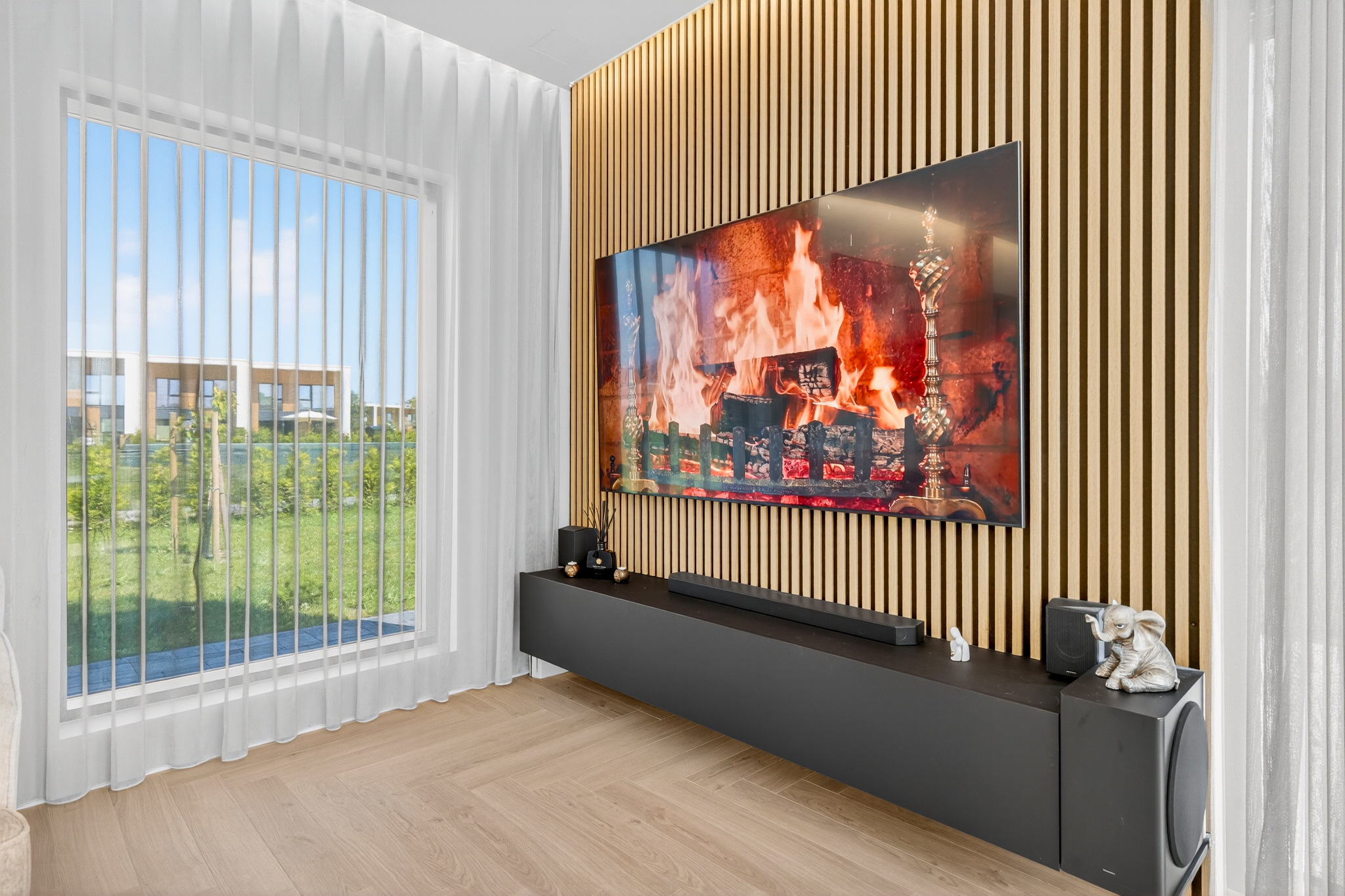 Elutoas on lameekraaniga Samsung TV koos Bowers ja Wilkins helisüsteemiga. Kõlarid on paigaldatud kogu alumisele korrusele, k.a terrassile.