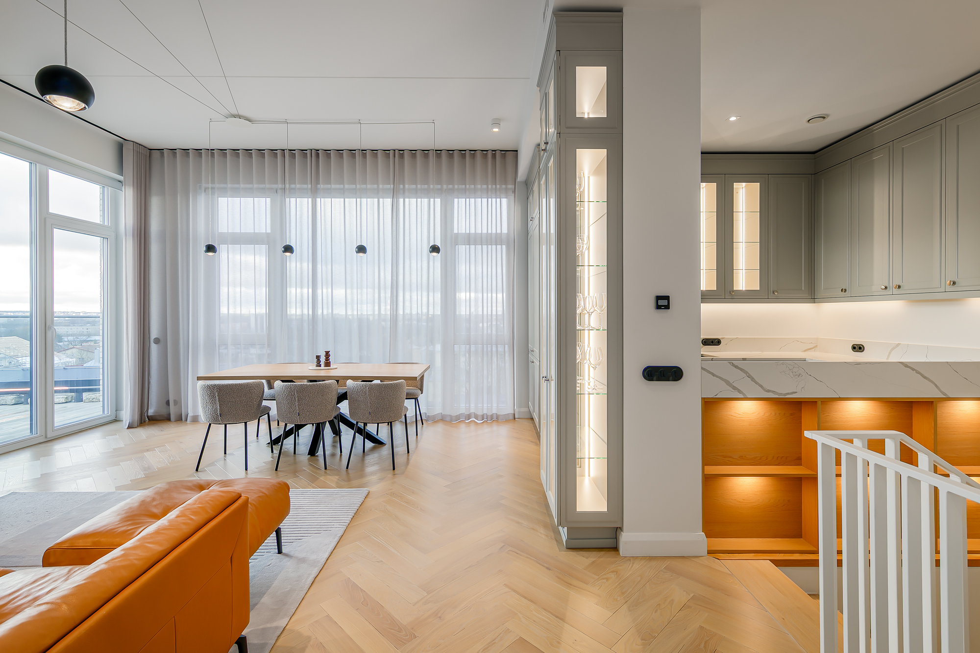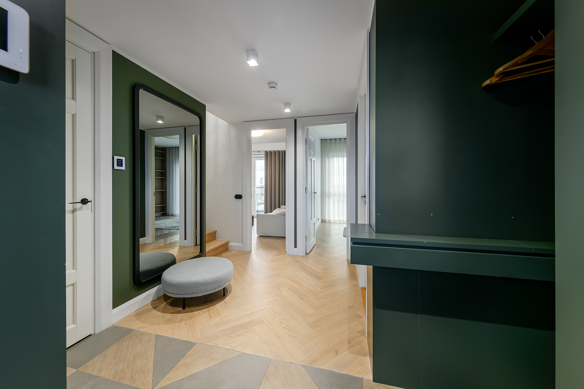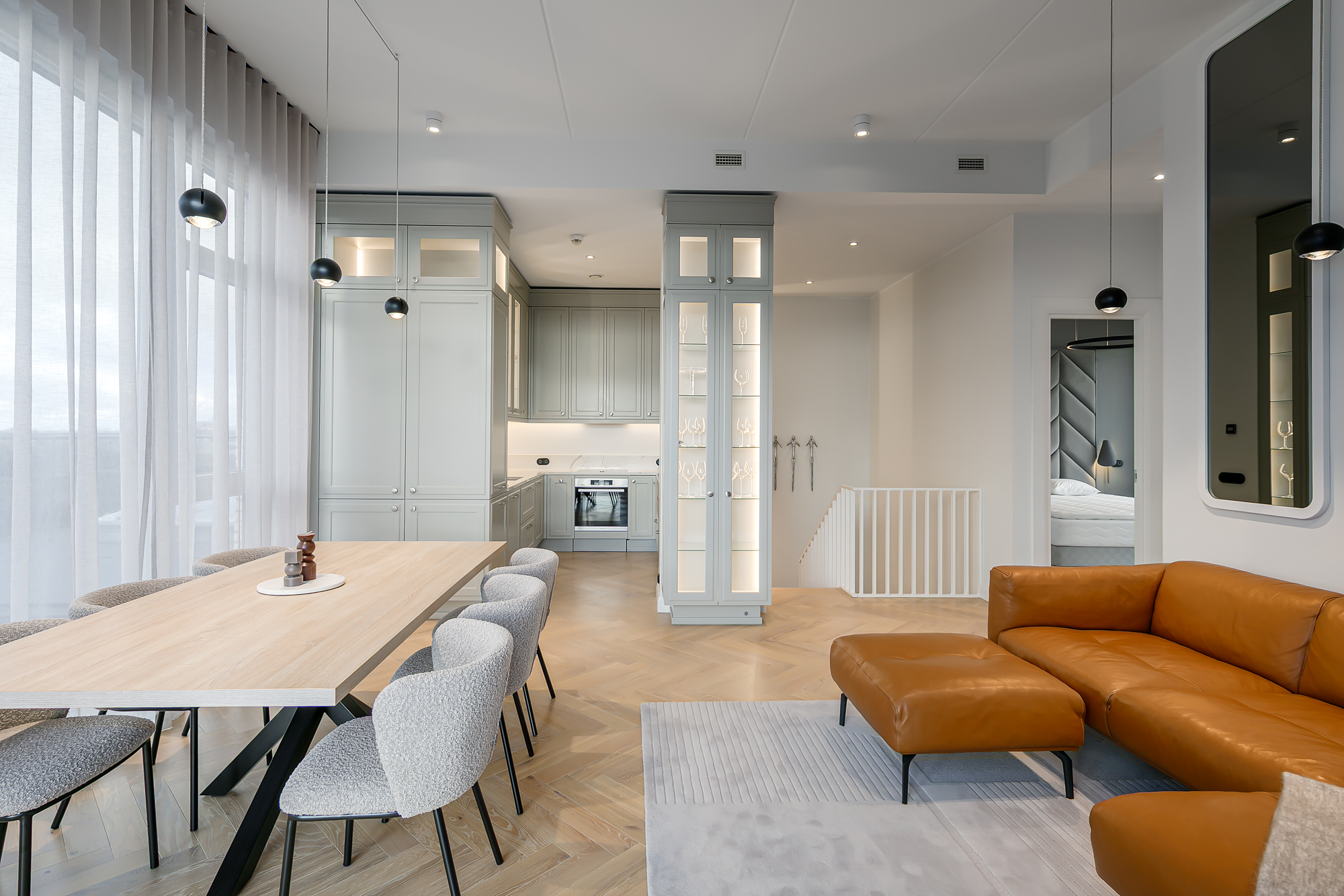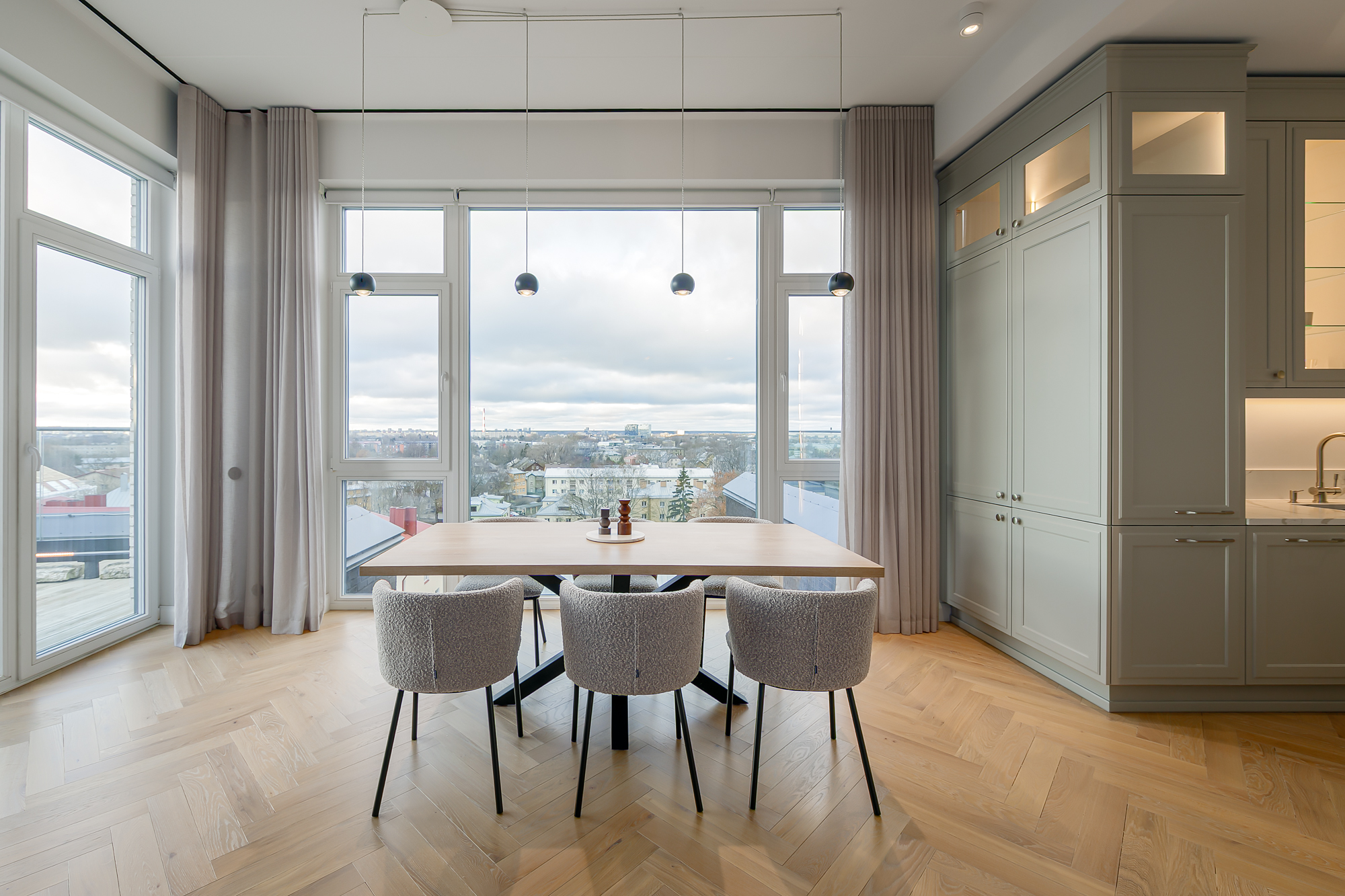 Korteri siseviimistlus on inspireeritud Art Deco elegantsist: põrandaid katab naturaalne tamme kalasabaparkett, kõrged profiiliga siseuksed ja eksklusiivselt viimistletud sanitaarruumid annavad kodule luksusliku iseloomu. Aknad on maast laeni puitalumiiniumprofiiliga, tuues tuppa rohkelt valgust. Interjööris kohtuvad modernsed lahendused ja ajatu disain, mida toetavad rahulik värvigamma ja kvaliteetsed materjalid.