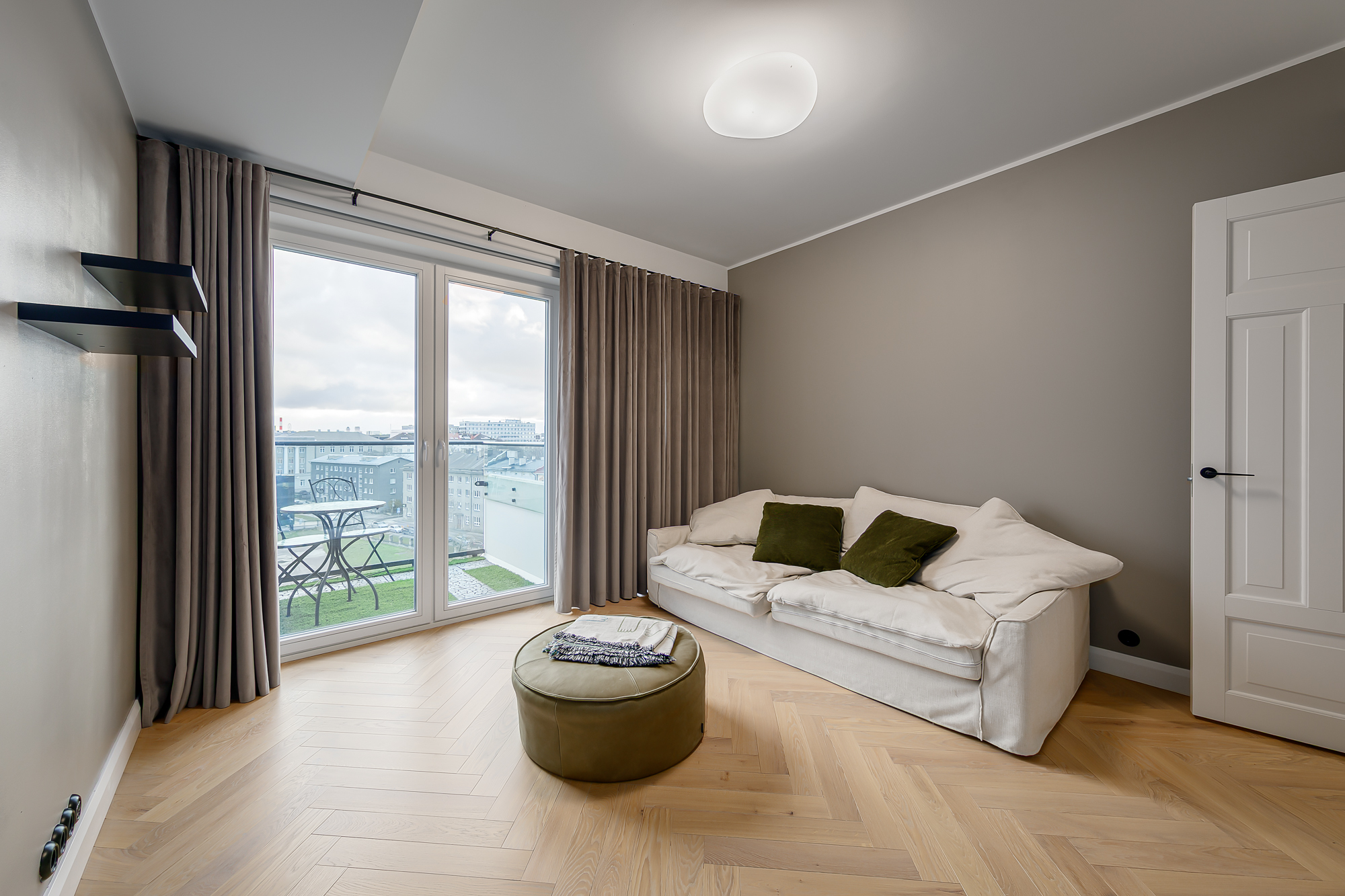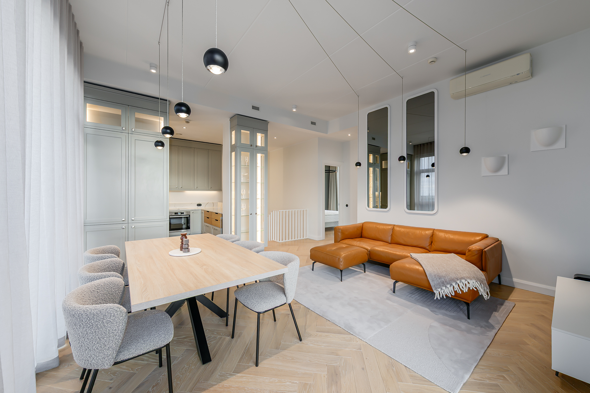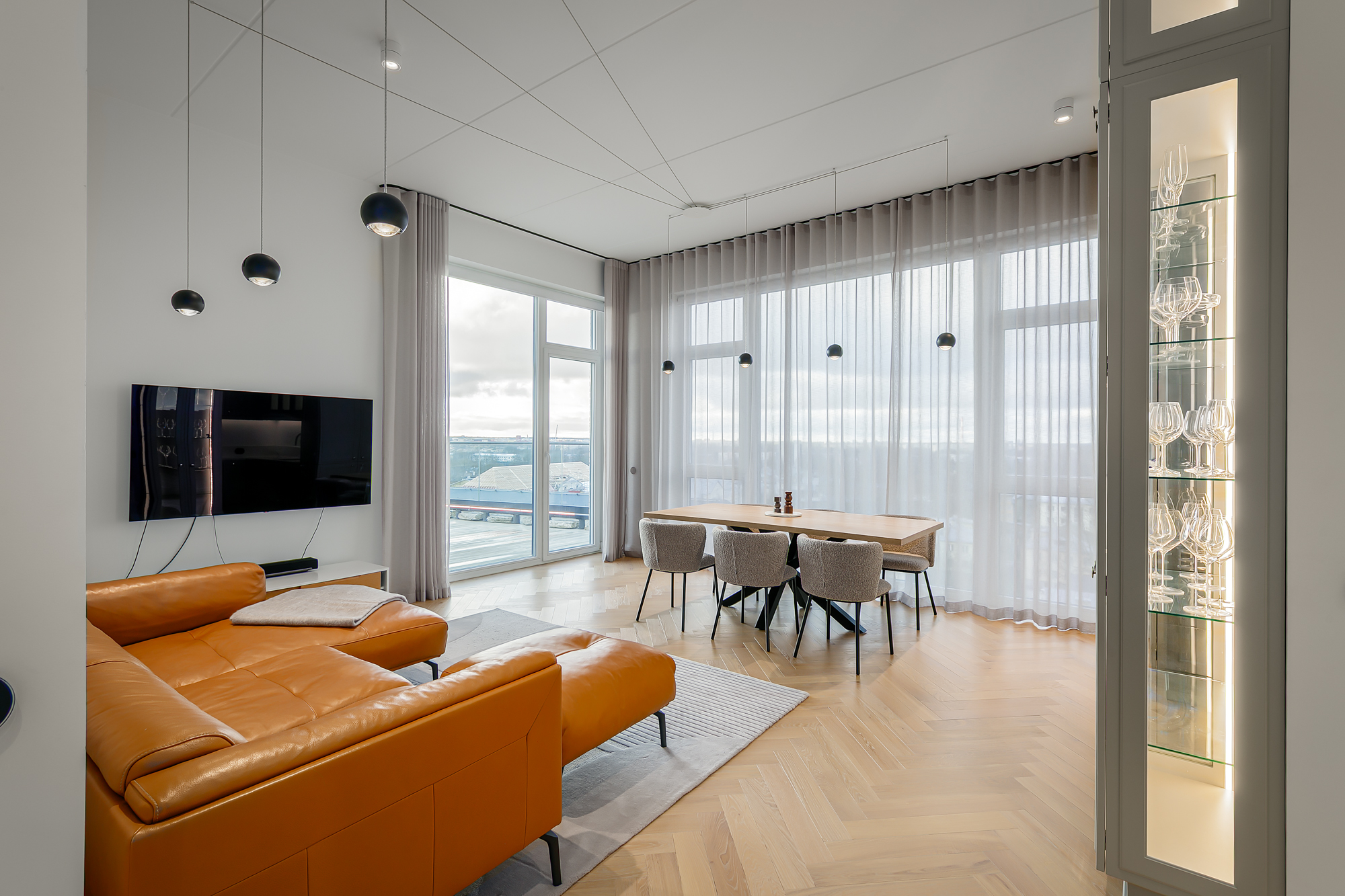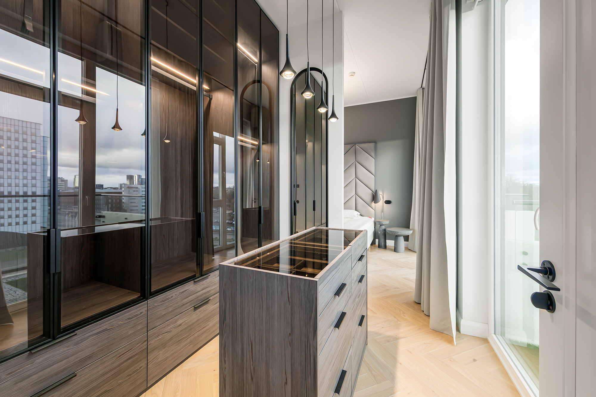 Korteri siseviimistlus on inspireeritud Art Deco elegantsist: põrandaid katab naturaalne tamme kalasabaparkett, kõrged profiiliga siseuksed ja eksklusiivselt viimistletud sanitaarruumid annavad kodule luksusliku iseloomu. Aknad on maast laeni puitalumiiniumprofiiliga, tuues tuppa rohkelt valgust. Interjööris kohtuvad modernsed lahendused ja ajatu disain, mida toetavad rahulik värvigamma ja kvaliteetsed materjalid.