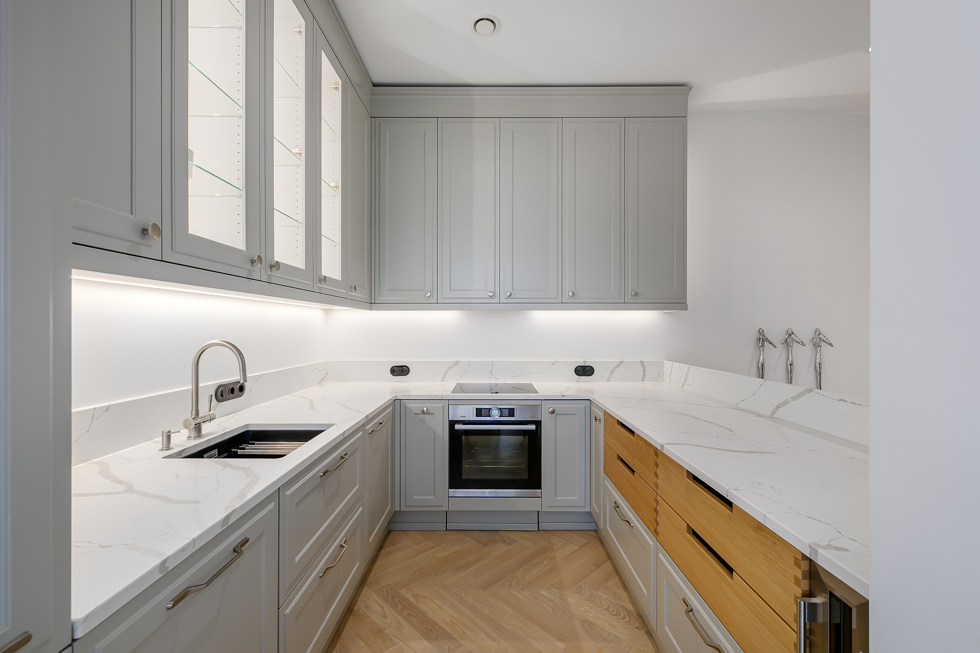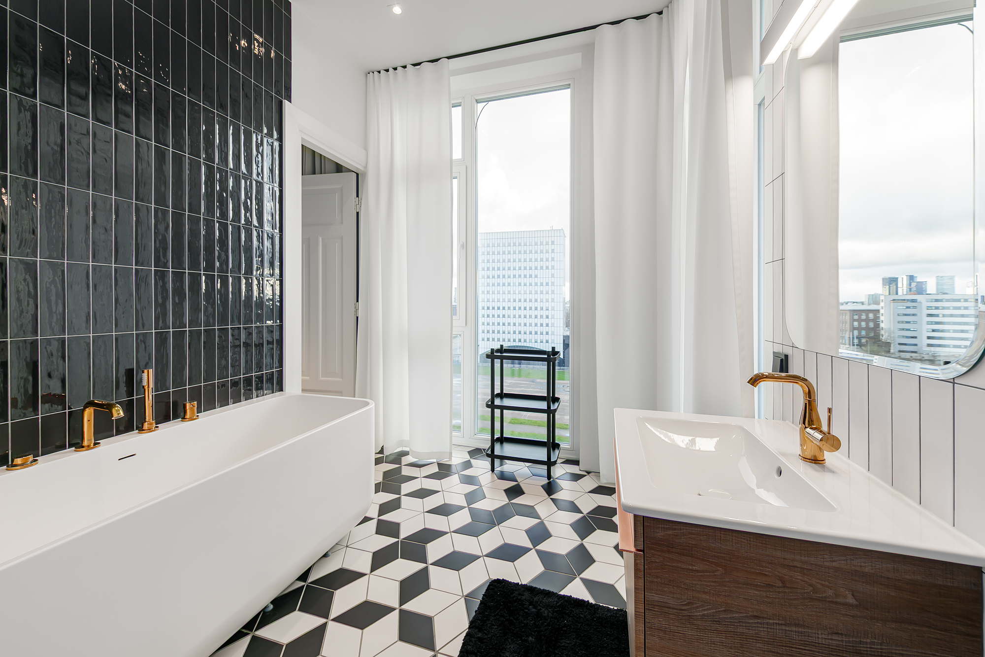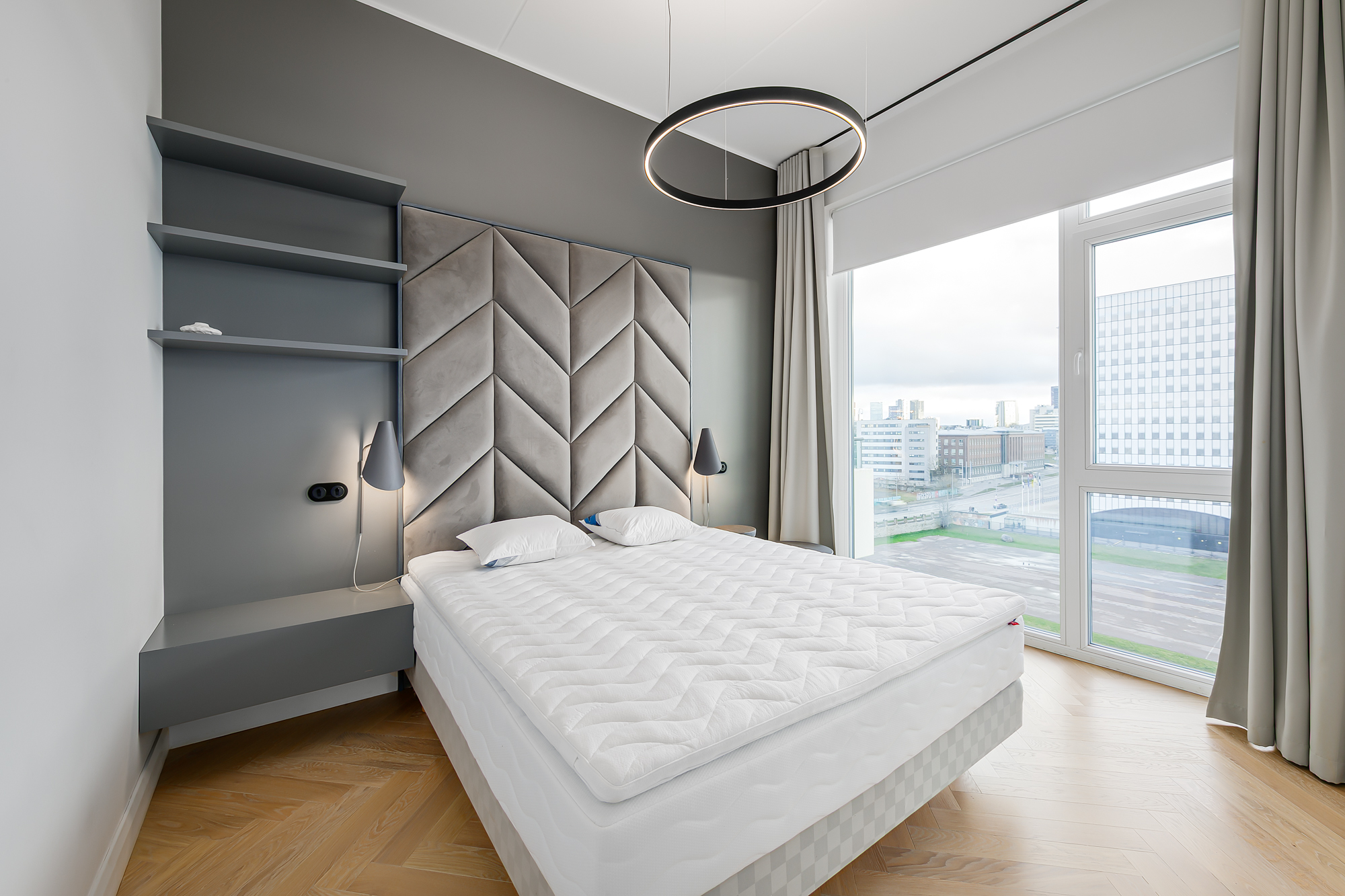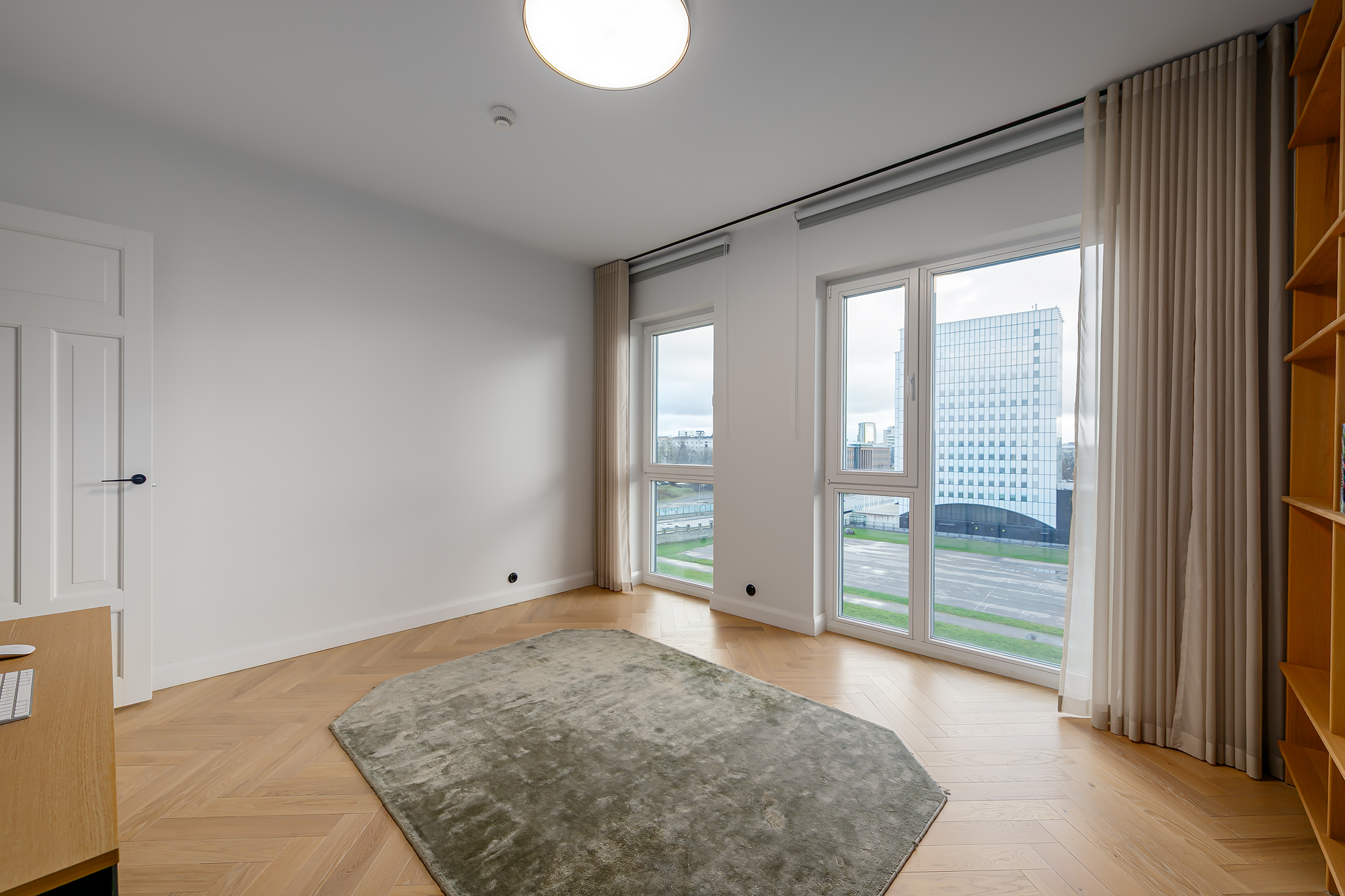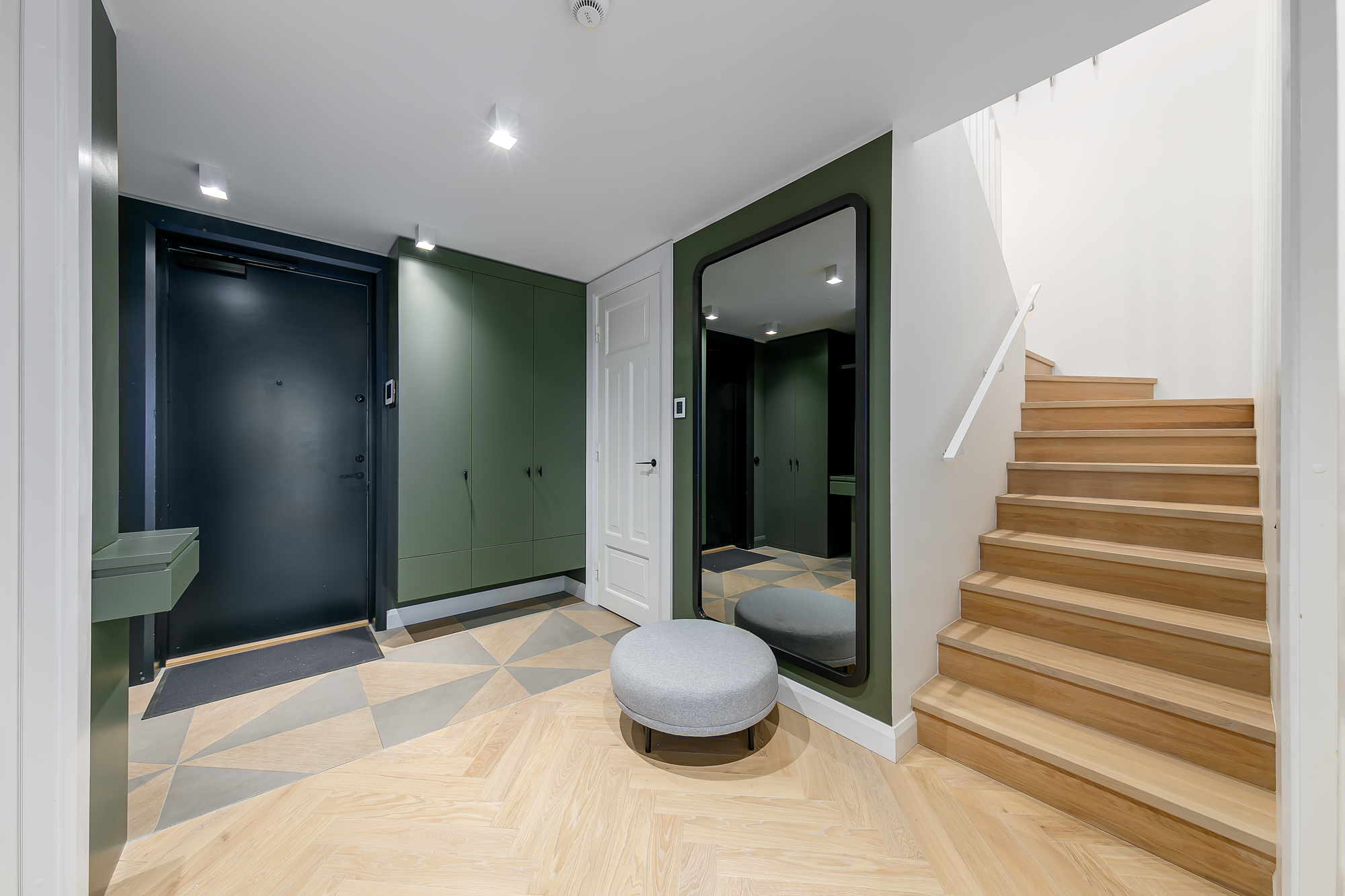 Korteri siseviimistlus on inspireeritud Art Deco elegantsist: põrandaid katab naturaalne tamme kalasabaparkett, kõrged profiiliga siseuksed ja eksklusiivselt viimistletud sanitaarruumid annavad kodule luksusliku iseloomu. Aknad on maast laeni puitalumiiniumprofiiliga, tuues tuppa rohkelt valgust. Interjööris kohtuvad modernsed lahendused ja ajatu disain, mida toetavad rahulik värvigamma ja kvaliteetsed materjalid.