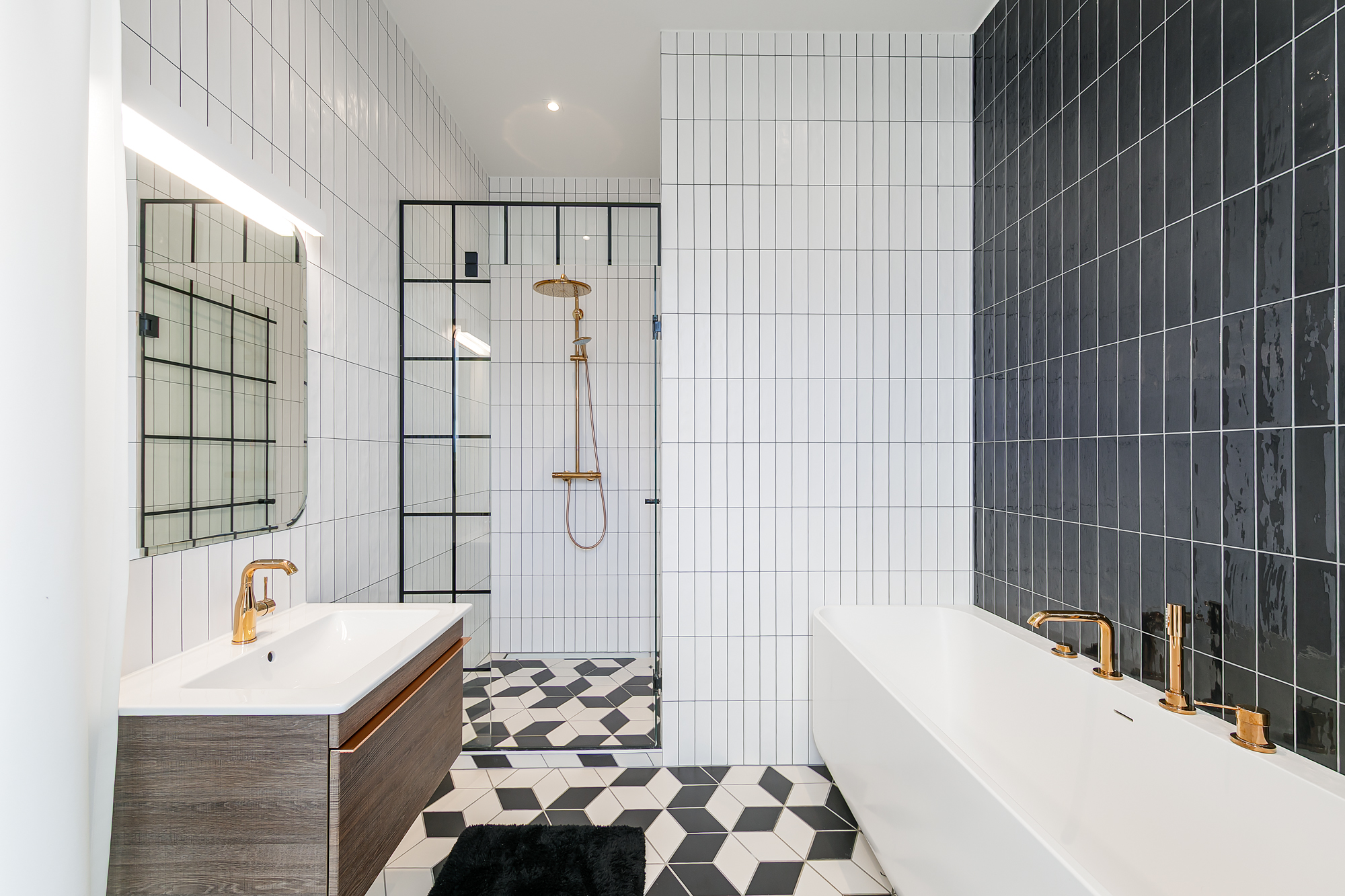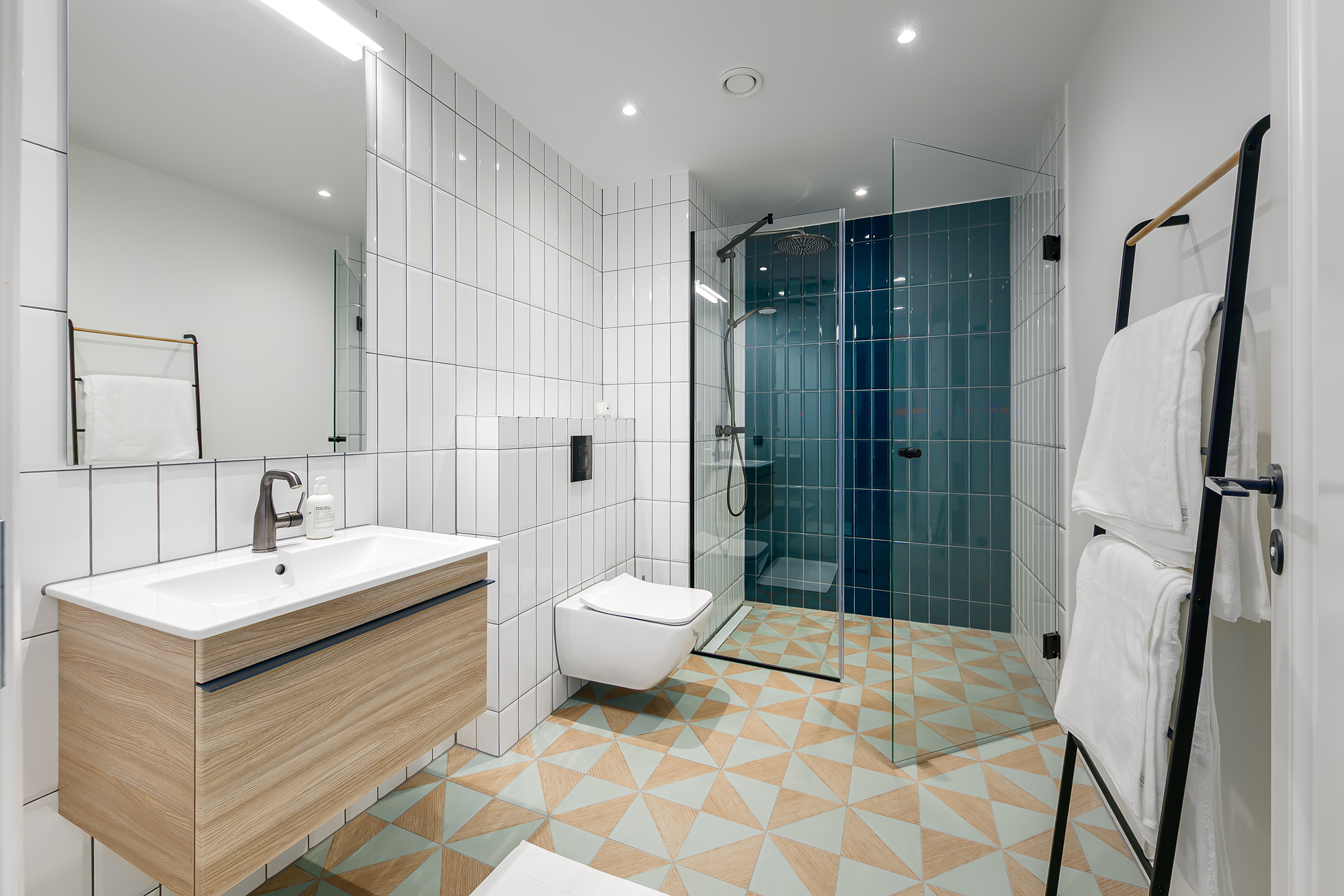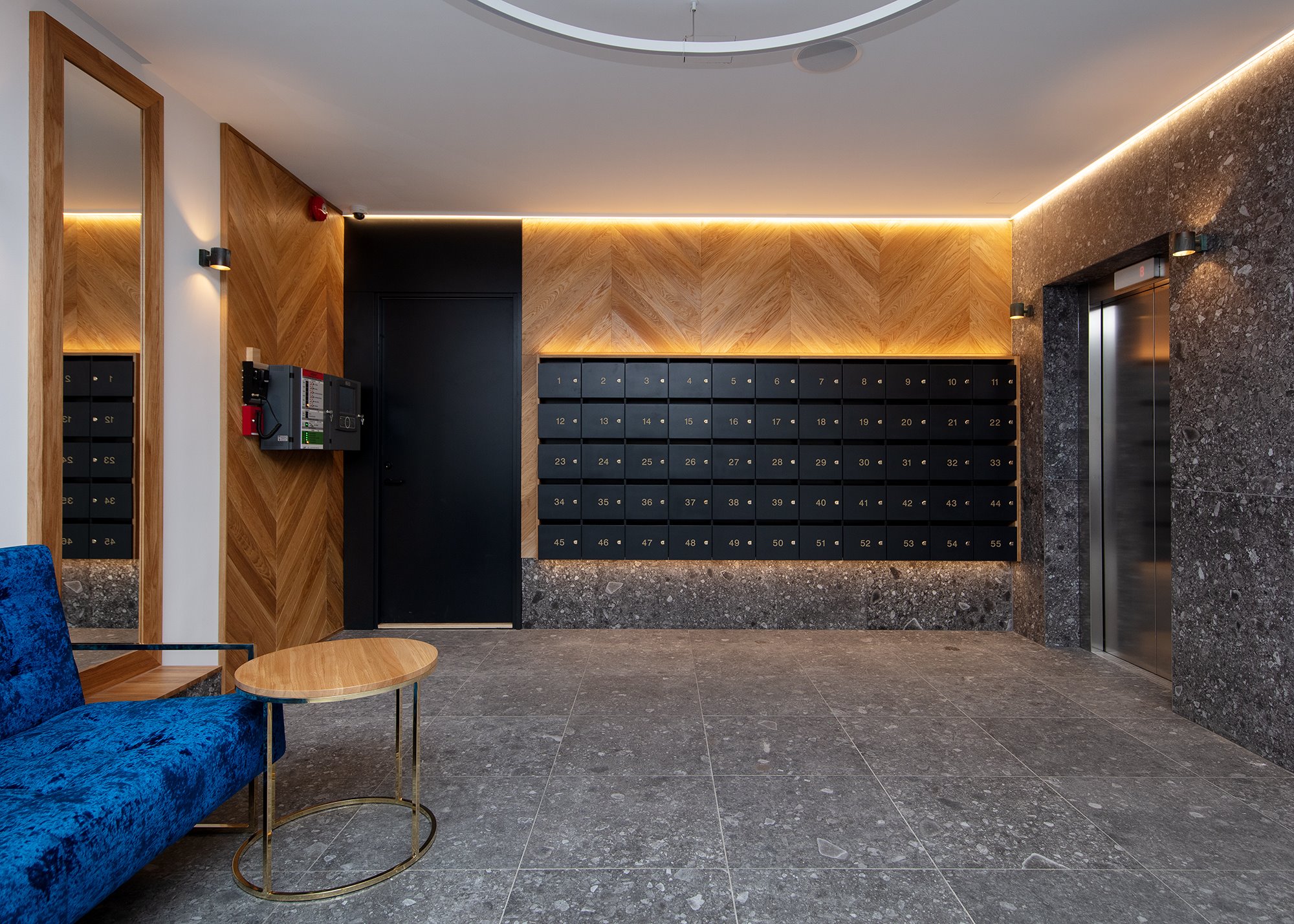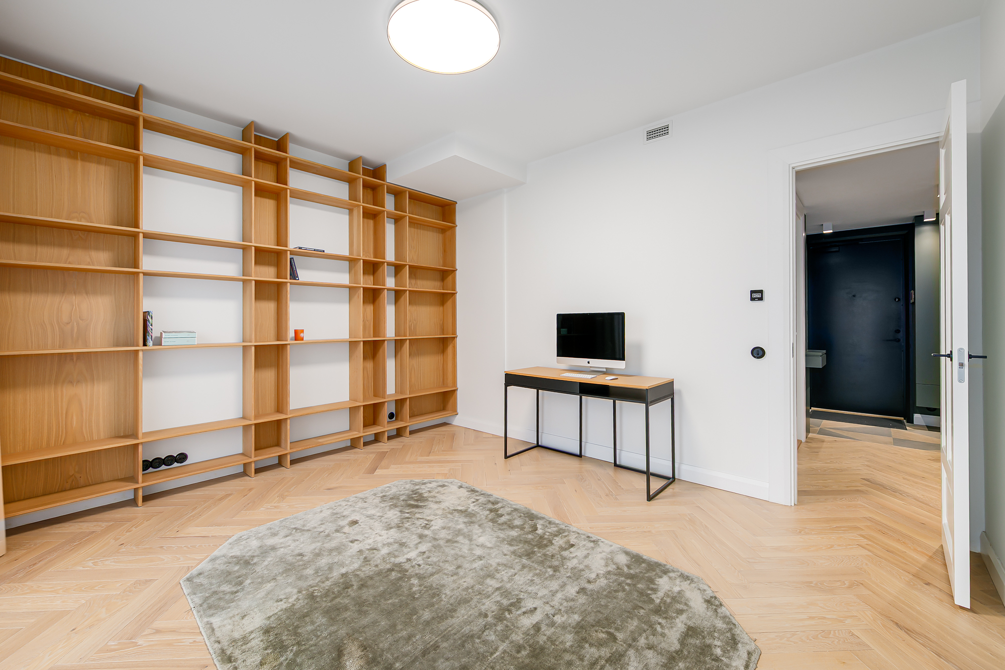 Korteri siseviimistlus on inspireeritud Art Deco elegantsist: põrandaid katab naturaalne tamme kalasabaparkett, kõrged profiiliga siseuksed ja eksklusiivselt viimistletud sanitaarruumid annavad kodule luksusliku iseloomu. Aknad on maast laeni puitalumiiniumprofiiliga, tuues tuppa rohkelt valgust. Interjööris kohtuvad modernsed lahendused ja ajatu disain, mida toetavad rahulik värvigamma ja kvaliteetsed materjalid.
