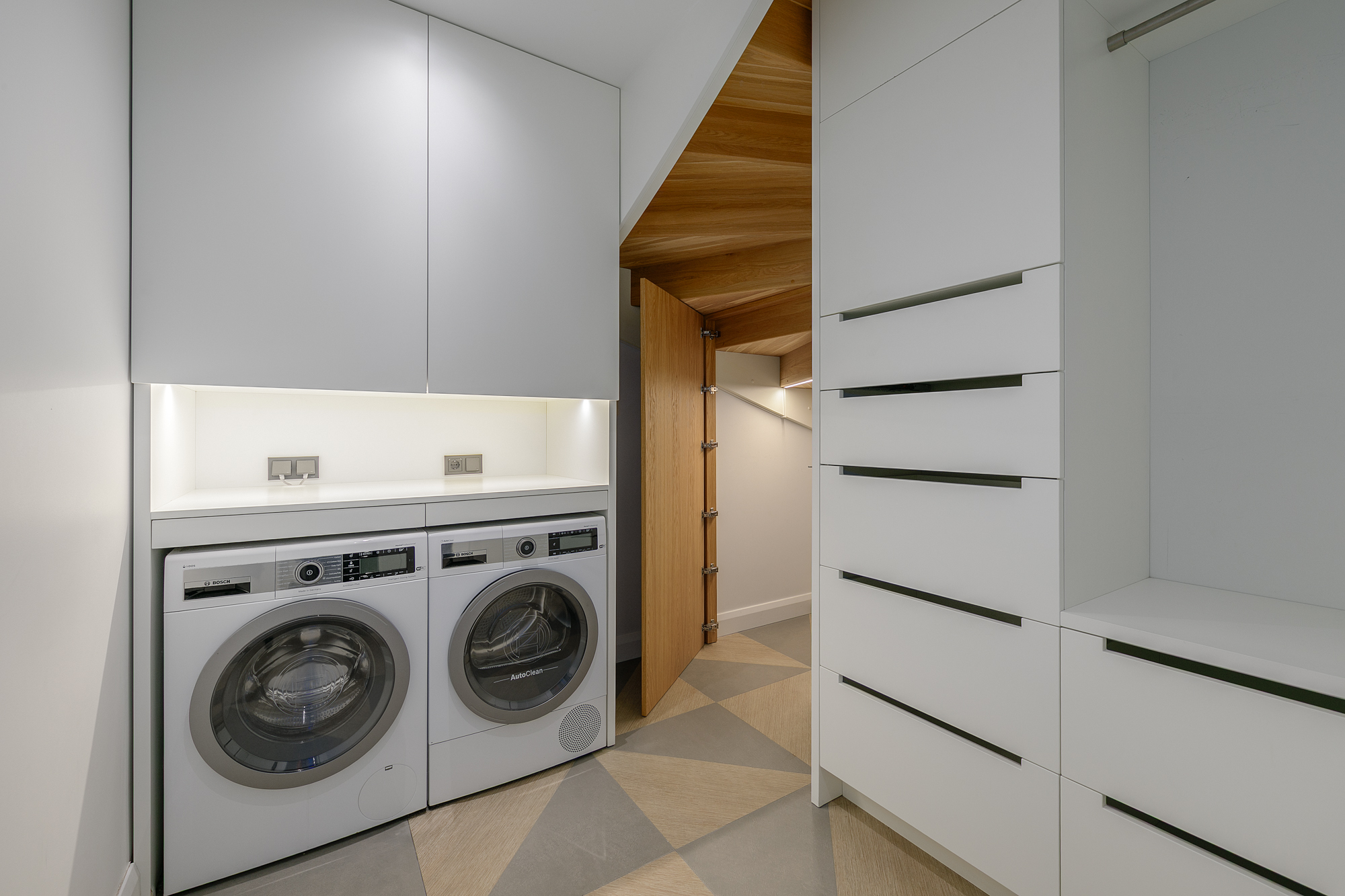 Funktsionaalsesse kööki on integreeritud Bosch köögitehnika: nõudepesumasin, keraamiline pliit, praeahi, külmkapp sügavkülmaga ja kubu.
