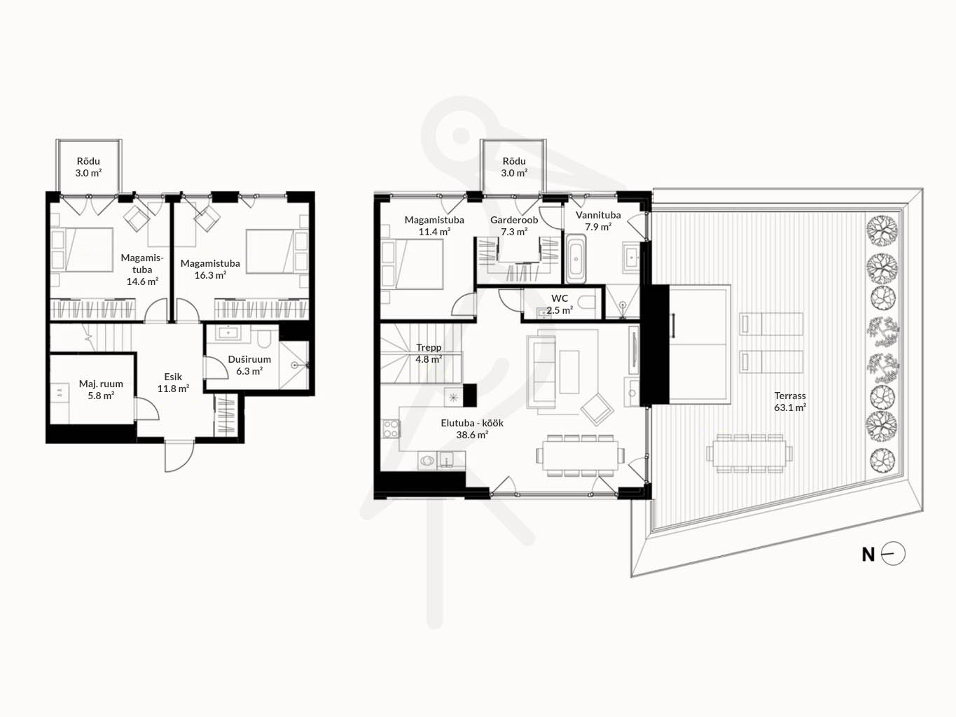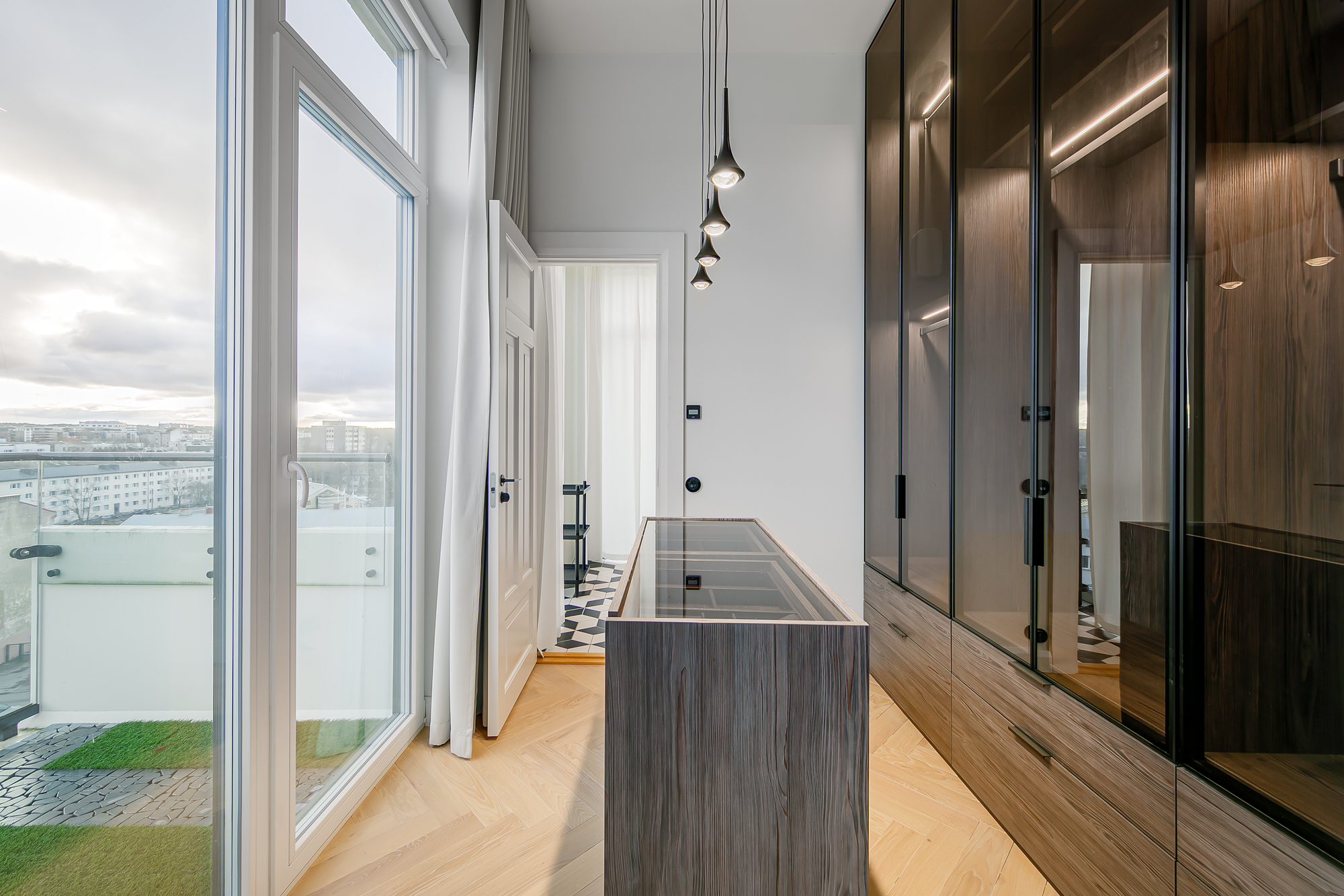 Kahe tasapinnaga korter asub hoone kaheksandal ja üheksandal korrusel. Ülemisel korrusel paiknevad valgusküllane elutuba, köök ja peamine magamistuba, mille lae kõrgus ulatub 3,4 meetrini. Siit pääseb ka avarale privaatterrassile, kust avanevad lummavad linnavaated ja kuhu paistab päike hommikust õhtuni. Terrass sobib suurepäraselt nii lõõgastumiseks kui ka rohenäppudele, sest olemas on taimekastid, kuhu saab kasvama panna oma lemmikud.
