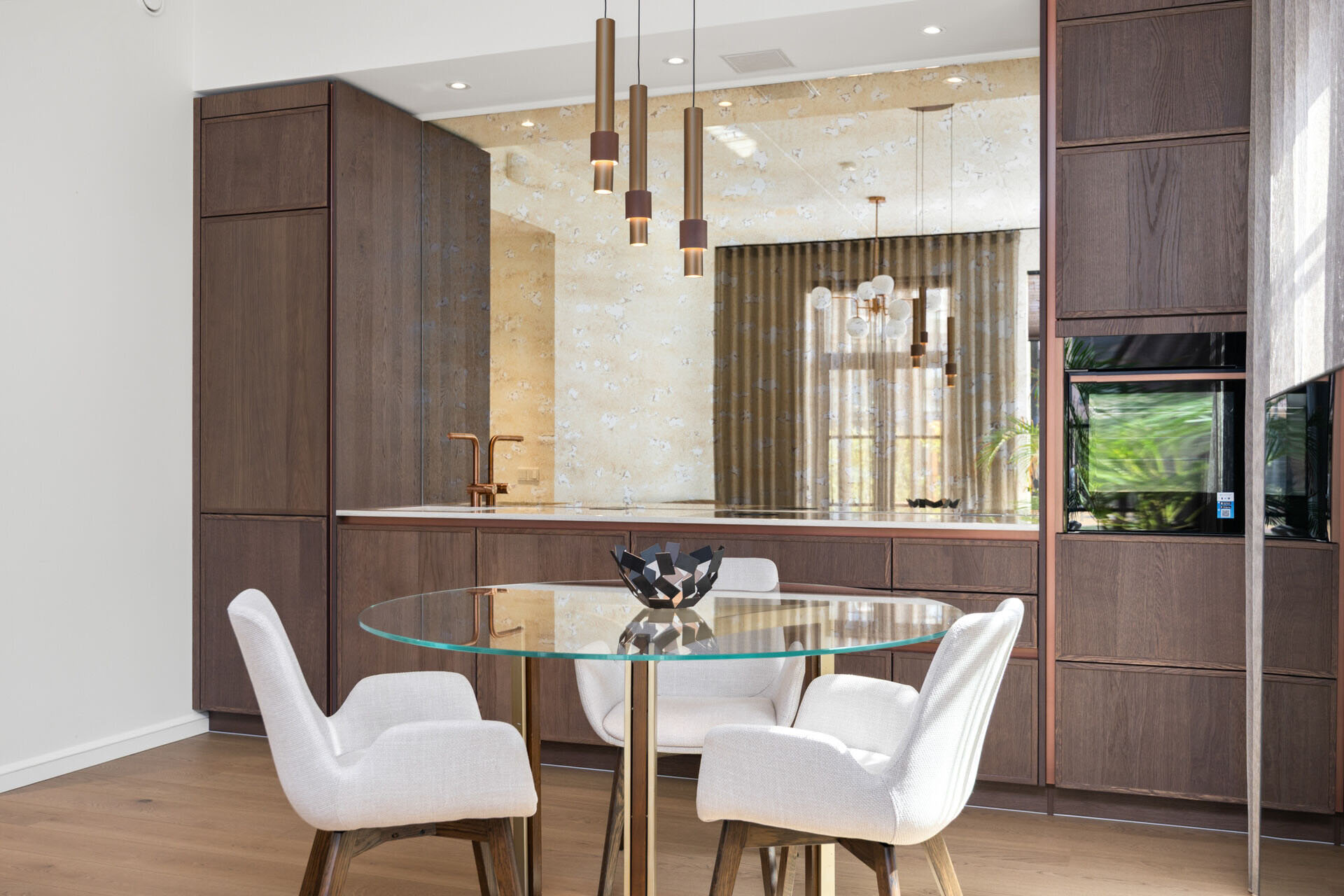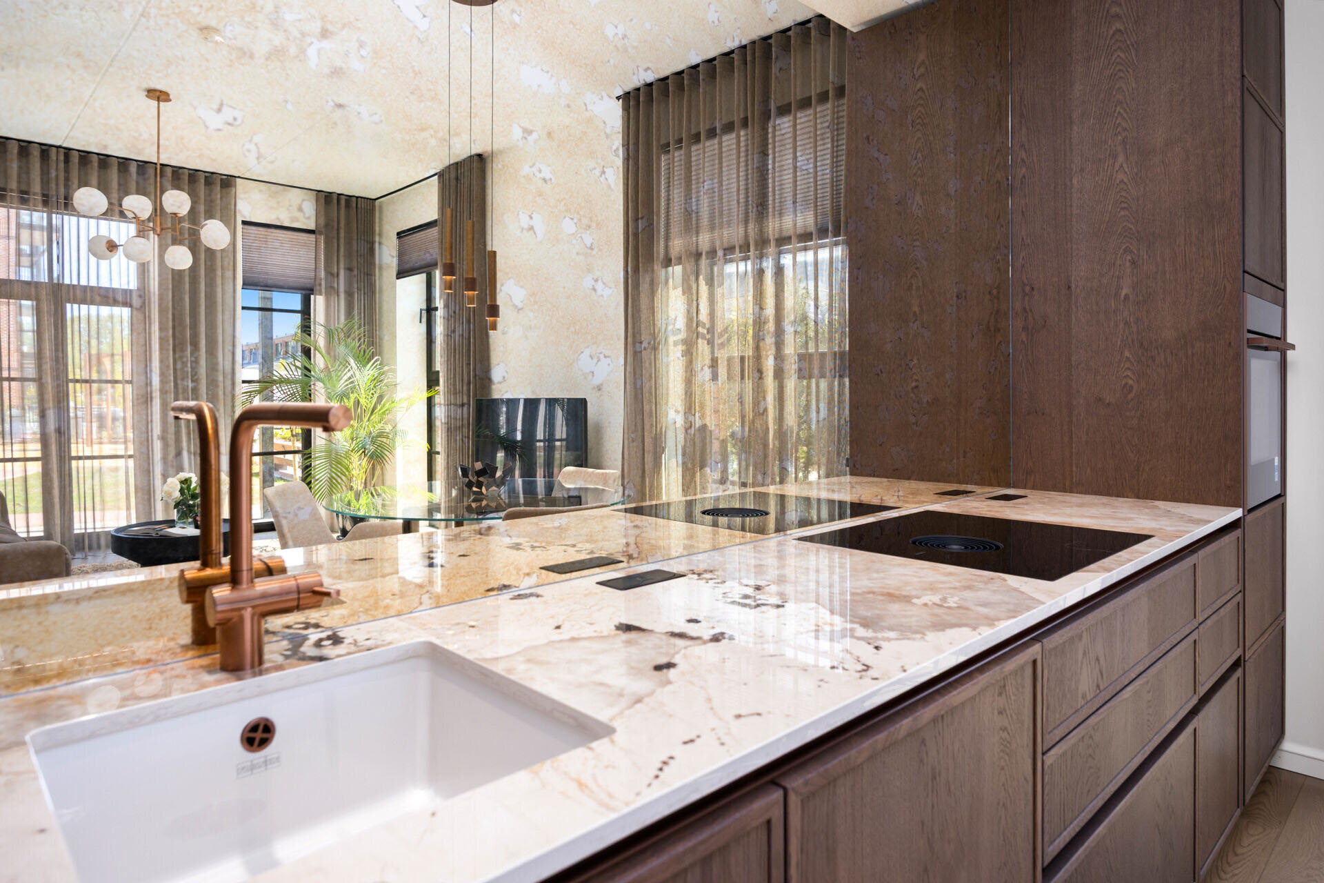 Köögis on eritellimusel valminud köögimööbel, mis on ühtaegu funktsionaalne ja esteetiline. Kasutatud on kõrgekvaliteedilisi materjale ning ajatu disainiga kaasaegset Scmidt kodutehnikat: integreeritud nõudepesumasin, toiduahi, induktsioonpliit ning külmkapp koos sügavkülmikuga.