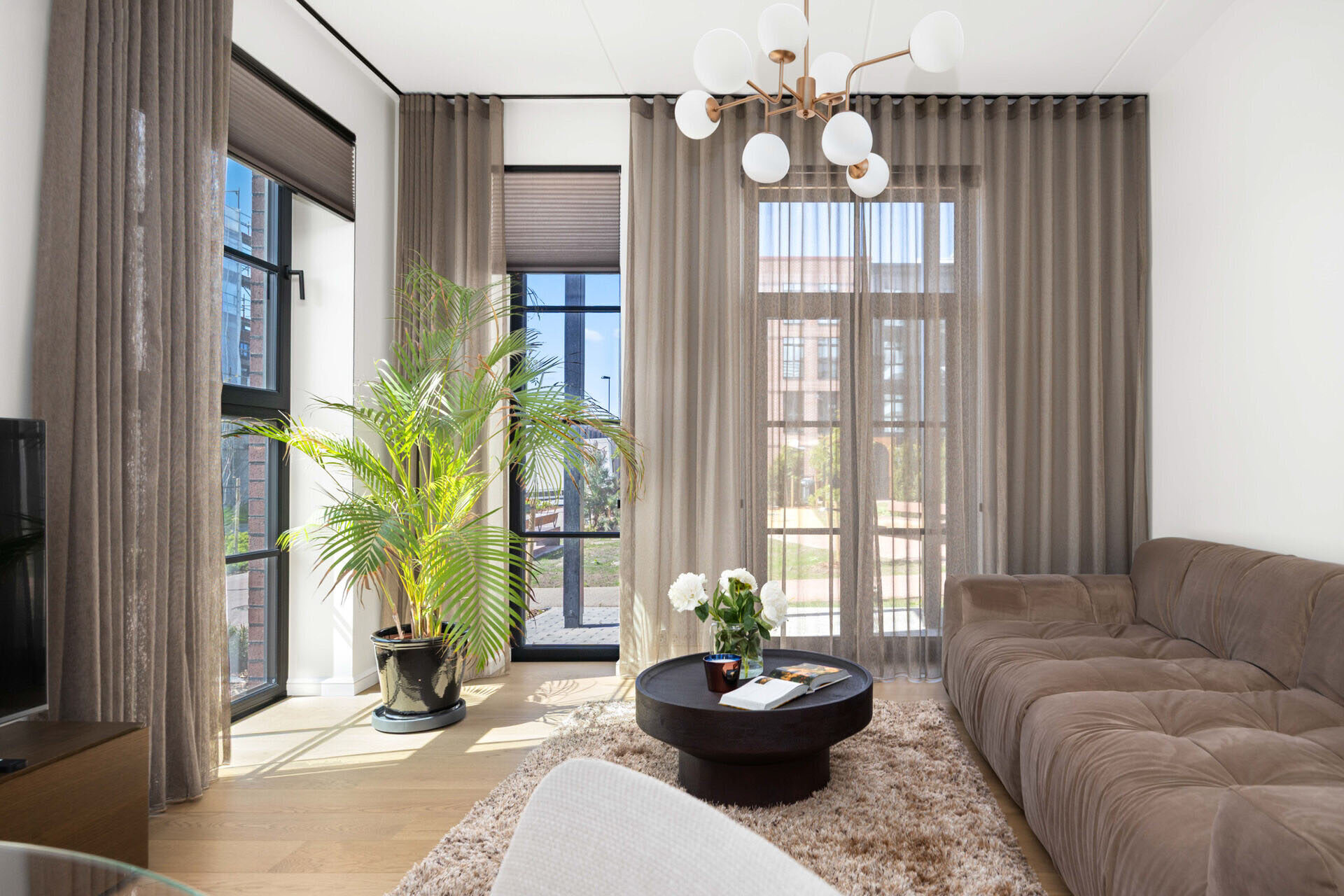 Köögis ja elutoas on puldiga juhitavad kardinad, mis lisavad mugavust ja tagavad privaatsuse.