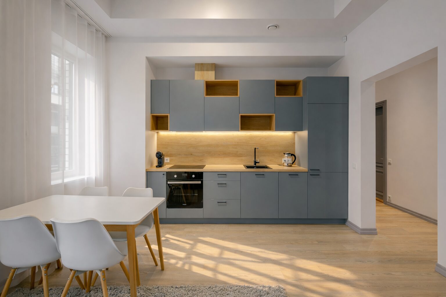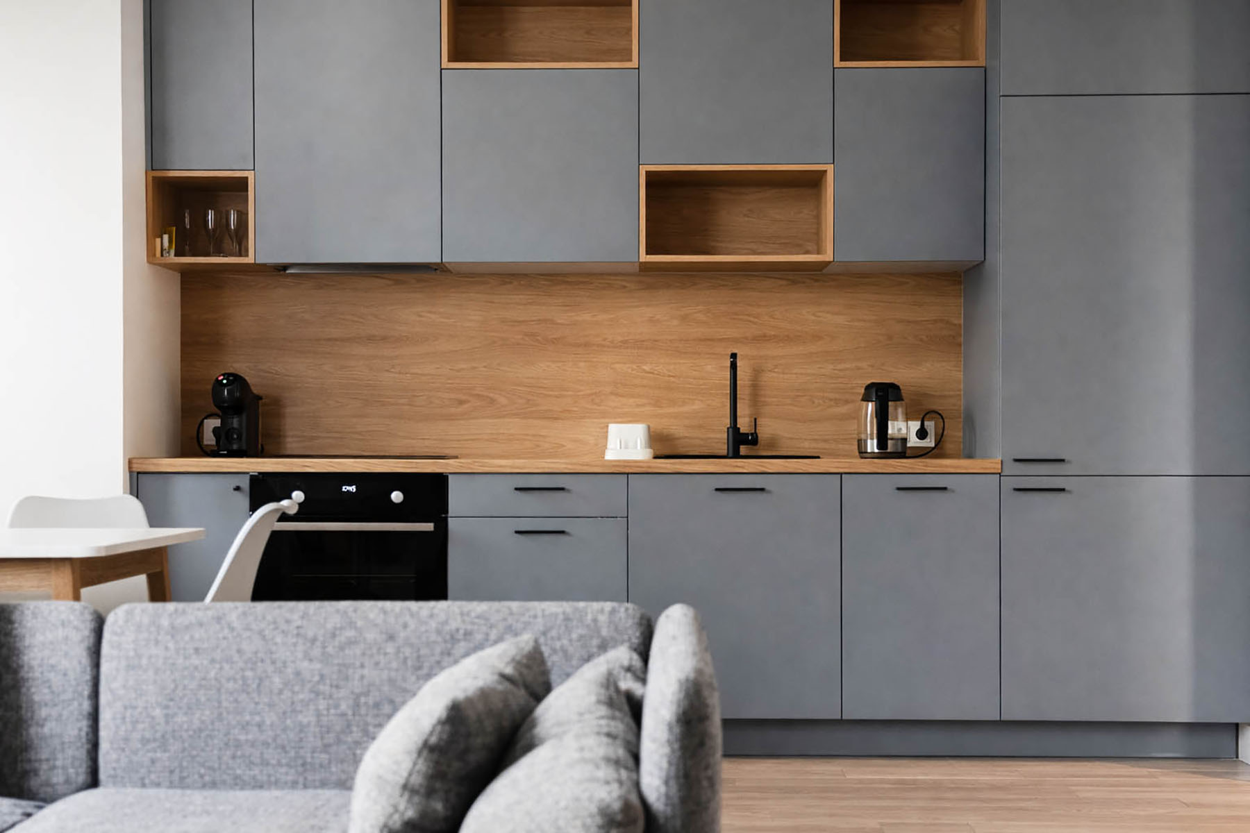 Köögis on eritellimusel valminud köögimööbel, mis on ühtaegu nii kvaliteetne kui ka funktsionaalne, kuna kasutatud on kõrgeima kvaliteedi materjale ning ajatu disainiga moodsaid kodumasinad.