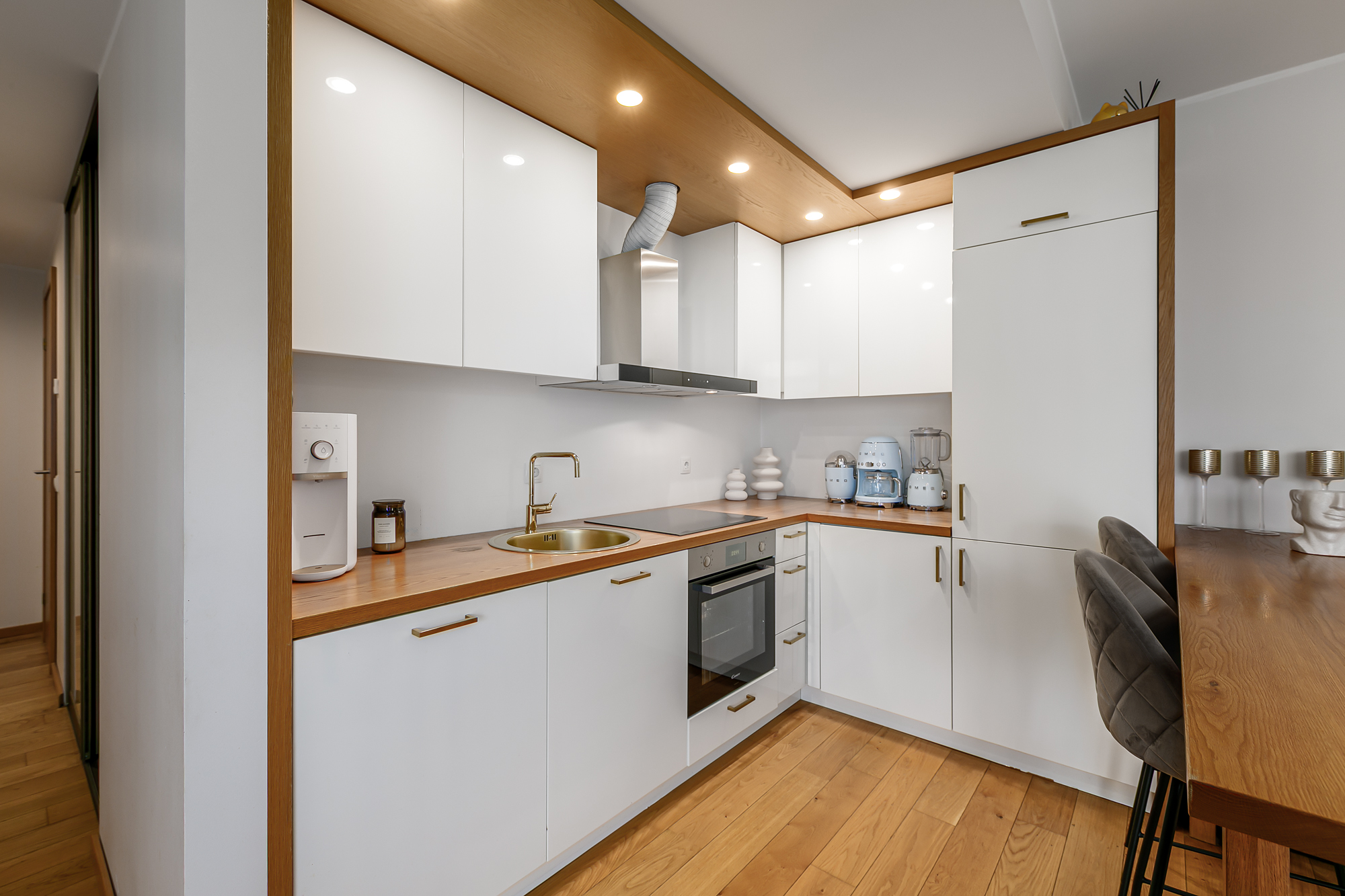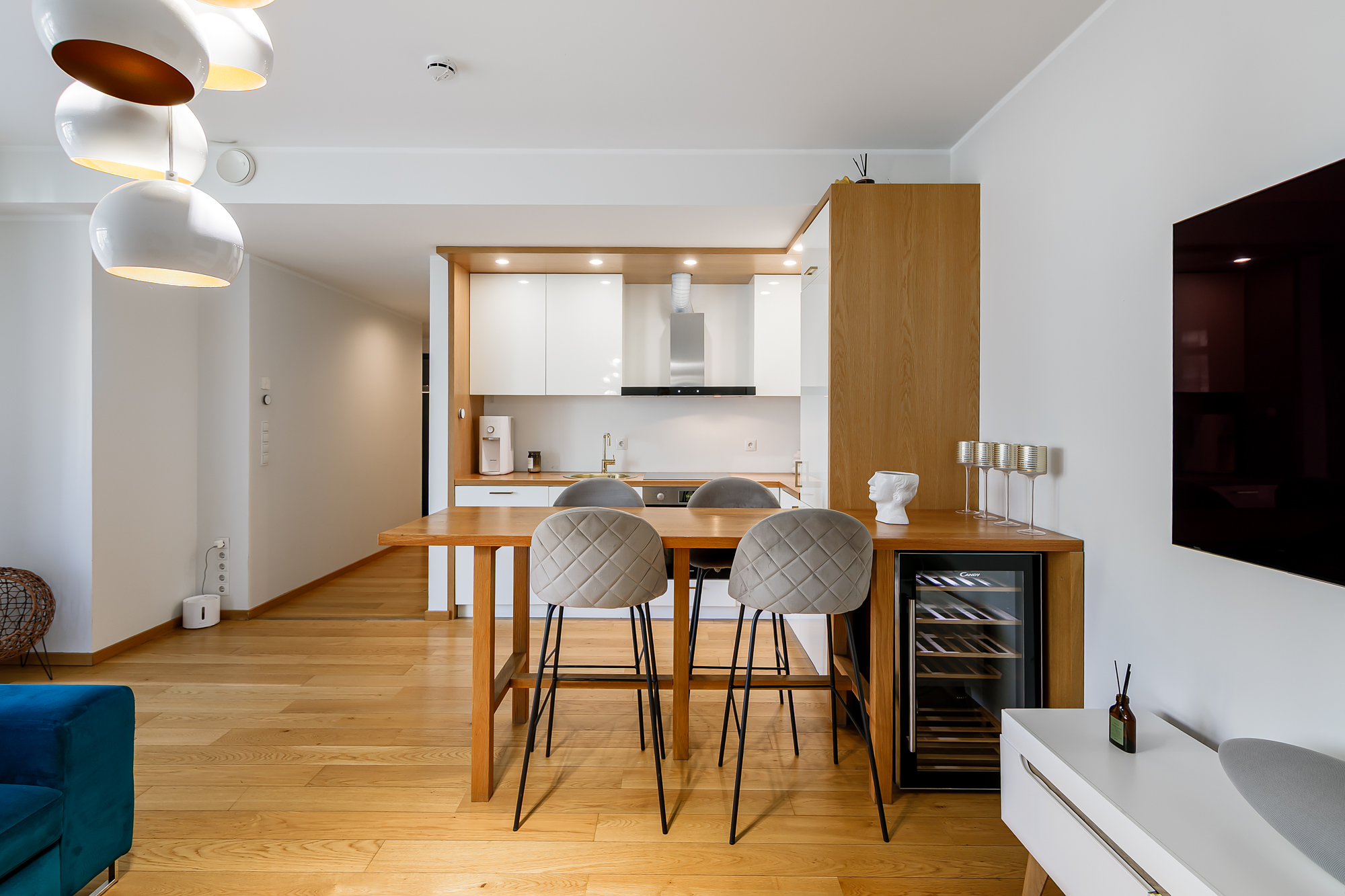 Funktsionaalsesse köögimööblisse on integreeritud kvaliteetne köögitehnika: külmkapp koos sügavkülmikuga, toiduahi, induktsioonpliit, kubu, nõudepesumasin ning lisaks veinikülmik.