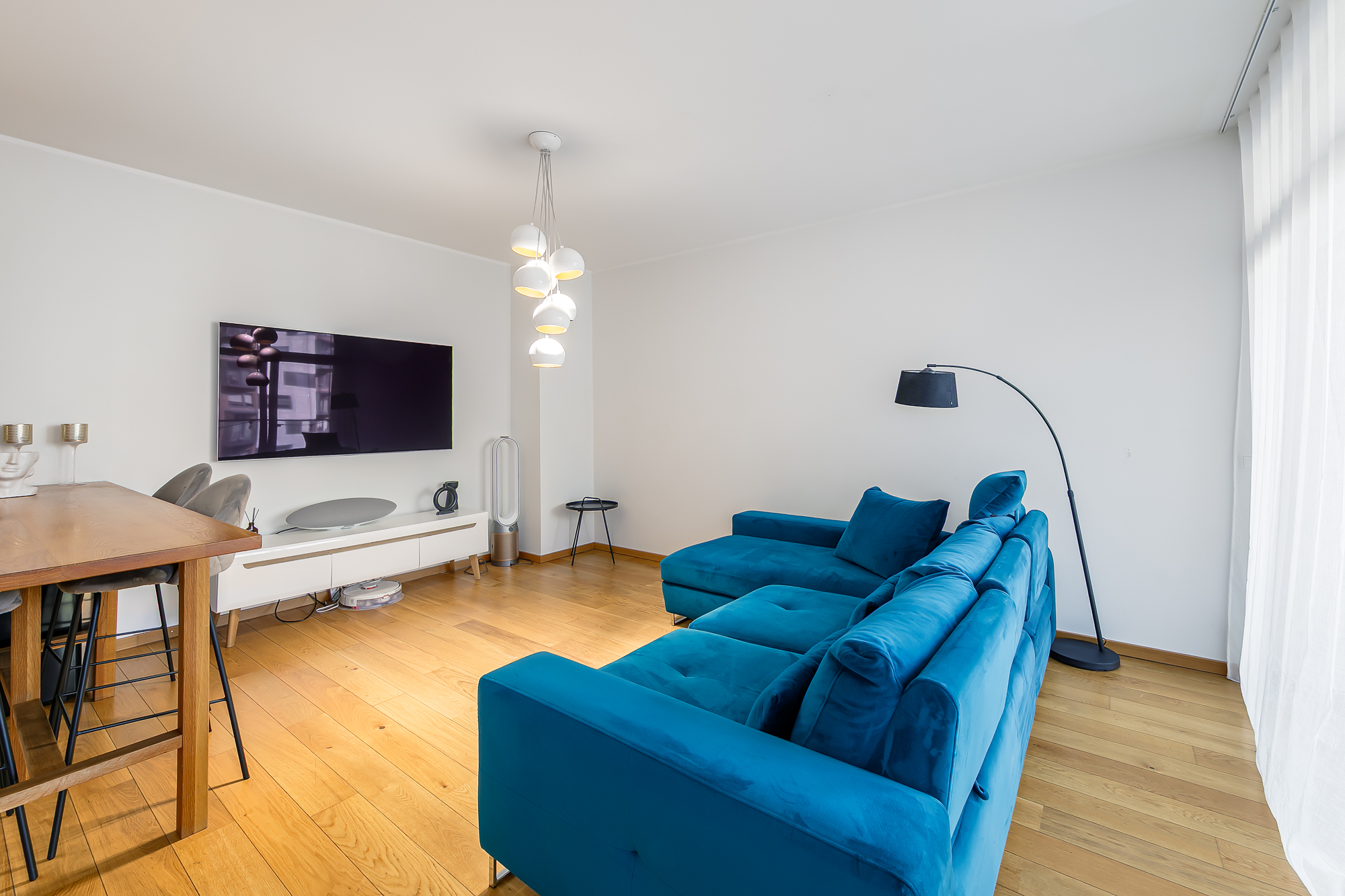Elutoas on söögilaud, mugav nurgadiivan, telerialus ning 65-tolline televiisor.