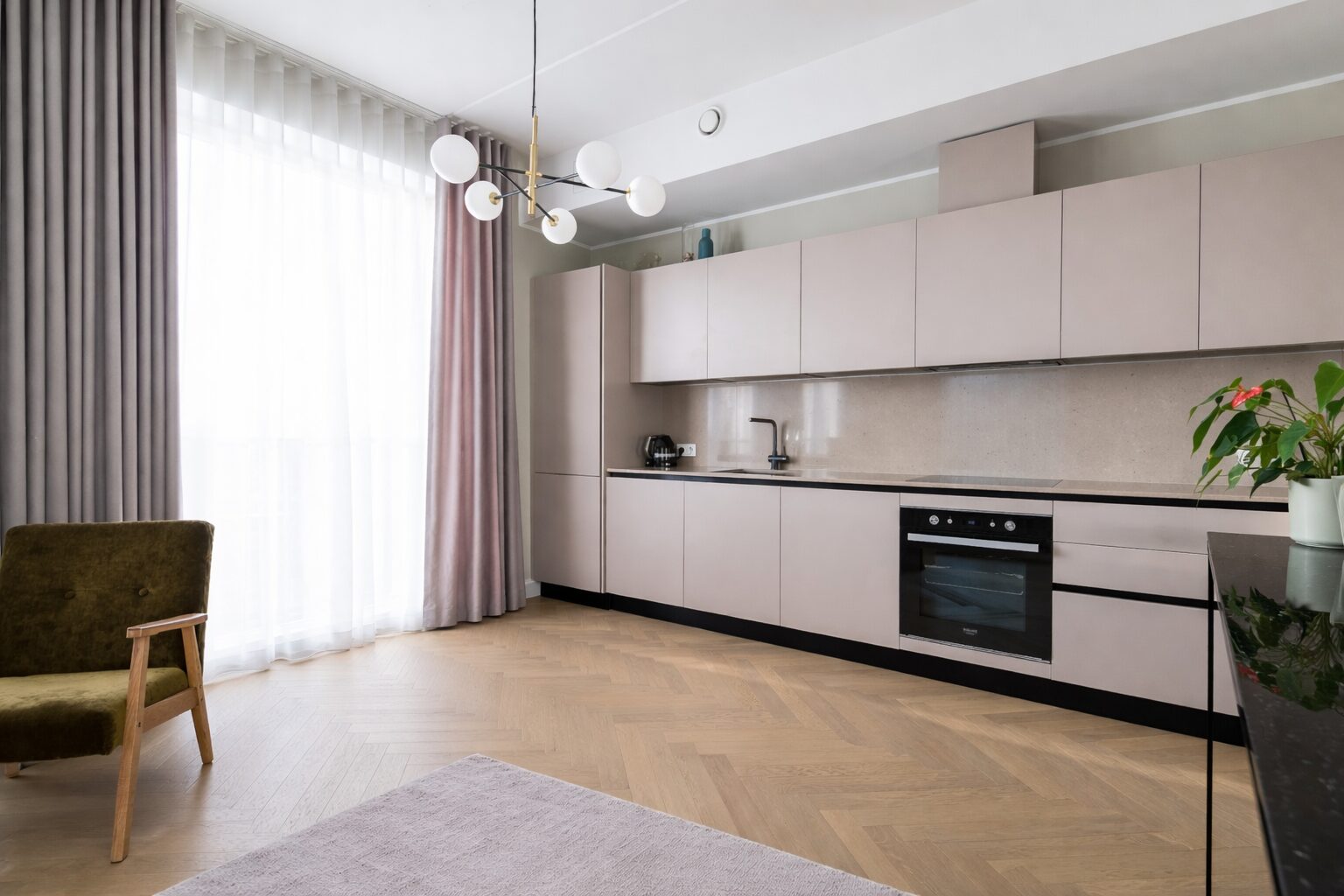 Köögis on eritellimusel valminud köögimööbel, mis on ühtaegu nii kvaliteetne kui ka funktsionaalne, kuna kasutatud on kõrgeima kvaliteedi materjale ning ajatu disainiga moodsaid kodumasinad.