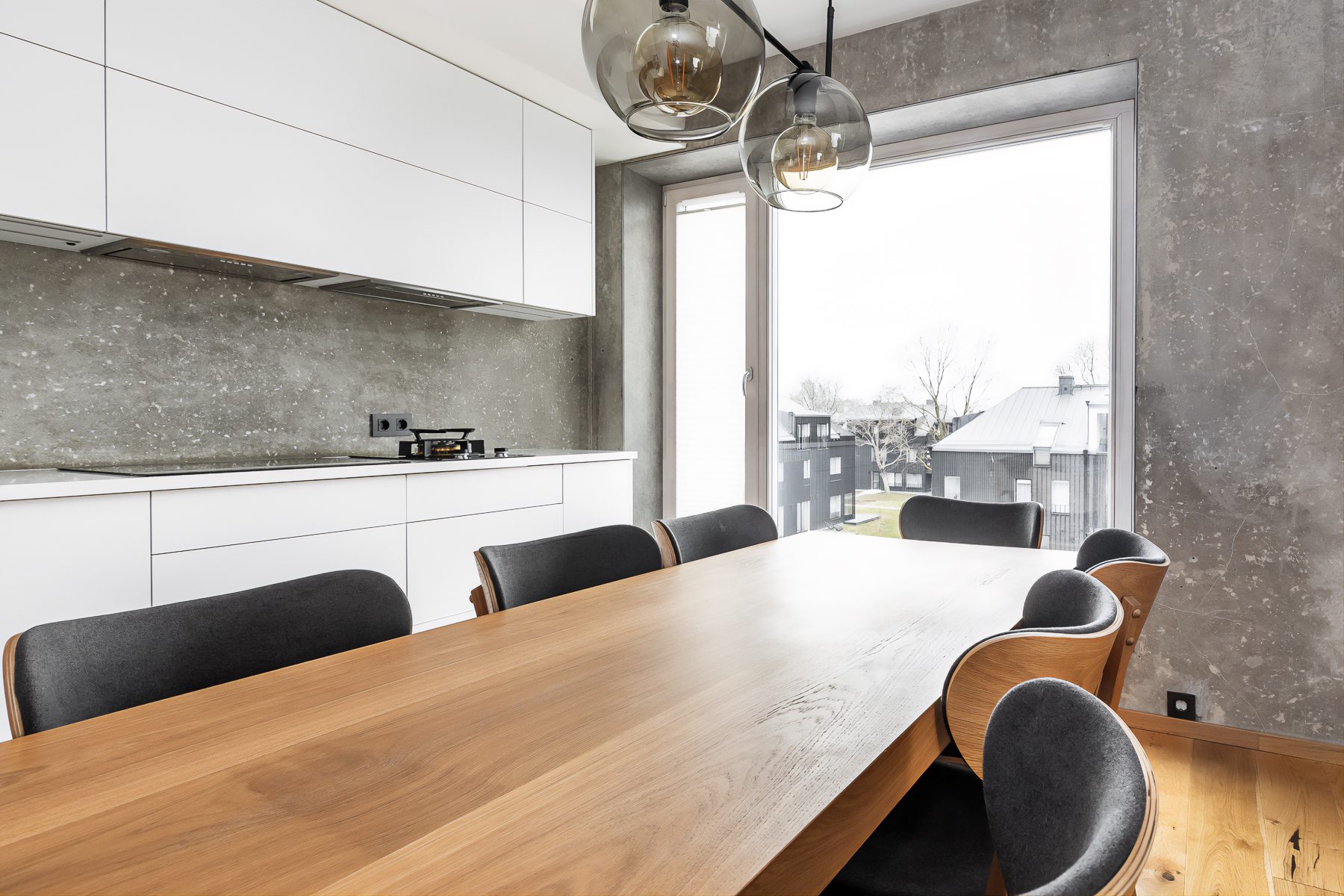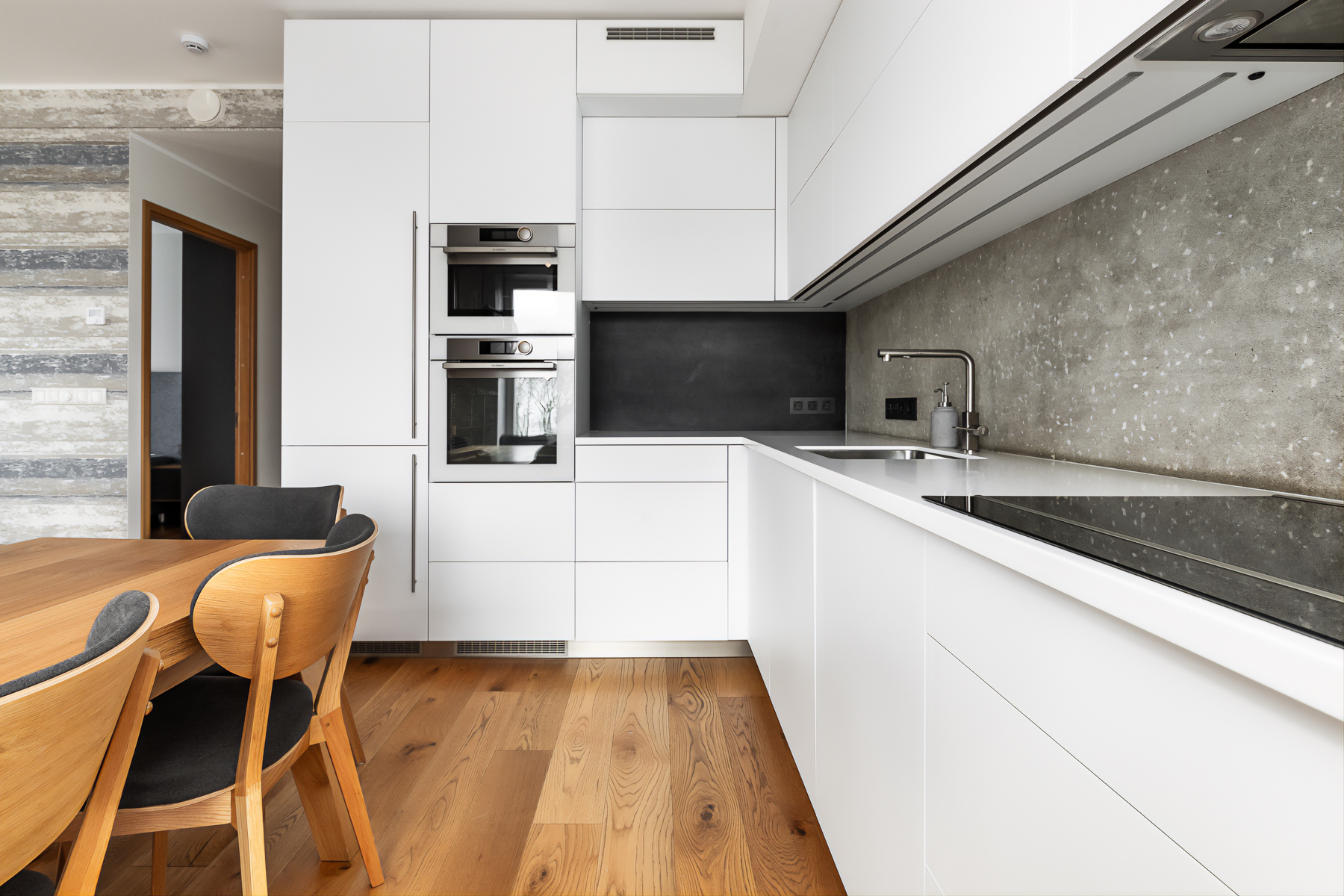 Funktsionaalsesse köögimööblisse on integreeritud kvaliteetne De Dietrich köögitehnika: gaasipliit, induktsioonpliit, ahi, mikrolaineahi. Lisaks Electrolux nõudepesumasin ja Whirlpool külmik