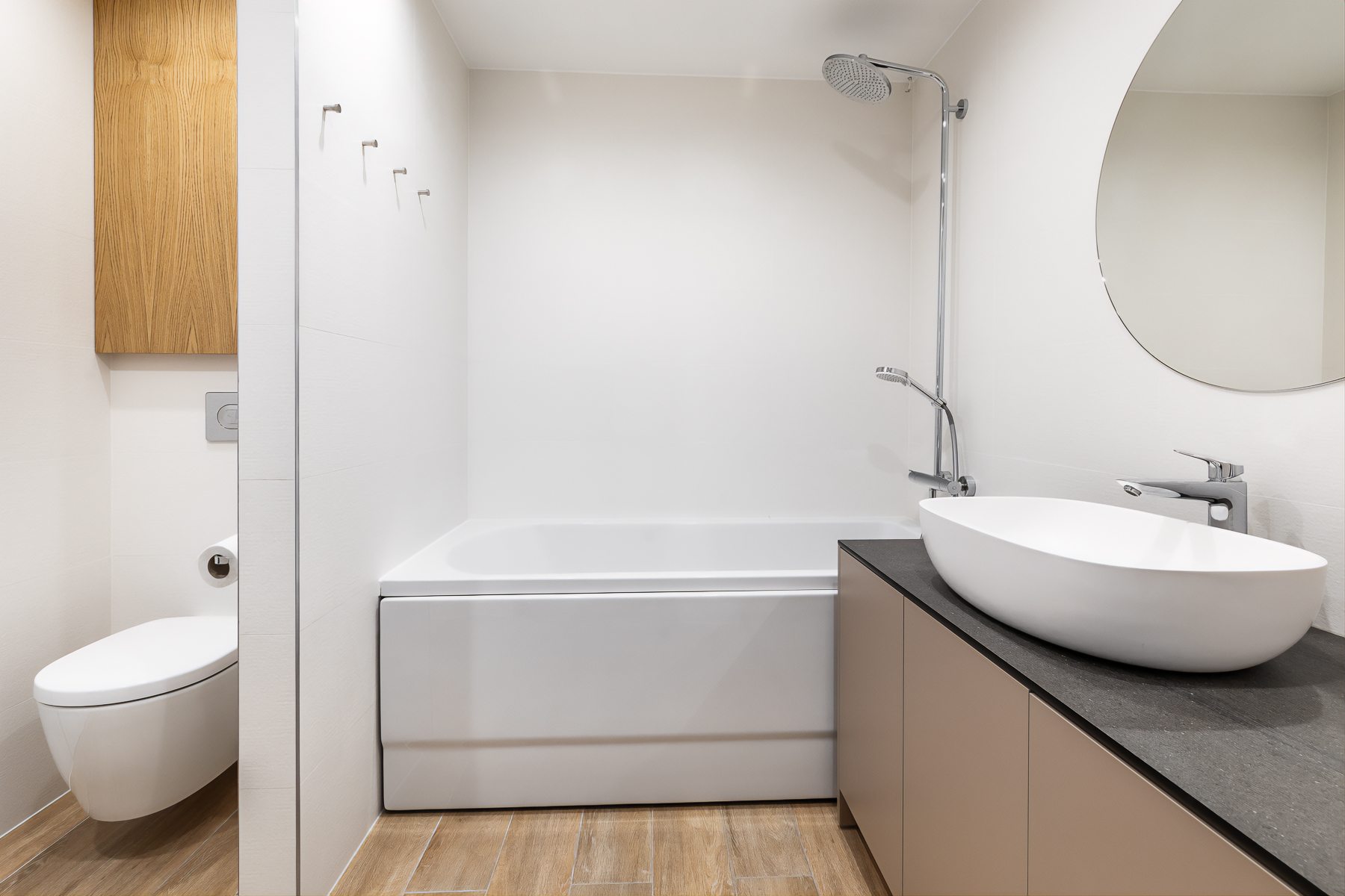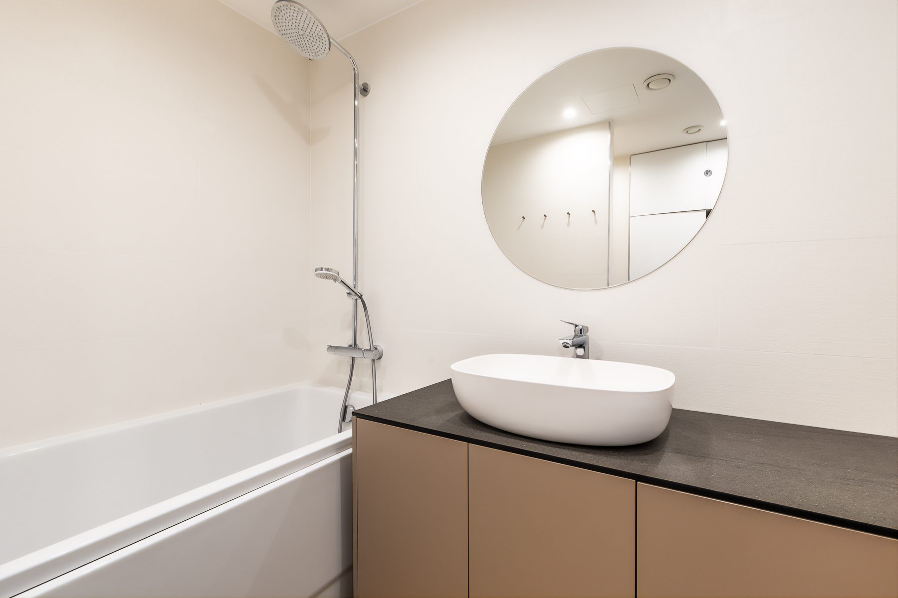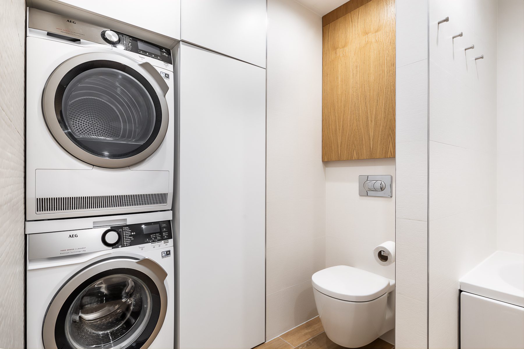 Lisaks on vannitoas olemasolevale Hansgrohe sanitaartehnikale ning vannitoamööblile ka AEG pesumasin ja kuivati.